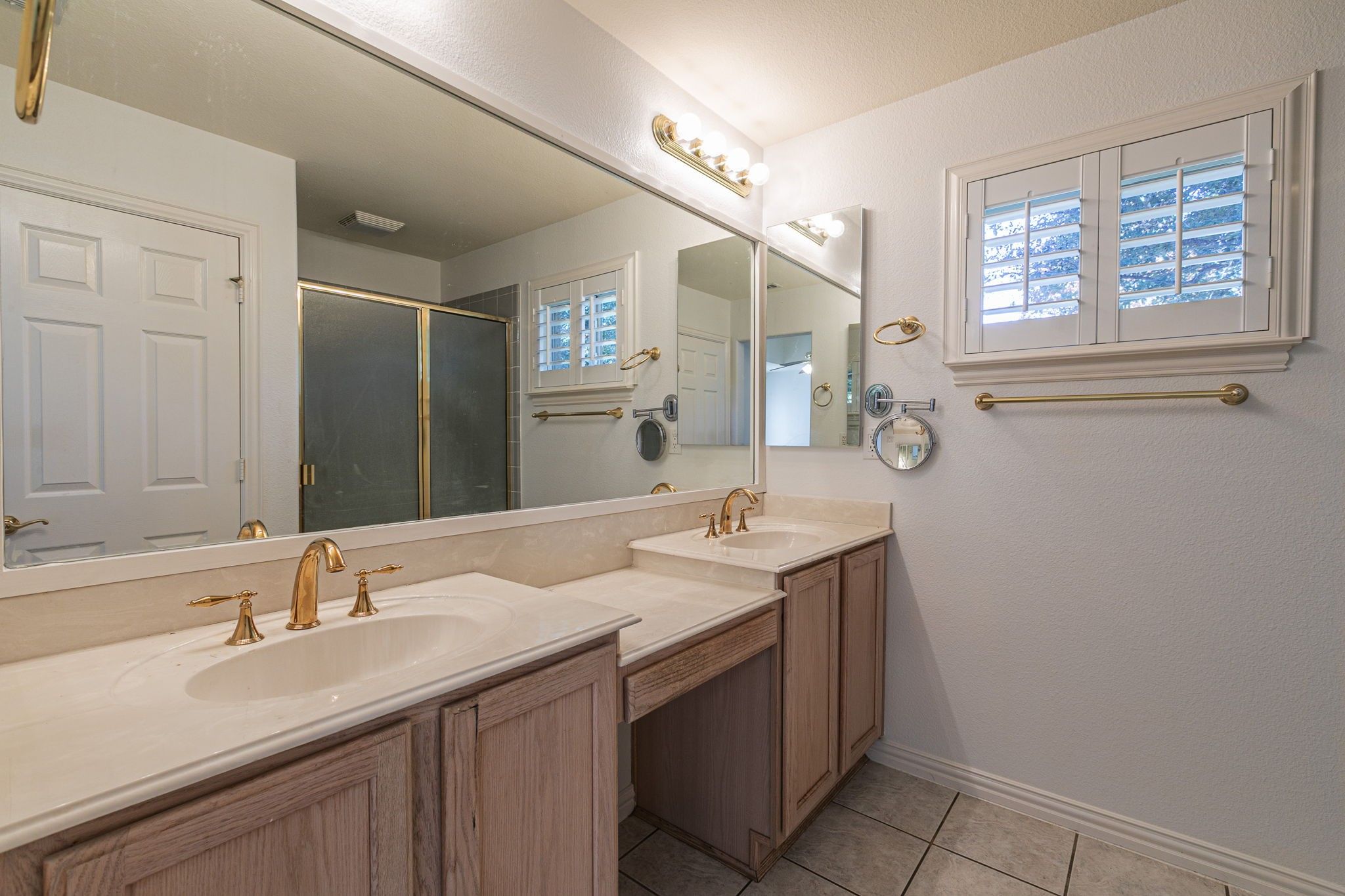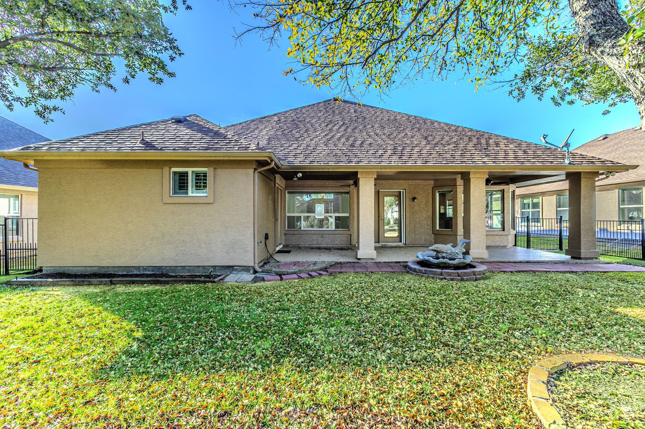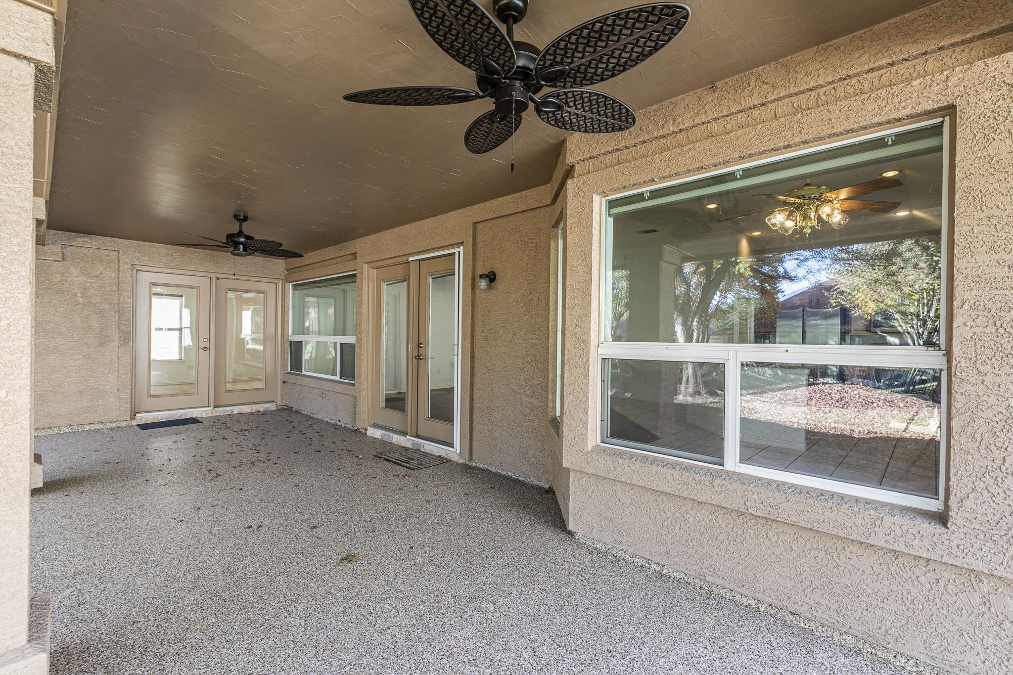 Precious home is move-in ready! Situated in a quiet area of Robson Ranch, renowned for its adult community lifestyle: championship golf, tennis and pickleball complex, fitness center, walking paths, an arts & technology center, a massive clubhouse, and an impressive array of scheduled activities for a variety of interests. Two bedrooms plus a 2nd living or office area - also ideal for a studio or exercise room. Beautiful extended covered back patio with ceiling fans give you relaxing space and lovely views. Open living - dining - kitchen areas and a wall of windows all across the back of the home. The kitchen features granite counters, an island with breakfast bar, electric range, microwave, dishwasher, dispoal and refrigerator - all stainless appliances. An adjacent utility room leads to the roomy garage with sink for outdoor cleanup! Primary bedroom has a private exit to the back patio and includes a recessed ceiling with fan, walk-in closet, and ensuite bathroom with walk-in shower and dual vanities. Hard floors throughout except primary bedroom; plantation shutters; landscaping.