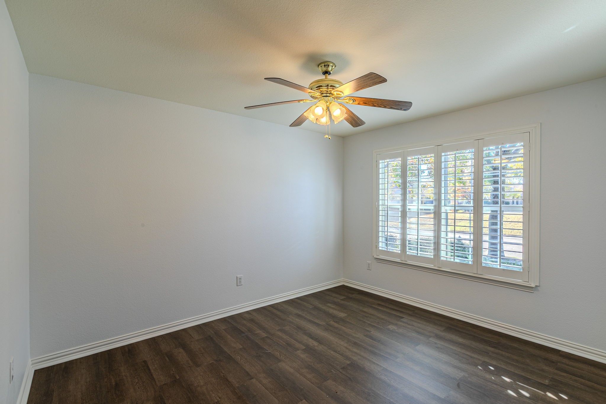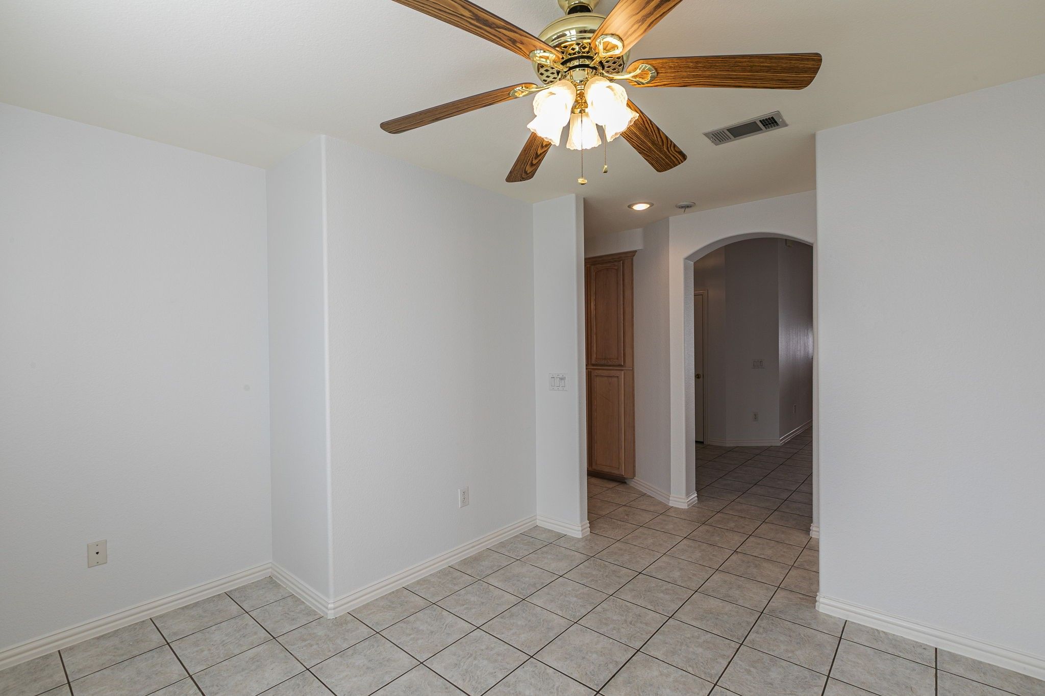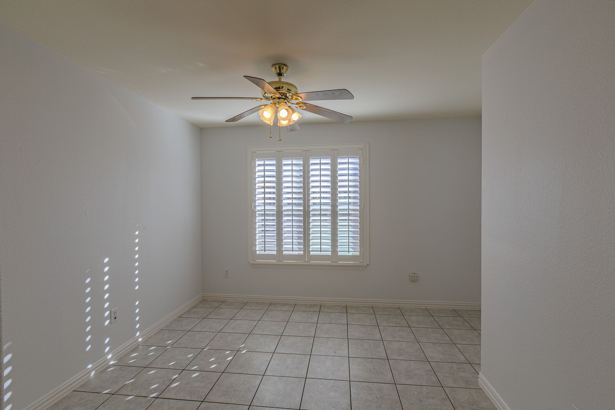 Precious home is move-in ready! Situated in a quiet area of Robson Ranch, renowned for its adult community lifestyle: championship golf, tennis and pickleball complex, fitness center, walking paths, an arts & technology center, a massive clubhouse, and an impressive array of scheduled activities for a variety of interests. Two bedrooms plus a 2nd living or office area - also ideal for a studio or exercise room. Beautiful extended covered back patio with ceiling fans give you relaxing space and lovely views. Open living - dining - kitchen areas and a wall of windows all across the back of the home. The kitchen features granite counters, an island with breakfast bar, electric range, microwave, dishwasher, dispoal and refrigerator - all stainless appliances. An adjacent utility room leads to the roomy garage with sink for outdoor cleanup! Primary bedroom has a private exit to the back patio and includes a recessed ceiling with fan, walk-in closet, and ensuite bathroom with walk-in shower and dual vanities. Hard floors throughout except primary bedroom; plantation shutters; landscaping.