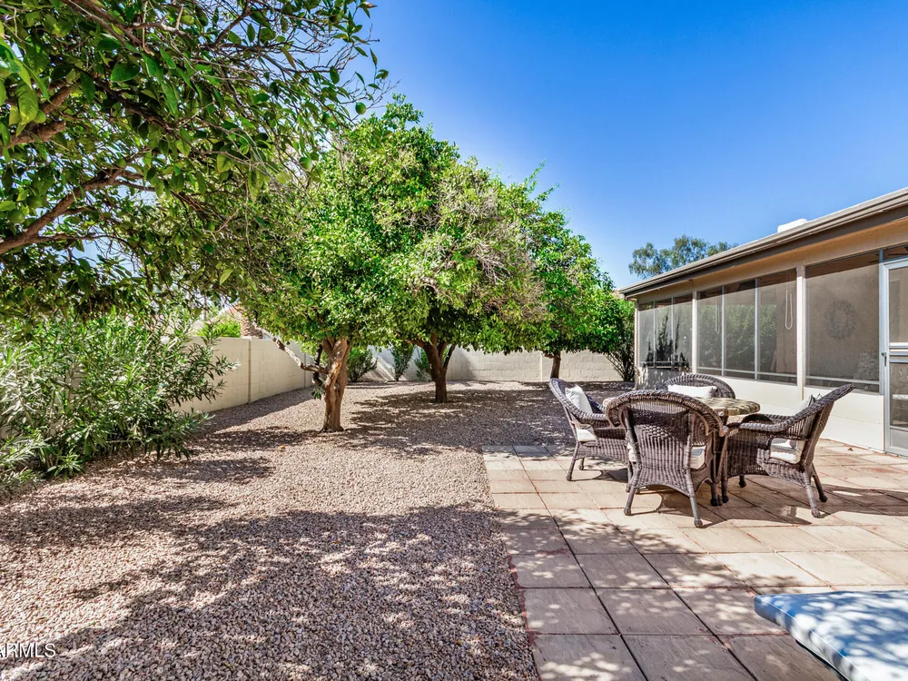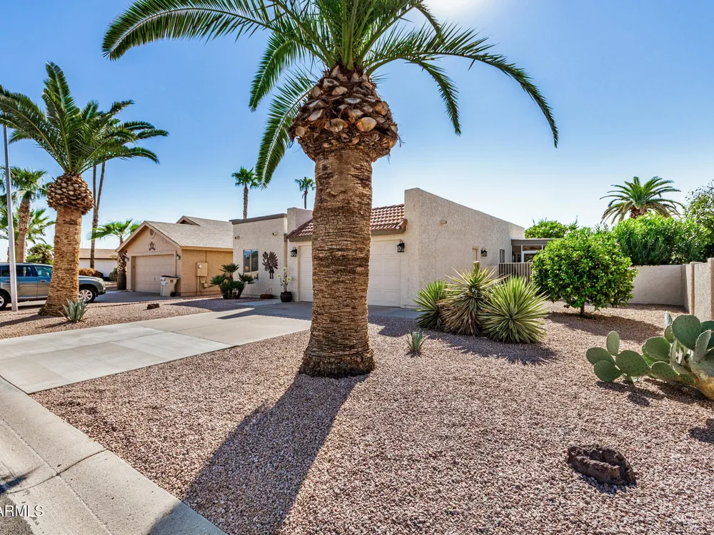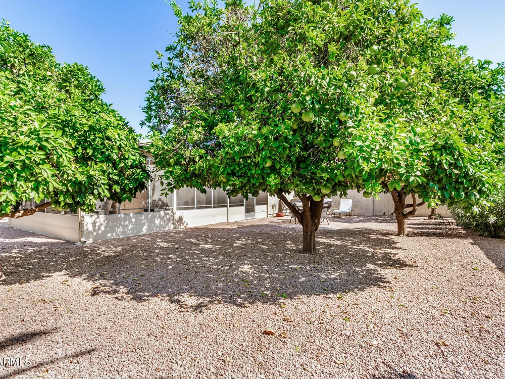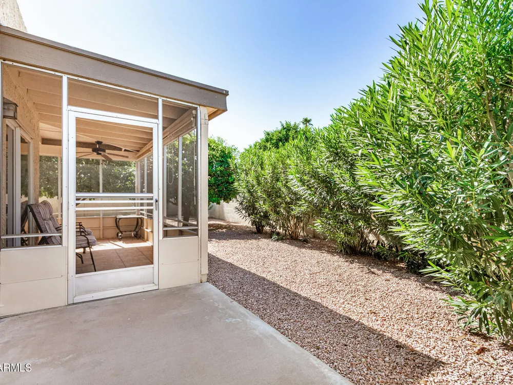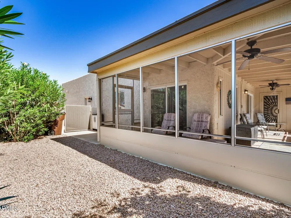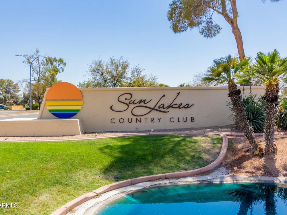 Say hello to your next happy place! Inside, you'll be greeted by cozy carpet and tile floors in all the right spots, plus a living room ideal for movie nights. Kitchen is bright & includes plenty of counter space for your culinary masterpieces. Retreat to your main bedroom with a sitting nook perfect for curling up with a book, and an easy to walk in shower in bathroom. The bright wrap around Arizona room is your go-to spot for morning coffee or evening cocktails. Fire up the grill for backyard barbecues or kick back and stargaze under desert skies. Bonus: the community brings the fun with a sparkling pool, water features, tennis. golf, club house and more. In Sun Lakes, your golf cart can take you to bank, store or lunch with friends- all just minutes away! See walk through video! The owner has thoughtfully improved this home with both functional and cosmetic updates. Recent upgrades include a new washer, dryer, refrigerator, and a fully updated master shower with a new drain. The exterior was painted in 2023, and a flat roof was recoated as well. Inside, a reverse osmosis system was added, along with new epoxy in the garage and front entry, overhead garage storage, and a completed garage conversion. Additional improvements include an office space in the master suite that can easily be removed if desired, regular annual HVAC servicing, and the fact that the home has only been lived in during the cooler months. Sun screens were removed from the front bedroom and kitchen but can be added back. The backyard includes several orange trees and three different grapefruit varieties, offering both beauty and fresh citrus right at home. This fantastic space is further enhanced with attention to detail and ongoing maintenance, making it both move-in ready and highly desirable.