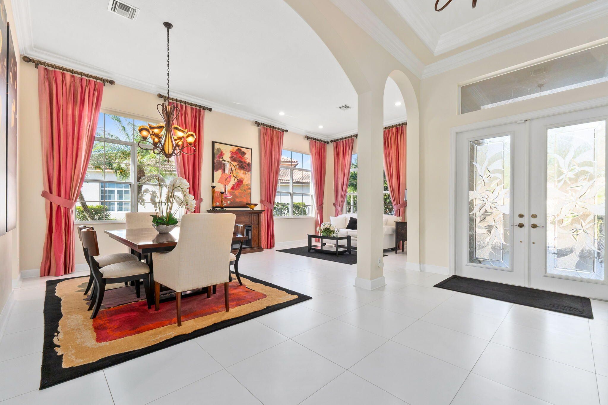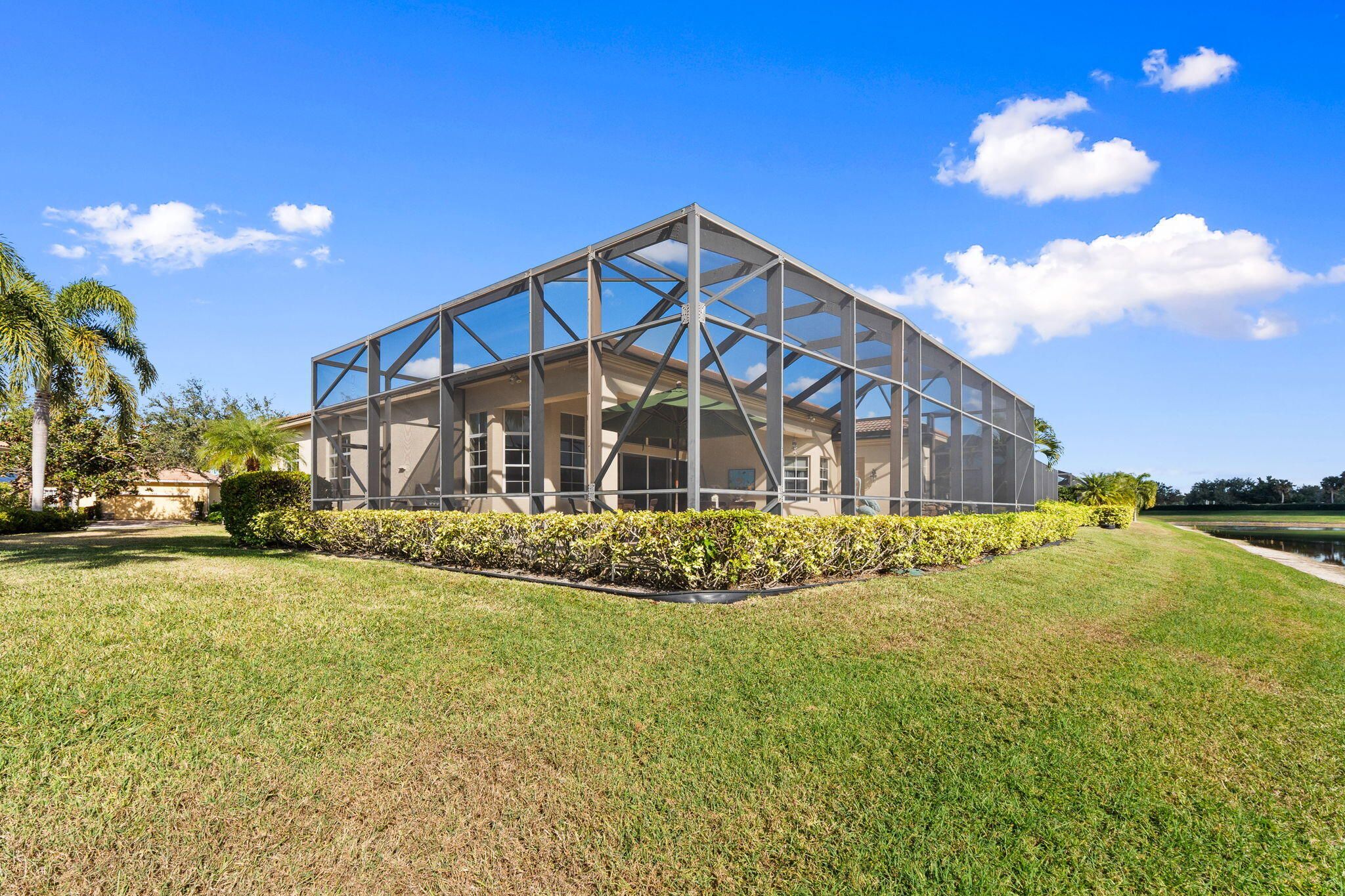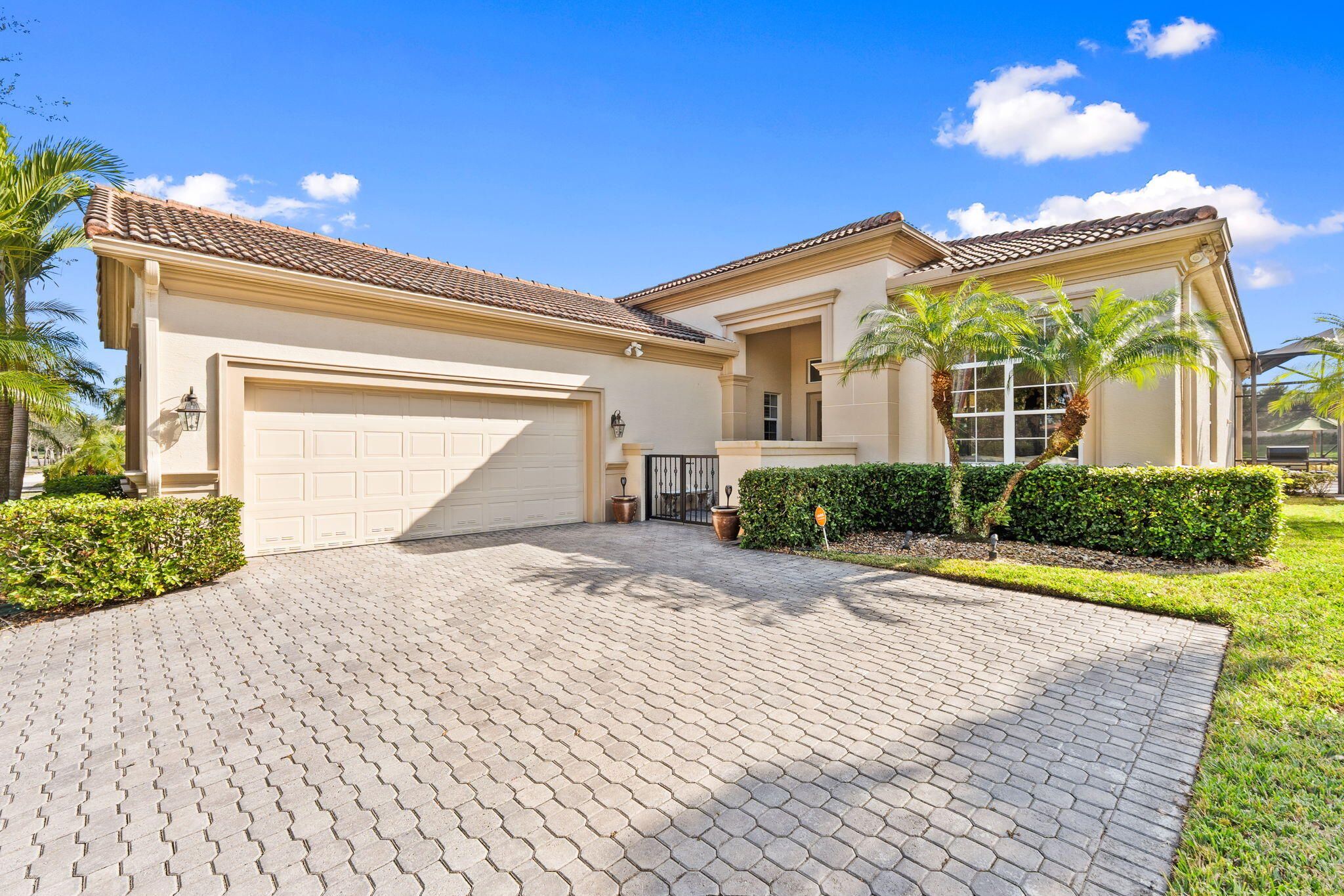 Experience resort style living in PGA Village Verano in this beautifully appointed 3-bedroom, 4-bathroom residence, ideally located on a quiet street with no rear neighbors and tranquil lakefront views. Enjoy serene lakefront views from the expansive screened lanai overlooking the pool. A gated courtyard entry and double glass front doors welcome you into a light-filled interior featuring 12-foot ceilings, tile flooring, crown molding, and high hat lighting in the living, dining, family room, and kitchen. The kitchen showcases Quartz countertops, an elegant backsplash, stainless steel appliances, and a spacious pantry. The primary suite is a peaceful retreat with tray ceilings, private patio access, and a spa like bath complete with a frameless walk-in shower, soaking tub, and his and her