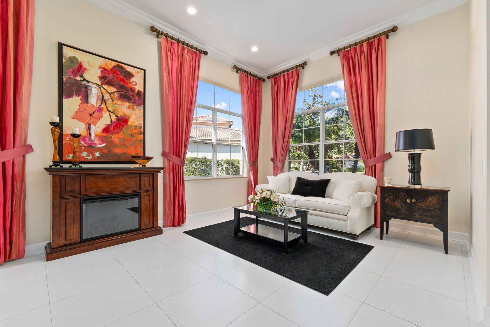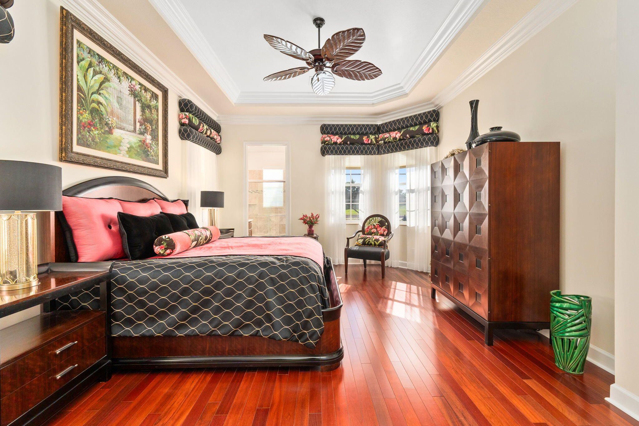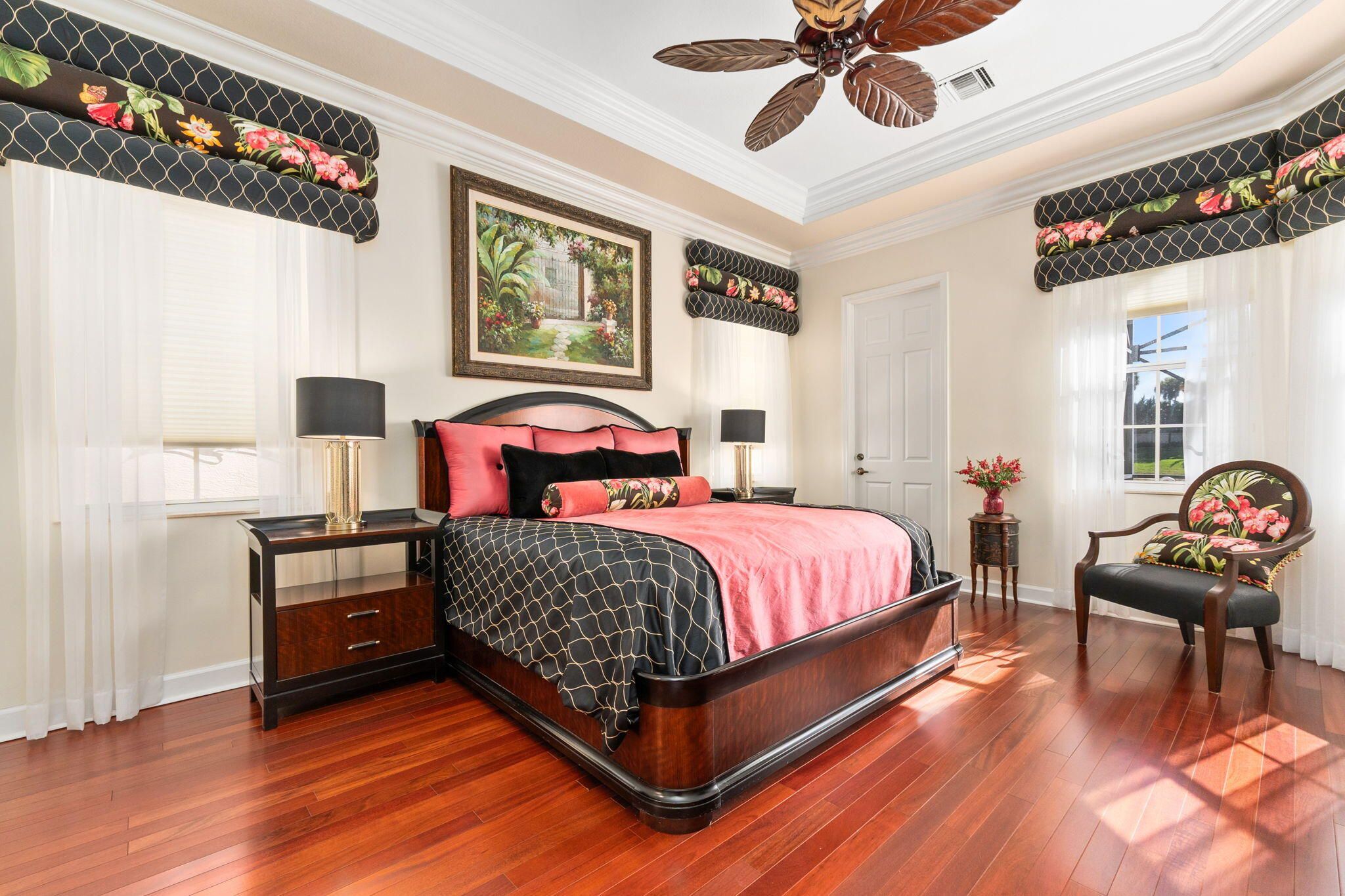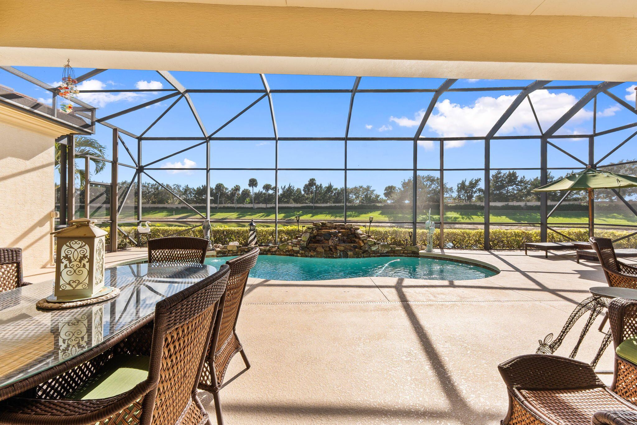 Experience resort style living in PGA Village Verano in this beautifully appointed 3-bedroom, 4-bathroom residence, ideally located on a quiet street with no rear neighbors and tranquil lakefront views. Enjoy serene lakefront views from the expansive screened lanai overlooking the pool. A gated courtyard entry and double glass front doors welcome you into a light-filled interior featuring 12-foot ceilings, tile flooring, crown molding, and high hat lighting in the living, dining, family room, and kitchen. The kitchen showcases Quartz countertops, an elegant backsplash, stainless steel appliances, and a spacious pantry. The primary suite is a peaceful retreat with tray ceilings, private patio access, and a spa like bath complete with a frameless walk-in shower, soaking tub, and his and her