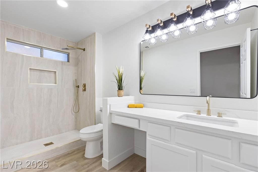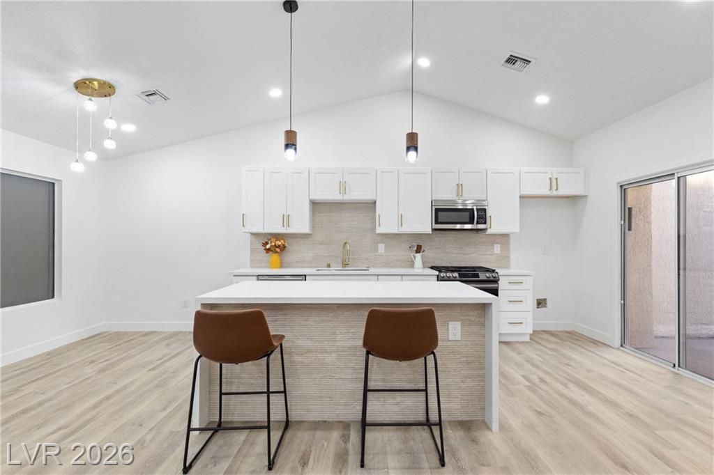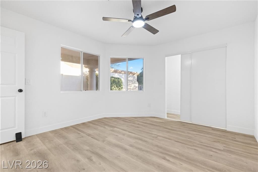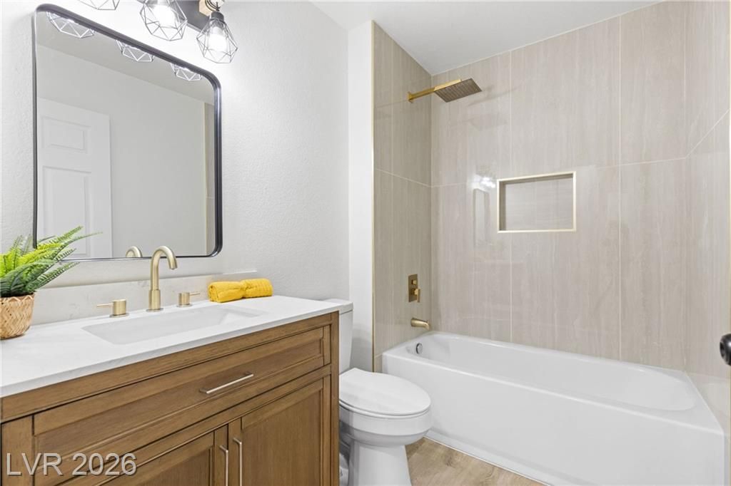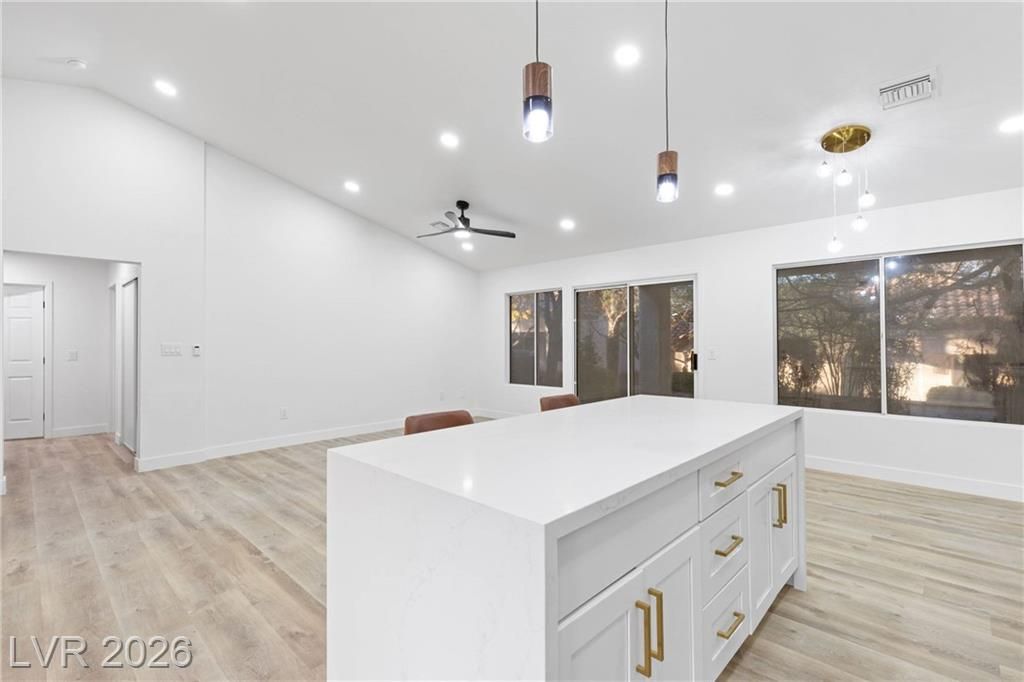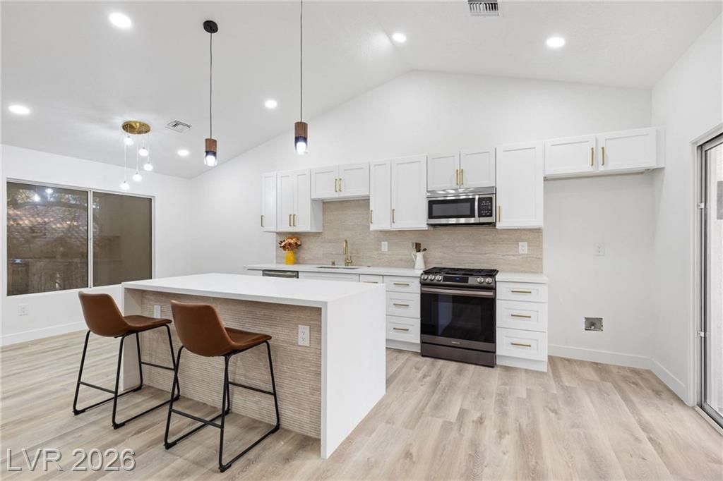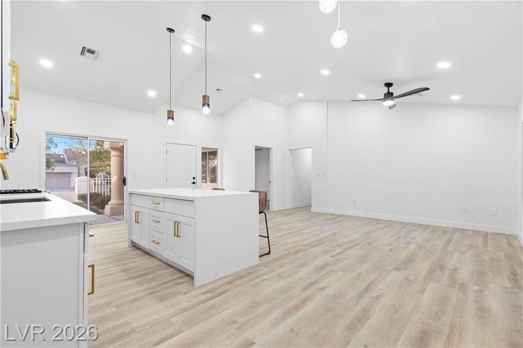 Completely renovated single-story home located in the highly desirable Sun City Summerlin community. Step inside to an open, airy floor plan featuring spacious living areas and warm laminate flooring throughout. The brand-new kitchen showcases custom cabinetry, a large custom island with breakfast bar, and sleek stainless-steel appliances—perfect for everyday living and entertaining. Both bathrooms have been fully remodeled with spa-inspired finishes, offering a relaxing, modern retreat. Enjoy the exceptional Sun City lifestyle with resort-style amenities including indoor and outdoor pools, spa, state-of-the-art fitness center, tennis and pickleball courts, bocce ball, basketball, and a vibrant social calendar filled with activities and events.