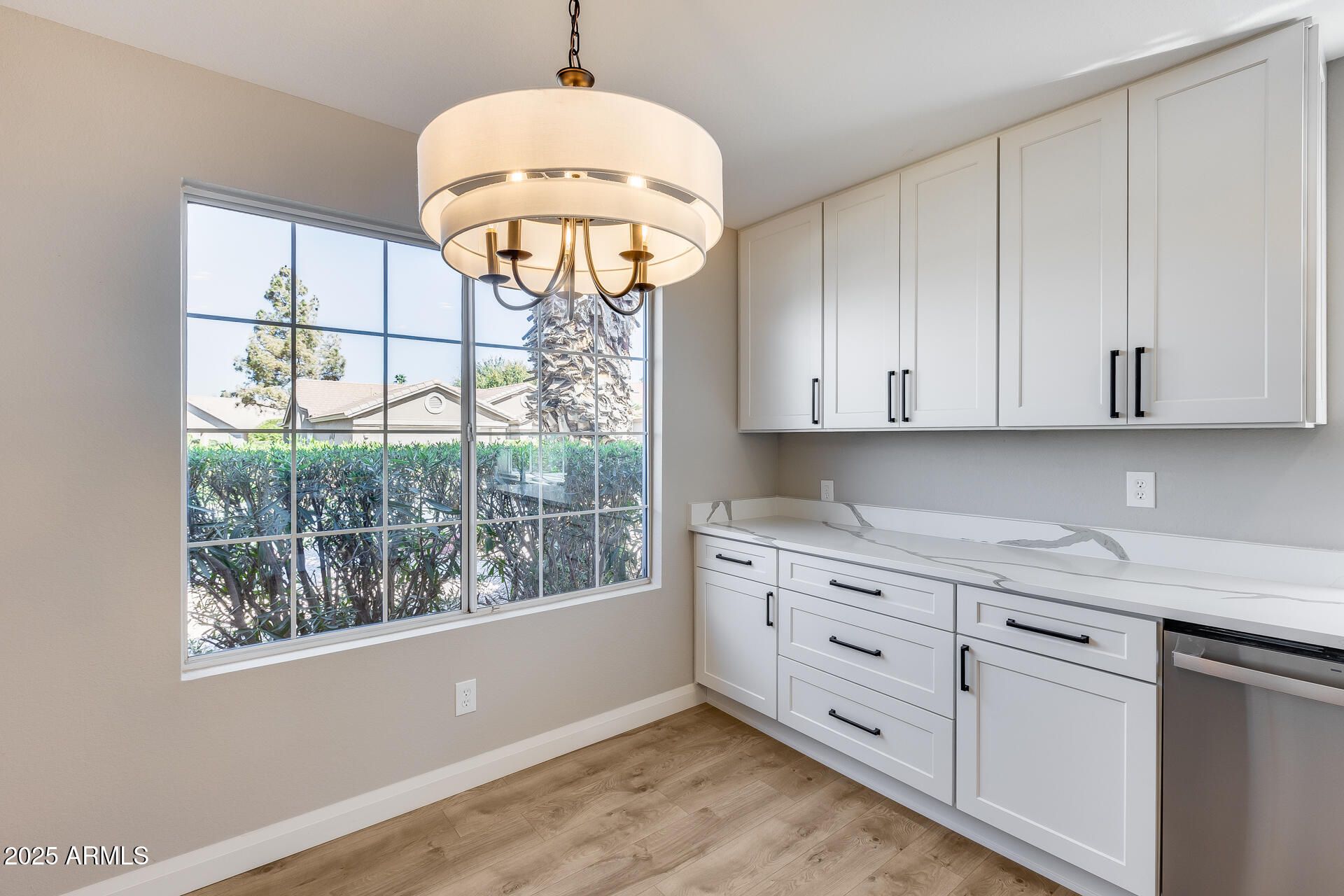 This beautifully remodeled 2-bedroom, 2-bathroom home is nestled in a vibrant gated adult community, offering 1,583 sq. ft. of inviting living space. Tall vaulted ceilings, sunscreened windows, and a spacious family room enhance the inviting atmosphere, complemented by Luxury Vinyl Plank flooring throughout. The updated kitchen showcases white cabinets, stylish hardware and white quartz countertops, while the remodeled bathrooms feature matching white cabinets and quartz countertops, tile flooring and tasteful finishes. The covered patio overlooks a large lot, with easy-care desert landscaping in both the front and back yards. Take advantage of the fantastic community amenities, including a clubhouse, heated pool and spa, golf course, lake subdivision, workout facility, and more! This beautifully remodeled 2-bedroom, 2-bathroom home is nestled in a vibrant gated adult community, offering 1,583 sq. ft. of inviting living space. Tall vaulted ceilings, sunscreened windows, and a spacious family room enhance the inviting atmosphere, complemented by Luxury Vinyl Plank flooring throughout. The updated kitchen showcases white cabinets, stylish hardware and white quartz countertops, while the remodeled bathrooms feature matching white cabinets and quartz countertops, tile flooring and tasteful finishes. The covered patio overlooks a large lot, with easy-care desert landscaping in both the front and back yards. Take advantage of the fantastic community amenities, including a clubhouse, heated pool and spa, golf course, lake subdivision, workout facility, and more!