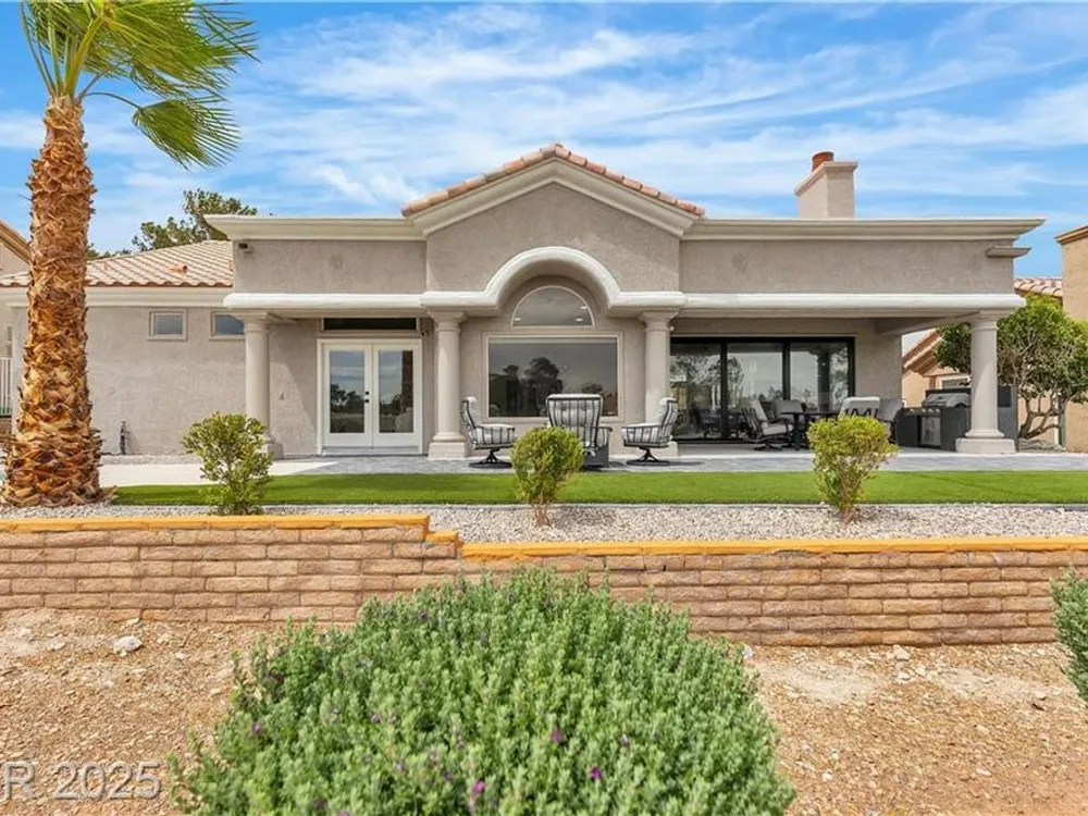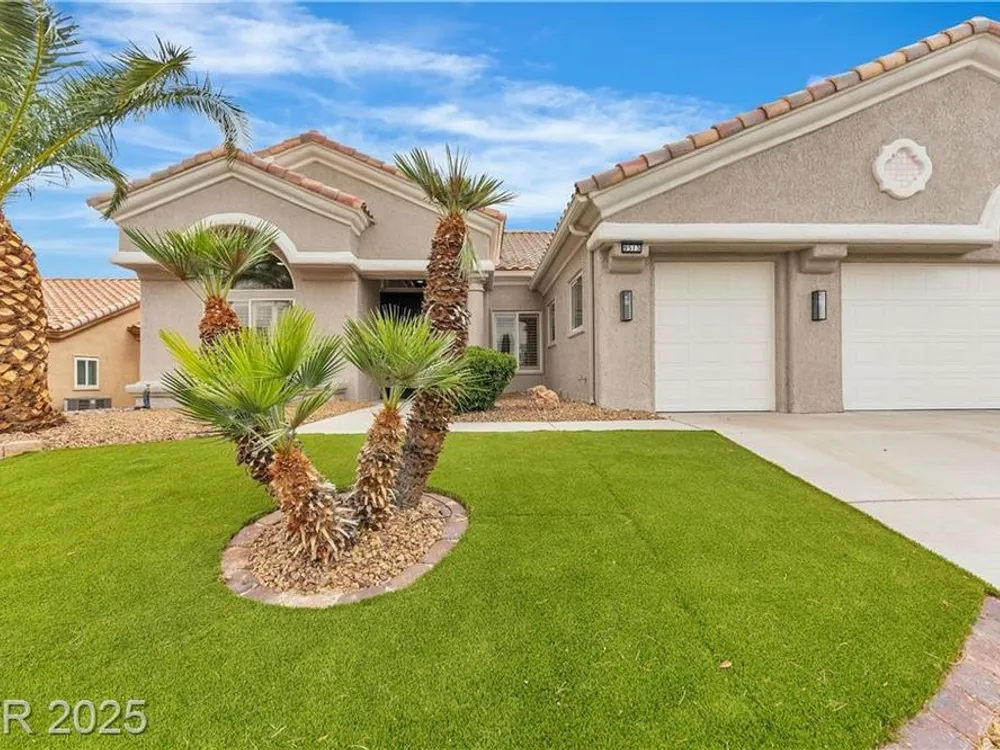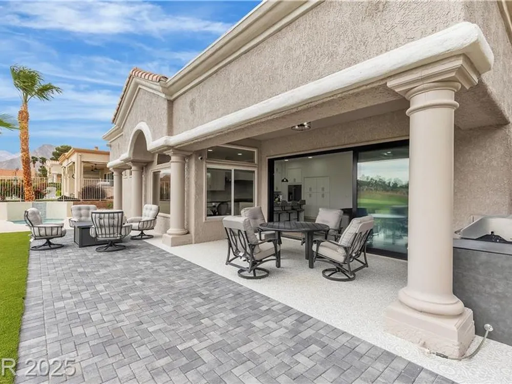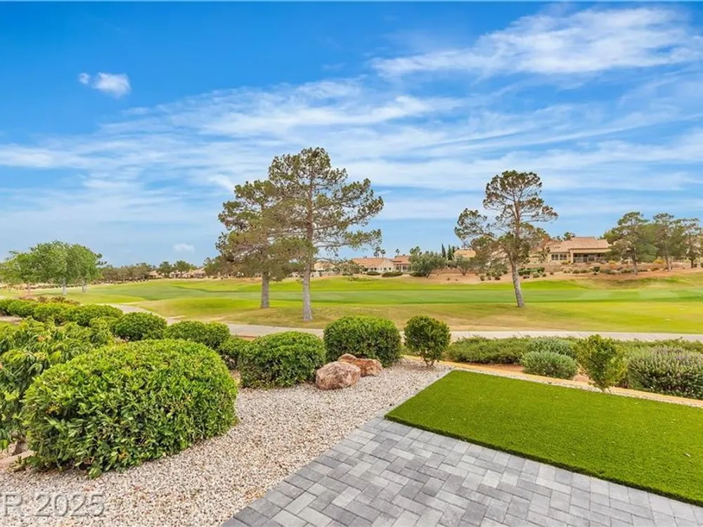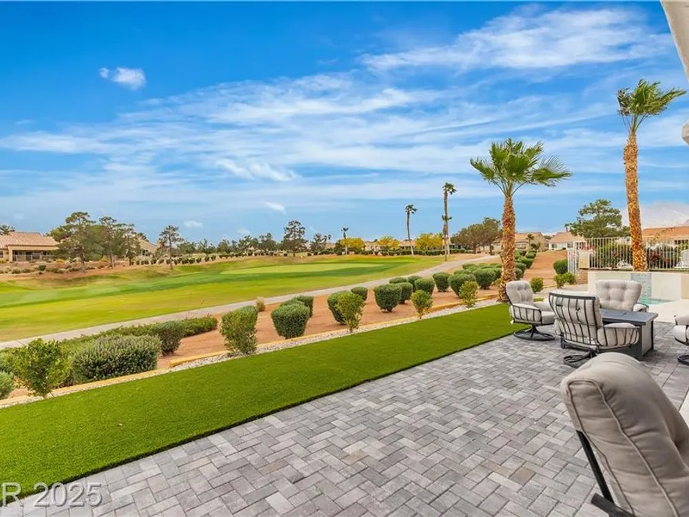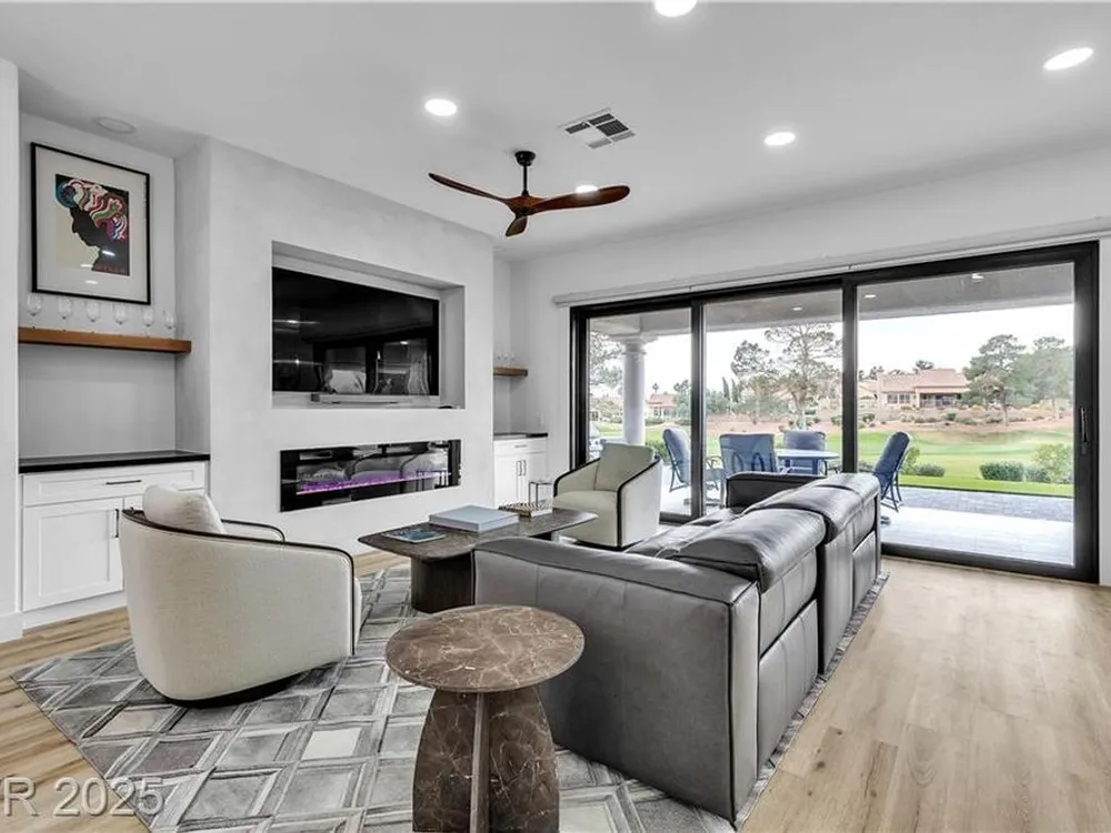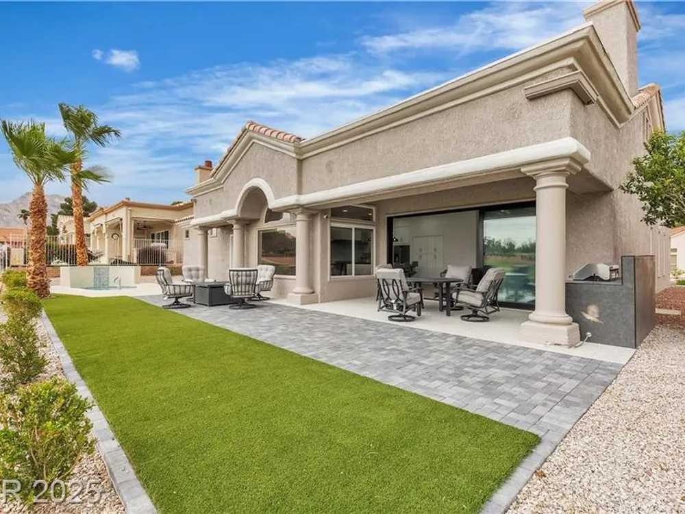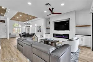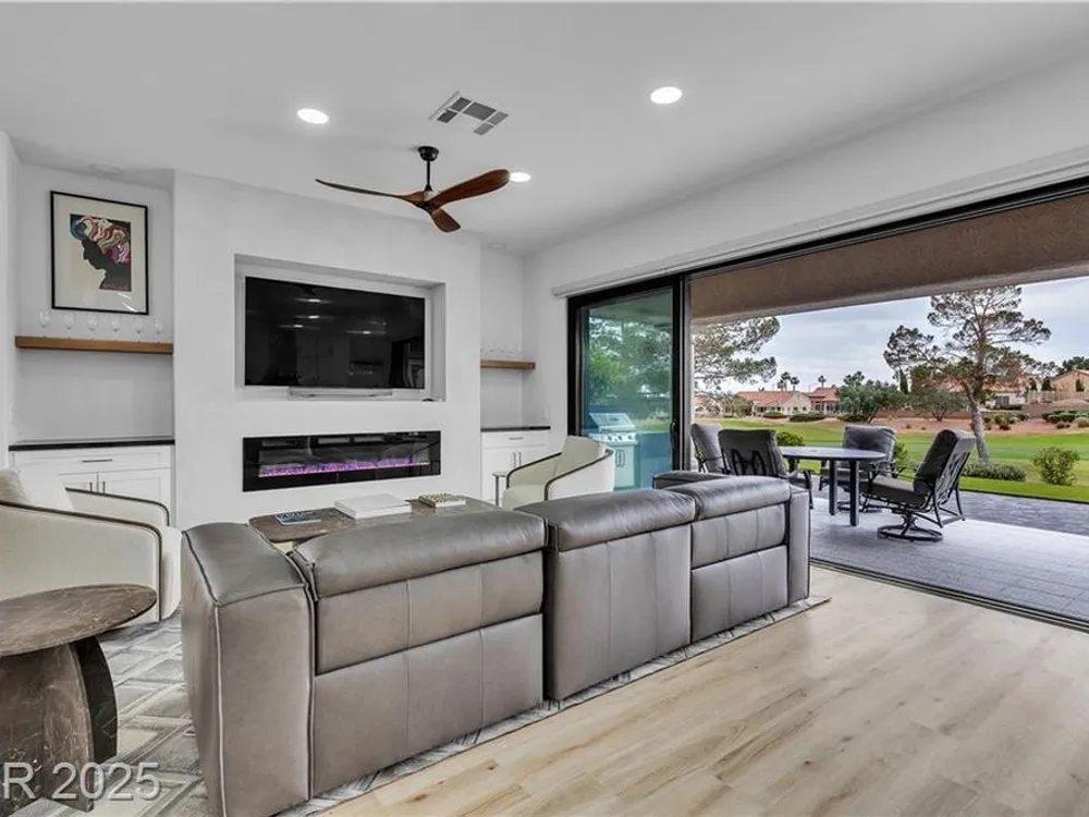 WELCOME to this FULLY RENOVATED, GOLF COURSE STUNNER IN SUN CITY SUMMERLIN! Step inside this 3 bedroom home to enjoy the OPEN CONCEPT, VAULTED CEILINGS LIVING w/ beautiful WOOD-ACCENTED CEILINGS! This home is an entertainer's dream boasting a LARGE LIVING ROOM W/ A CUSTOM ELECTRIC FIREPLACE & MEDIA WALL! The 15-FT GLASS SLIDER DOORS offer TONS OF NATURAL LIGHT as well as incredible GOLF & MOUNTAIN VIEWS! The gourmet kitchen features a 48" RANGE W/CUSTOM HOOD, STAINLESS APPLIANCES, CUSTOM SHAKER CABINETS, a HUGE ISLAND, & SLEEK QUARTZ COUNTERTOPS! The oversized primary suite offers FRENCH DOORS TO A PRIVATE PATIO, AN LED FIREPLACE, SPA-STYLE BATHROOM FEATURING A LUXURIOUS OVERSIZED SHOWER & A LARGE CUSTOM WALK-IN CLOSET! Step into the backyard to discover the COVERED PATIO W/ BUILT-IN BBQ, TREMENDOUS GOLF COURSE VIEWS, & a HEATED POOL! This MOVE-IN RENOVATED 3 CAR GARAGE home has it all! Enjoy the ACTIVE LIFESTYLE that SUN CITY HAS TO OFFER!