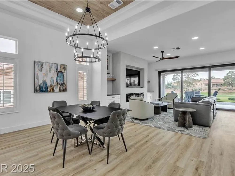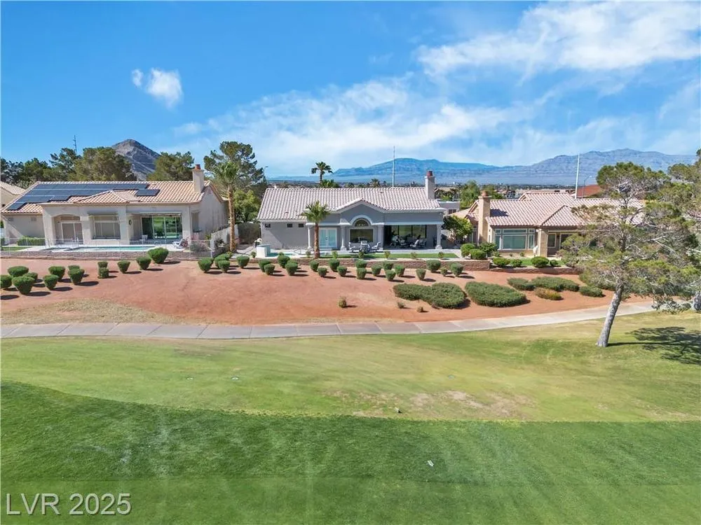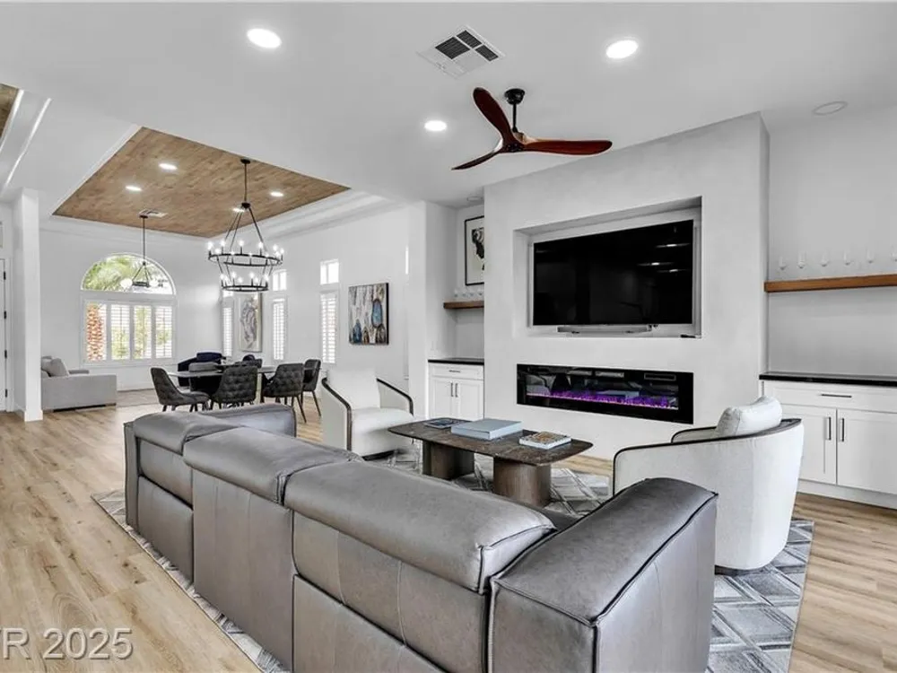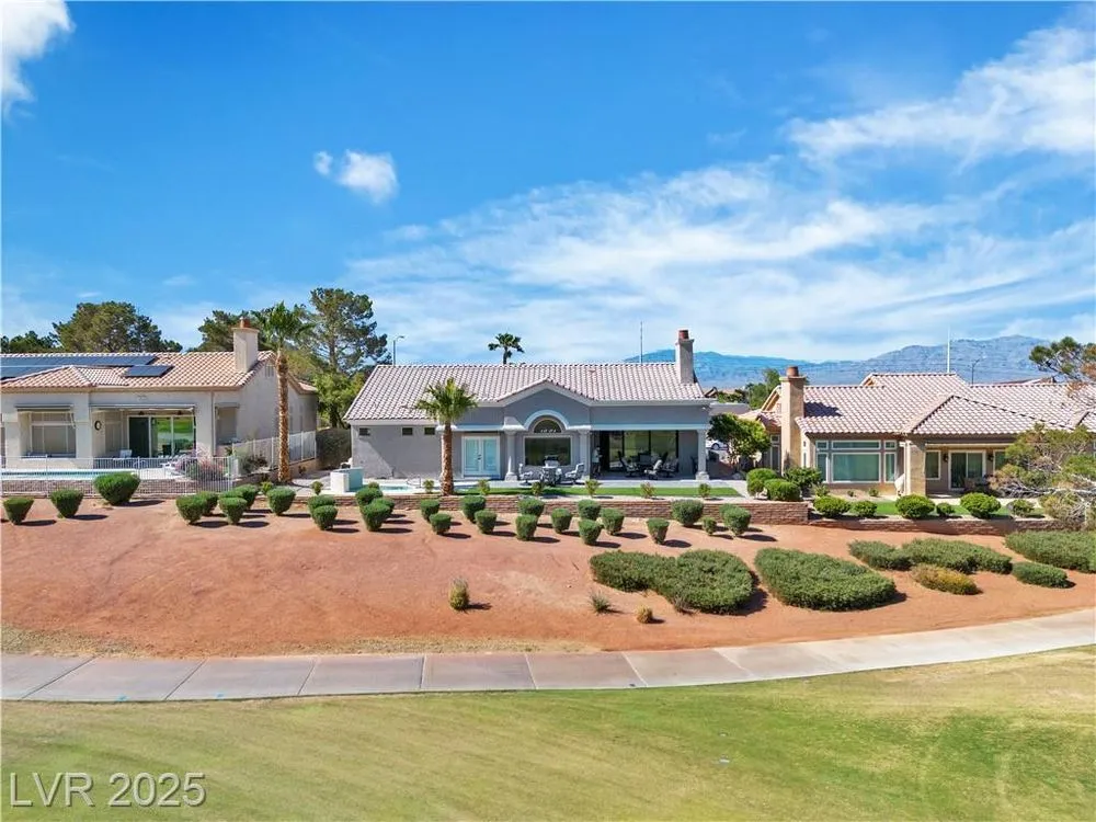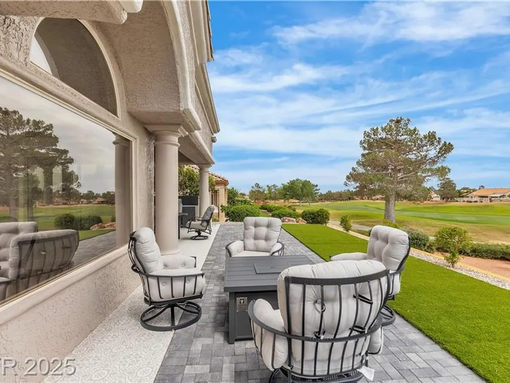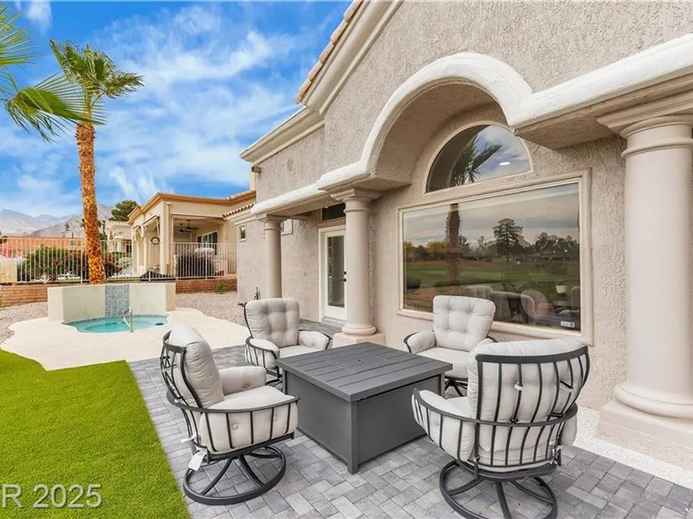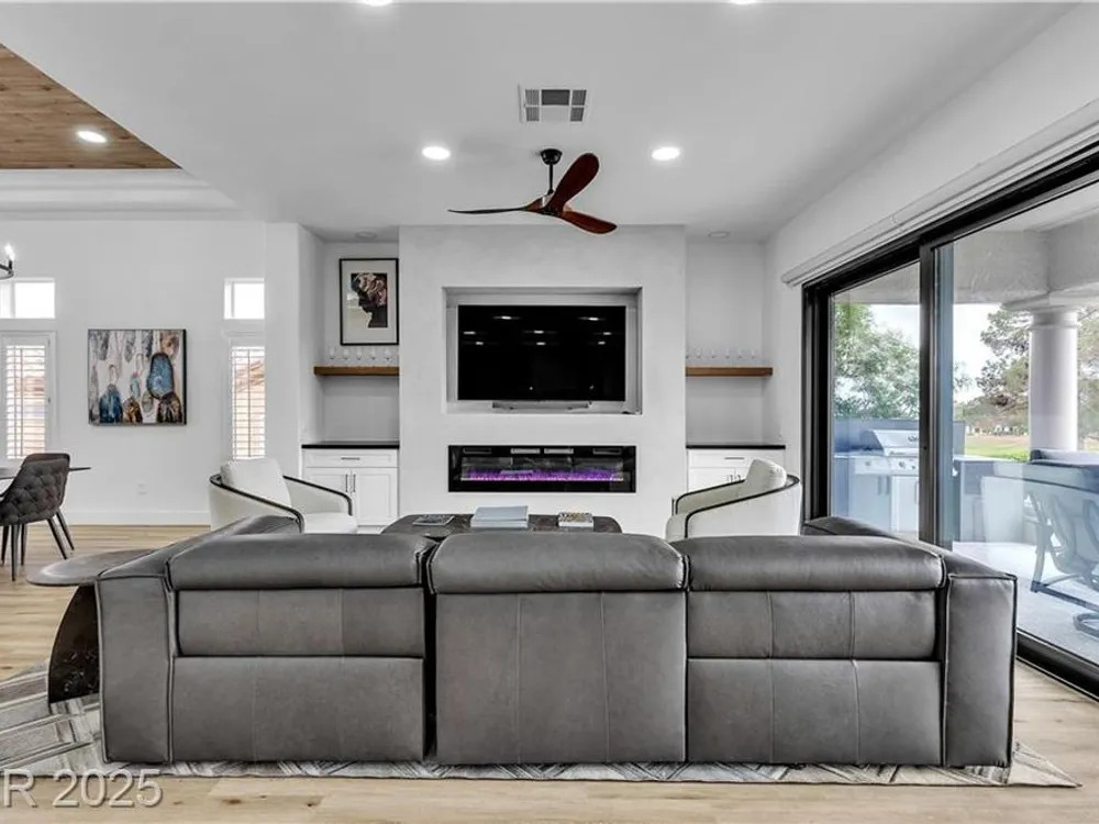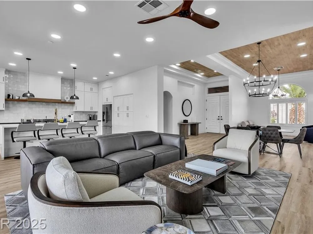 WELCOME to this FULLY RENOVATED, GOLF COURSE STUNNER IN SUN CITY SUMMERLIN! Step inside this 3 bedroom home to enjoy the OPEN CONCEPT, VAULTED CEILINGS LIVING w/ beautiful WOOD-ACCENTED CEILINGS! This home is an entertainer's dream boasting a LARGE LIVING ROOM W/ A CUSTOM ELECTRIC FIREPLACE & MEDIA WALL! The 15-FT GLASS SLIDER DOORS offer TONS OF NATURAL LIGHT as well as incredible GOLF & MOUNTAIN VIEWS! The gourmet kitchen features a 48" RANGE W/CUSTOM HOOD, STAINLESS APPLIANCES, CUSTOM SHAKER CABINETS, a HUGE ISLAND, & SLEEK QUARTZ COUNTERTOPS! The oversized primary suite offers FRENCH DOORS TO A PRIVATE PATIO, AN LED FIREPLACE, SPA-STYLE BATHROOM FEATURING A LUXURIOUS OVERSIZED SHOWER & A LARGE CUSTOM WALK-IN CLOSET! Step into the backyard to discover the COVERED PATIO W/ BUILT-IN BBQ, TREMENDOUS GOLF COURSE VIEWS, & a HEATED POOL! This MOVE-IN RENOVATED 3 CAR GARAGE home has it all! Enjoy the ACTIVE LIFESTYLE that SUN CITY HAS TO OFFER!