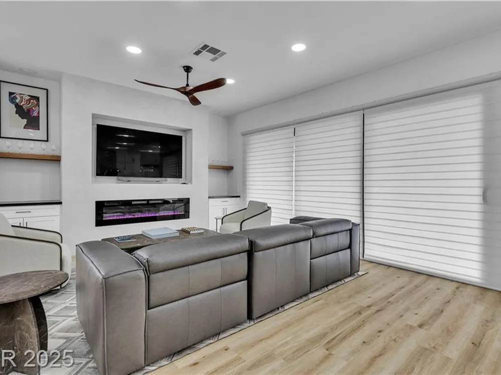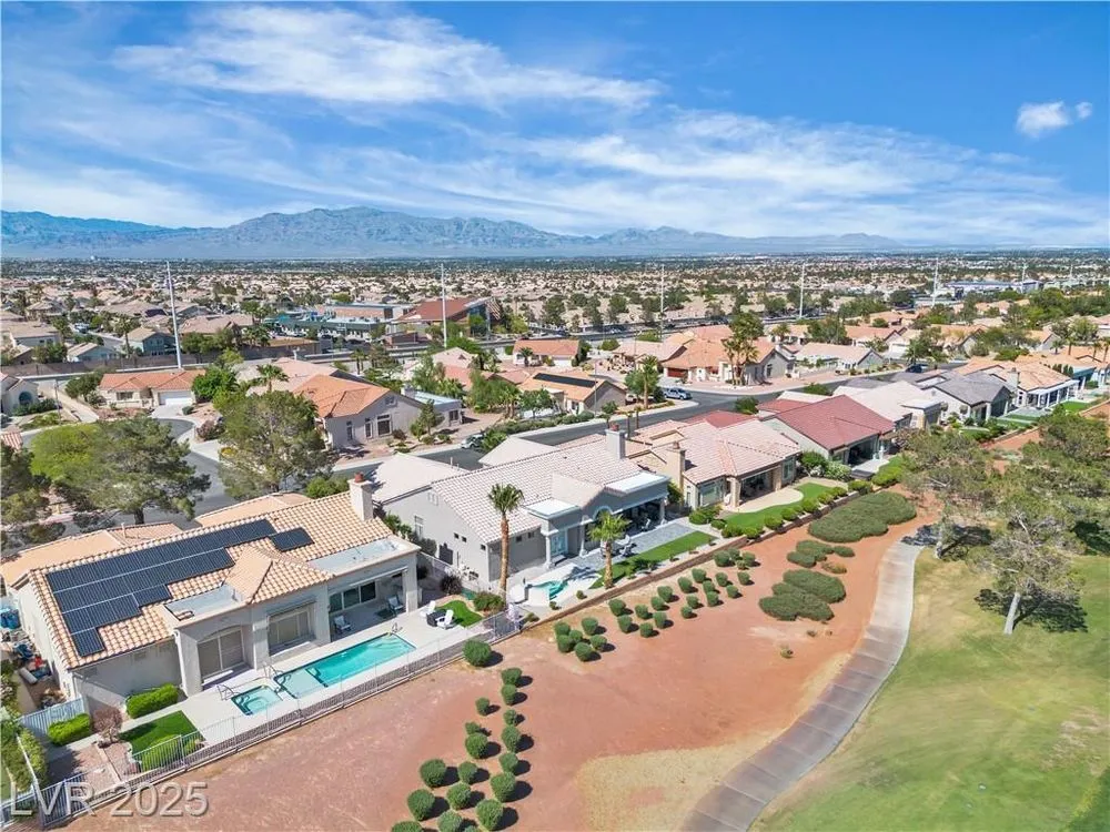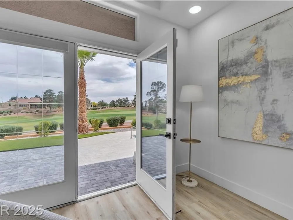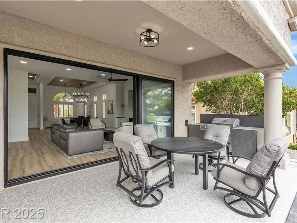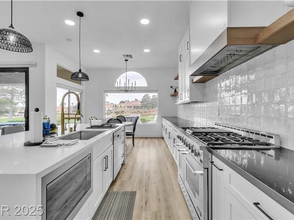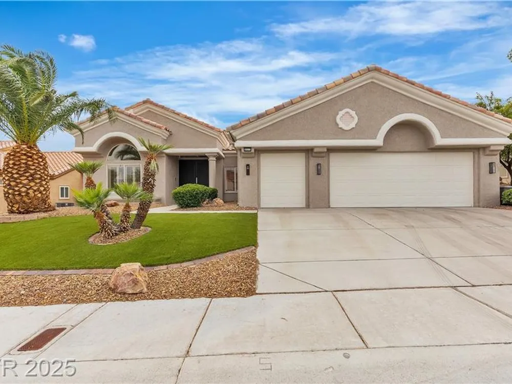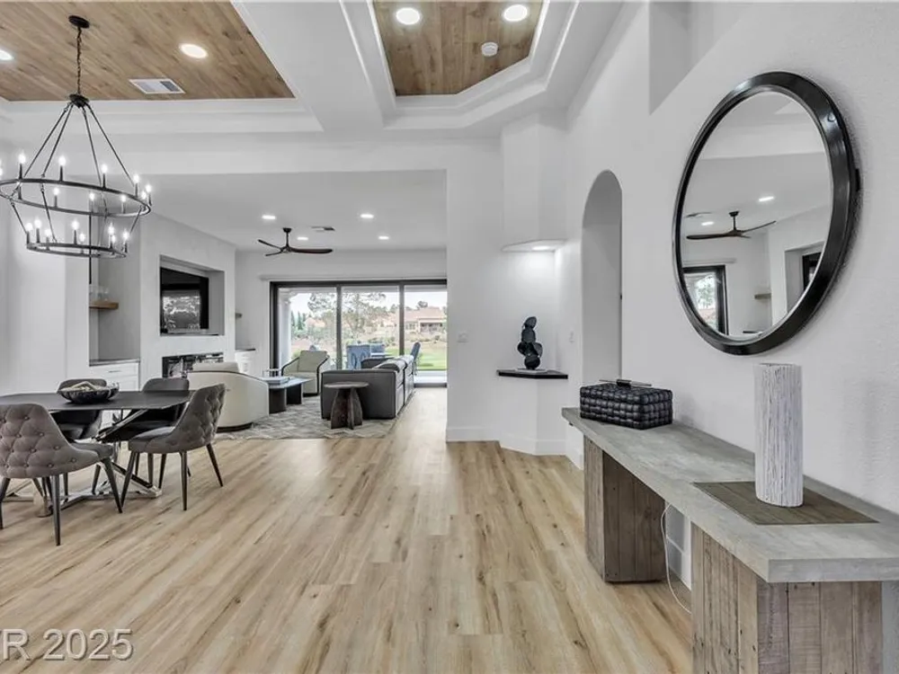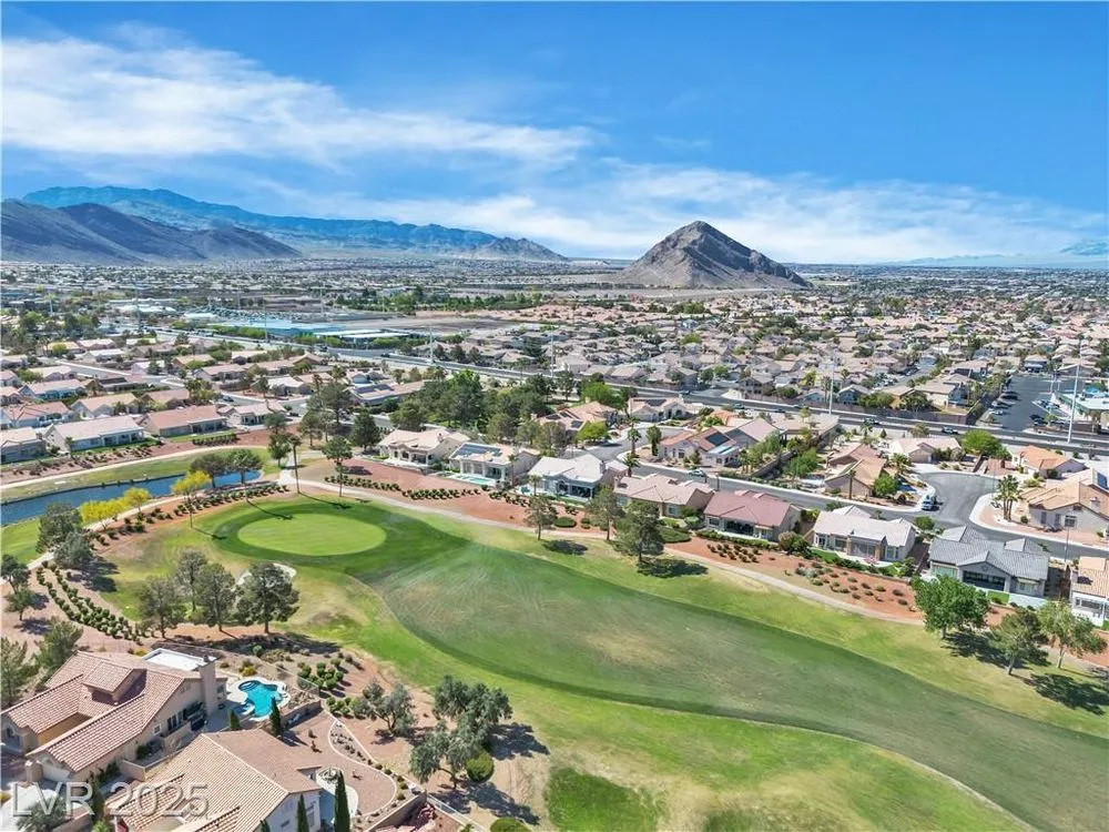 WELCOME to this FULLY RENOVATED, GOLF COURSE STUNNER IN SUN CITY SUMMERLIN! Step inside this 3 bedroom home to enjoy the OPEN CONCEPT, VAULTED CEILINGS LIVING w/ beautiful WOOD-ACCENTED CEILINGS! This home is an entertainer's dream boasting a LARGE LIVING ROOM W/ A CUSTOM ELECTRIC FIREPLACE & MEDIA WALL! The 15-FT GLASS SLIDER DOORS offer TONS OF NATURAL LIGHT as well as incredible GOLF & MOUNTAIN VIEWS! The gourmet kitchen features a 48" RANGE W/CUSTOM HOOD, STAINLESS APPLIANCES, CUSTOM SHAKER CABINETS, a HUGE ISLAND, & SLEEK QUARTZ COUNTERTOPS! The oversized primary suite offers FRENCH DOORS TO A PRIVATE PATIO, AN LED FIREPLACE, SPA-STYLE BATHROOM FEATURING A LUXURIOUS OVERSIZED SHOWER & A LARGE CUSTOM WALK-IN CLOSET! Step into the backyard to discover the COVERED PATIO W/ BUILT-IN BBQ, TREMENDOUS GOLF COURSE VIEWS, & a HEATED POOL! This MOVE-IN RENOVATED 3 CAR GARAGE home has it all! Enjoy the ACTIVE LIFESTYLE that SUN CITY HAS TO OFFER!