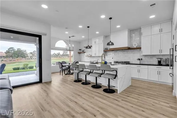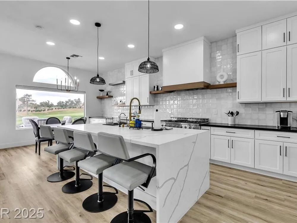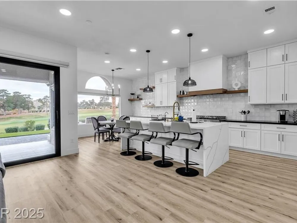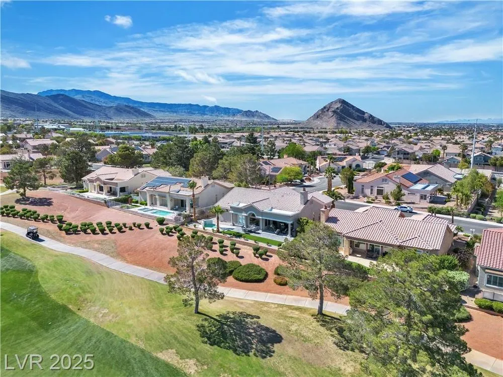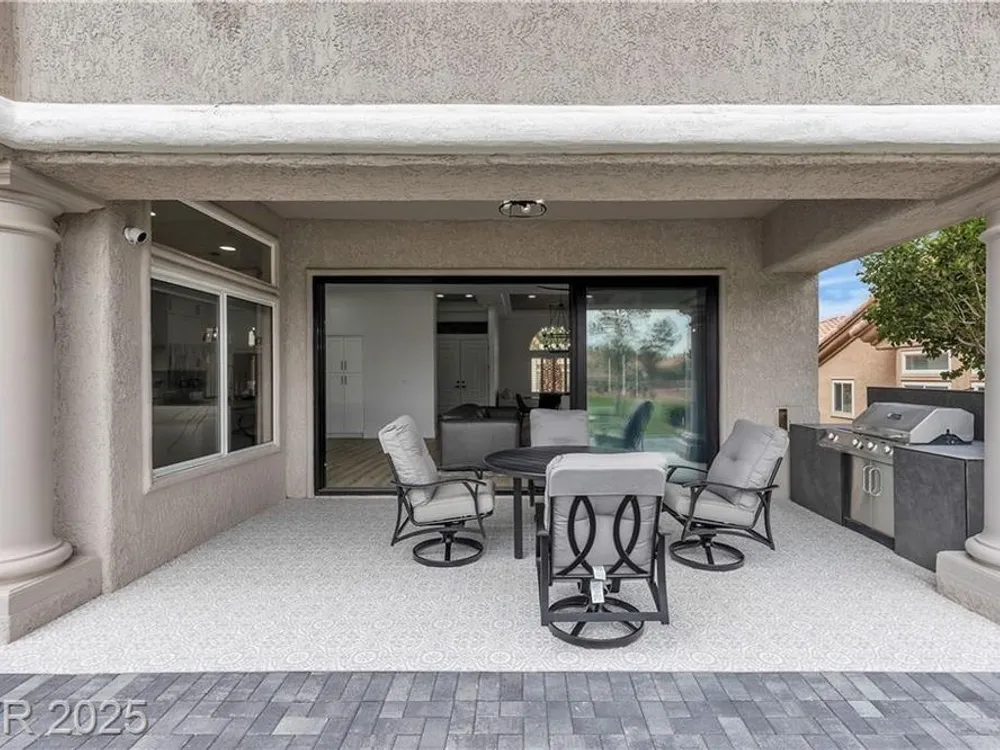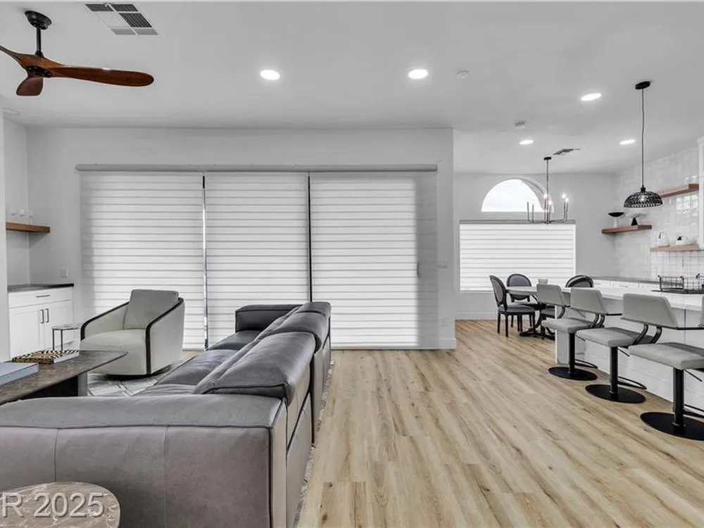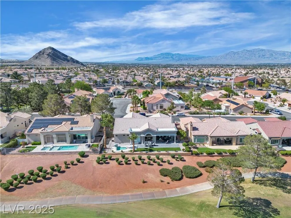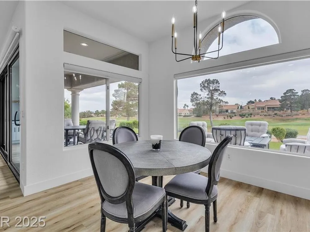 WELCOME to this FULLY RENOVATED, GOLF COURSE STUNNER IN SUN CITY SUMMERLIN! Step inside this 3 bedroom home to enjoy the OPEN CONCEPT, VAULTED CEILINGS LIVING w/ beautiful WOOD-ACCENTED CEILINGS! This home is an entertainer's dream boasting a LARGE LIVING ROOM W/ A CUSTOM ELECTRIC FIREPLACE & MEDIA WALL! The 15-FT GLASS SLIDER DOORS offer TONS OF NATURAL LIGHT as well as incredible GOLF & MOUNTAIN VIEWS! The gourmet kitchen features a 48" RANGE W/CUSTOM HOOD, STAINLESS APPLIANCES, CUSTOM SHAKER CABINETS, a HUGE ISLAND, & SLEEK QUARTZ COUNTERTOPS! The oversized primary suite offers FRENCH DOORS TO A PRIVATE PATIO, AN LED FIREPLACE, SPA-STYLE BATHROOM FEATURING A LUXURIOUS OVERSIZED SHOWER & A LARGE CUSTOM WALK-IN CLOSET! Step into the backyard to discover the COVERED PATIO W/ BUILT-IN BBQ, TREMENDOUS GOLF COURSE VIEWS, & a HEATED POOL! This MOVE-IN RENOVATED 3 CAR GARAGE home has it all! Enjoy the ACTIVE LIFESTYLE that SUN CITY HAS TO OFFER!