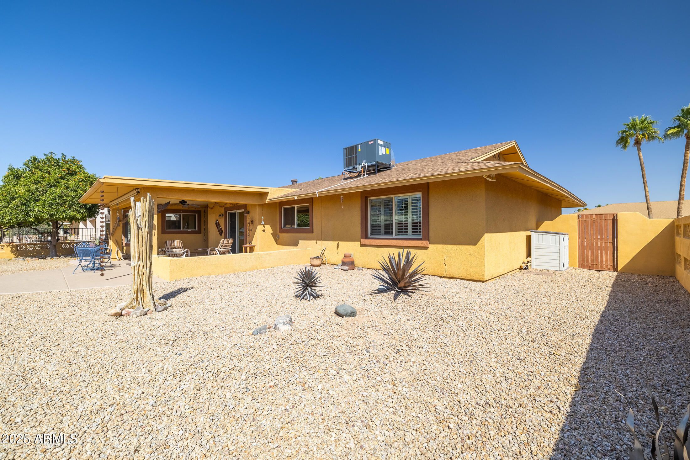 Beautiful, remodeled home with fully fenced yard and two side gates. Home has been opened up and walls taken down to make this a spacious open kitchen and great room floorplan. The Kitchen features Maple raised panel cabinets with pull-outs, kitchen island and can lighting. Front door, windows and patio slider has been replaced. Both Bathrooms have raised vanity height cabinets and tiled walk-in showers with built in benches. Wood shutters on front window. NO POPCORN CEILINGS! Additionally, there's a versatile den or office space that adds flexibility. Outside of Home has been stucco. Tiled extended covered patio in back and front arch way. New Roof in 2020, New A/C 2024, New Water Heater 2022. Garage door & opener 2020. Tuff Shed on side to convey