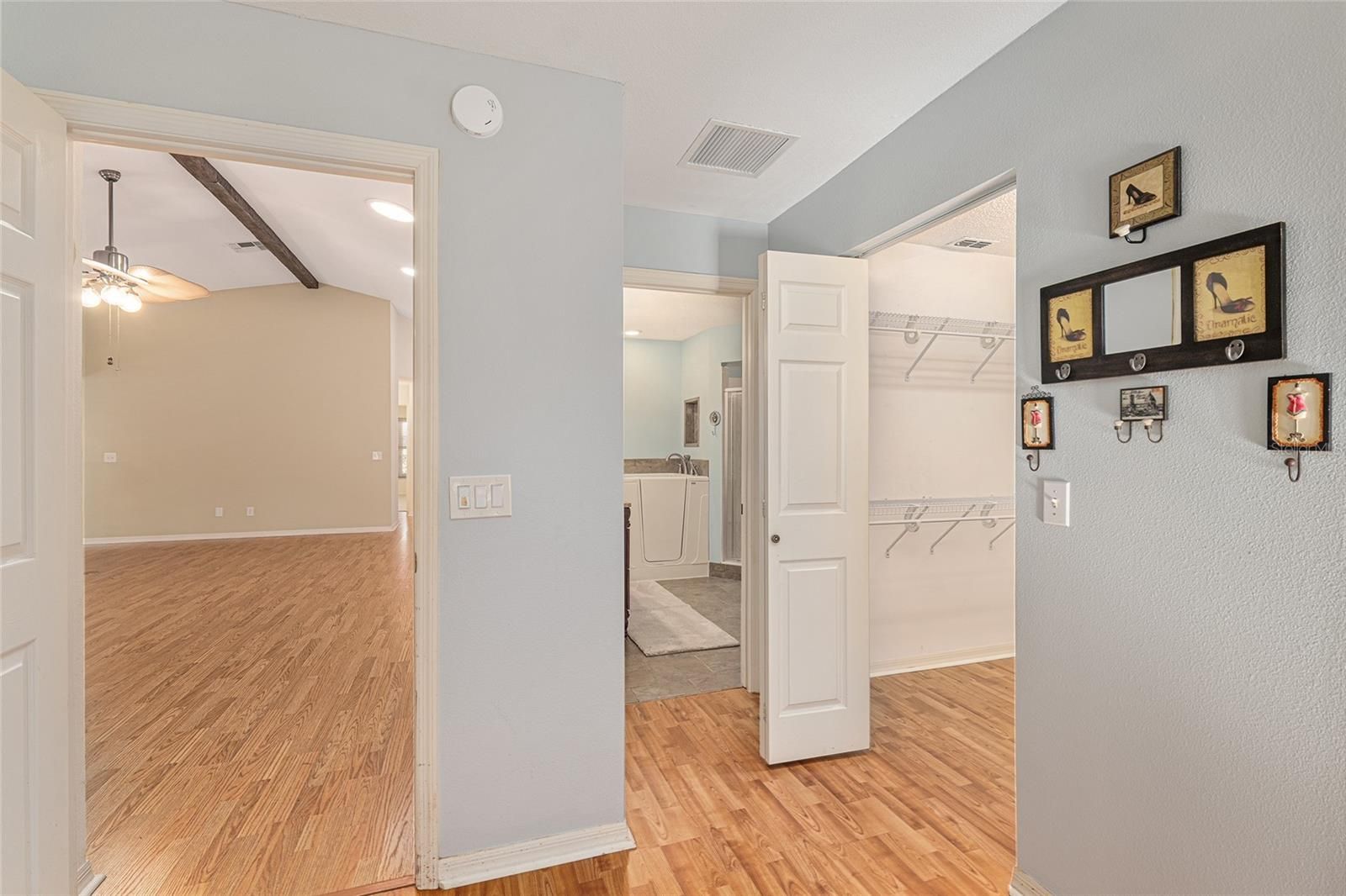 - Ceiling Fan(s), High Ceilings, Main Level Primary, Split Bedrooms, Thermostat, Window Treatments