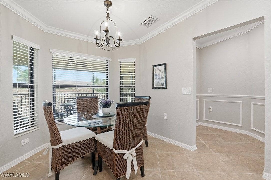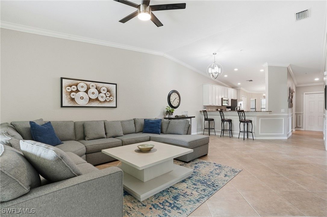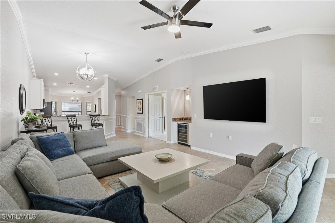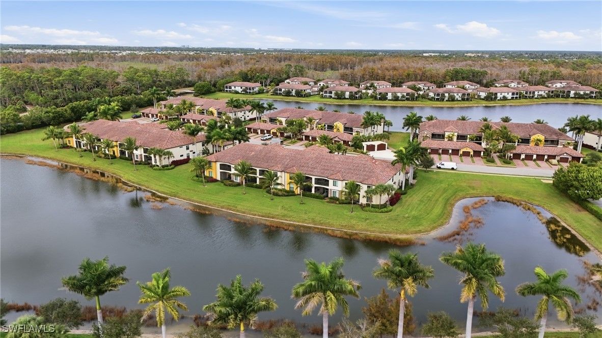 Enjoy resort-style living in the highly sought-after community of Treviso Bay. This light-filled 2-bedroom plus den end unit offers beautiful lake views and includes a one-car detached garage. Interior features include white cabinetry, crown and decorative molding, impact windows and sliders, wine cooler, tile and carpet flooring, AC one year old, and a flexible den ideal for a home office or guest space. Designed for indoor-outdoor living, the home offers two lanais—one at the front and one at the rear—perfect for enjoying morning coffee with sunrise views or relaxing in the evening while taking in peaceful sunsets. Treviso Bay is known for its exceptional amenities, including a resort-style pool with poolside bar and restaurant, a full-service fitness center with attendant and group fitness classes, an active pickleball program, tennis courts with pro shop, and a full-service spa. The elegant clubhouse features fine dining options and a variety of member-themed social events. Residents also enjoy the new Flagship Bar overlooking the stunning TPC Treviso Bay golf course. Golf membership is not included with this condominium; however, off-season golf is available from May through October for a nominal fee. Surrounded by preserves, lakes, and the Rookery Preserve, the community offers miles of scenic walking and biking paths, creating a serene and nature-filled setting. Ideally located just five miles from Naples’ pristine beaches, with convenient access to the shopping, dining, and entertainment of 5th Avenue South and 3rd Street South, this home offers the perfect blend of luxury, lifestyle, and location.