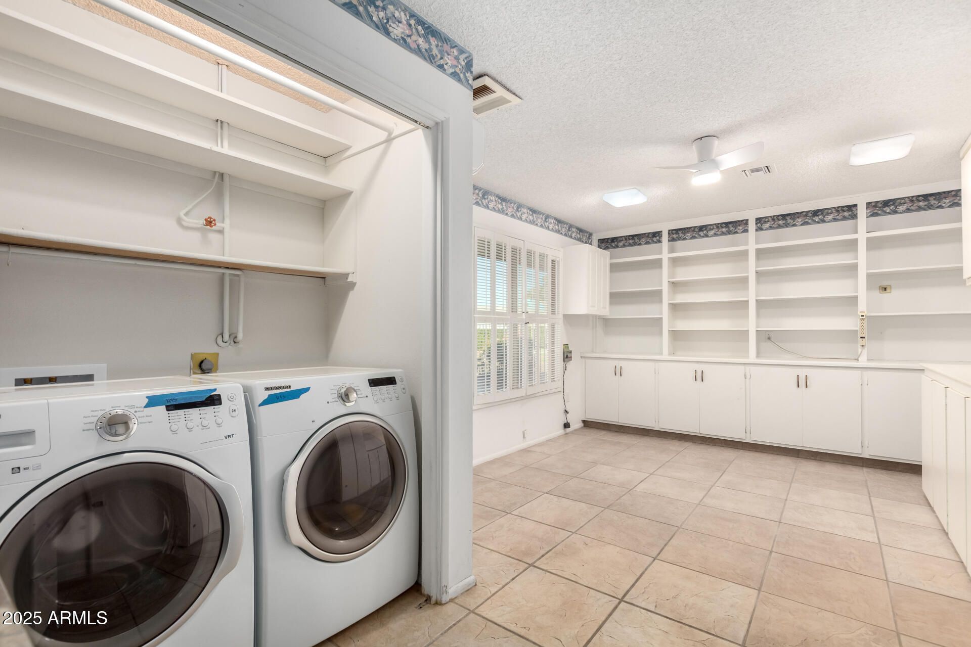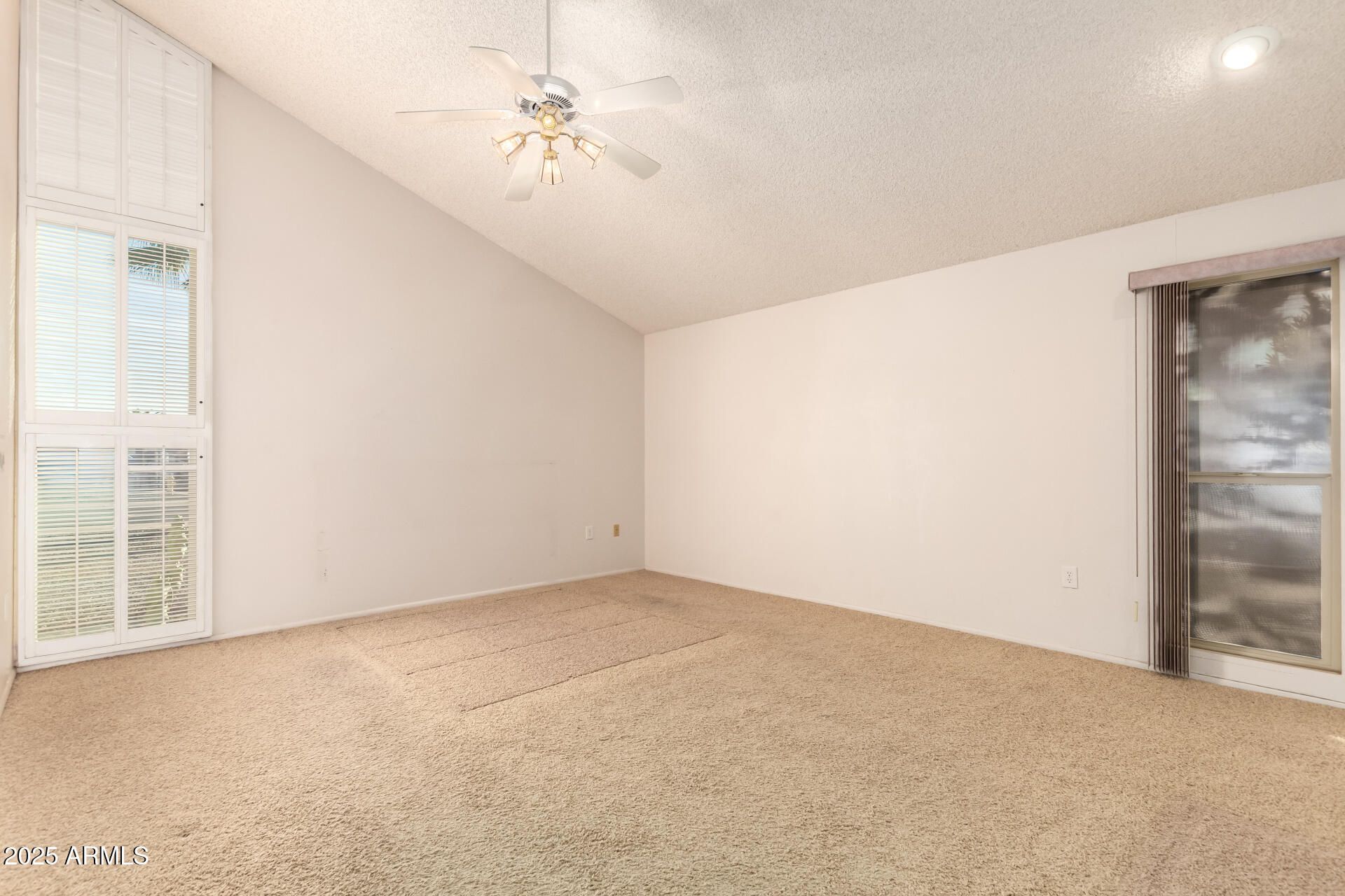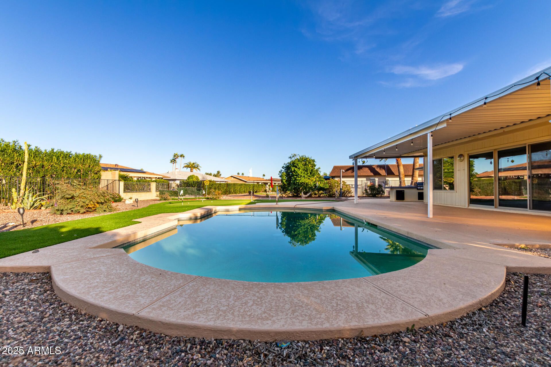 Spacious corner-lot home located in a quiet cul-de-sac, designed for entertaining friends and family. The kitchen was fully renovated in 2024 with abundant new cabinetry and expansive granite countertops. A welcoming courtyard entry opens to the formal dining room. The oversized Arizona Room features luxury vinyl flooring, a bar area, and a serving window from the kitchen with direct access to the backyard and pool. The home also offers a large family room and an oversized living room. The exceptionally large laundry room includes extensive built-in storage, a deep sink, washer and dryer, its own A/C unit, and a wall of windows. The backyard is an entertainer's dream with a pool, BBQ with counter space, outdoor shower, putting green, tee box, mature landscaping, and drip irrigation.