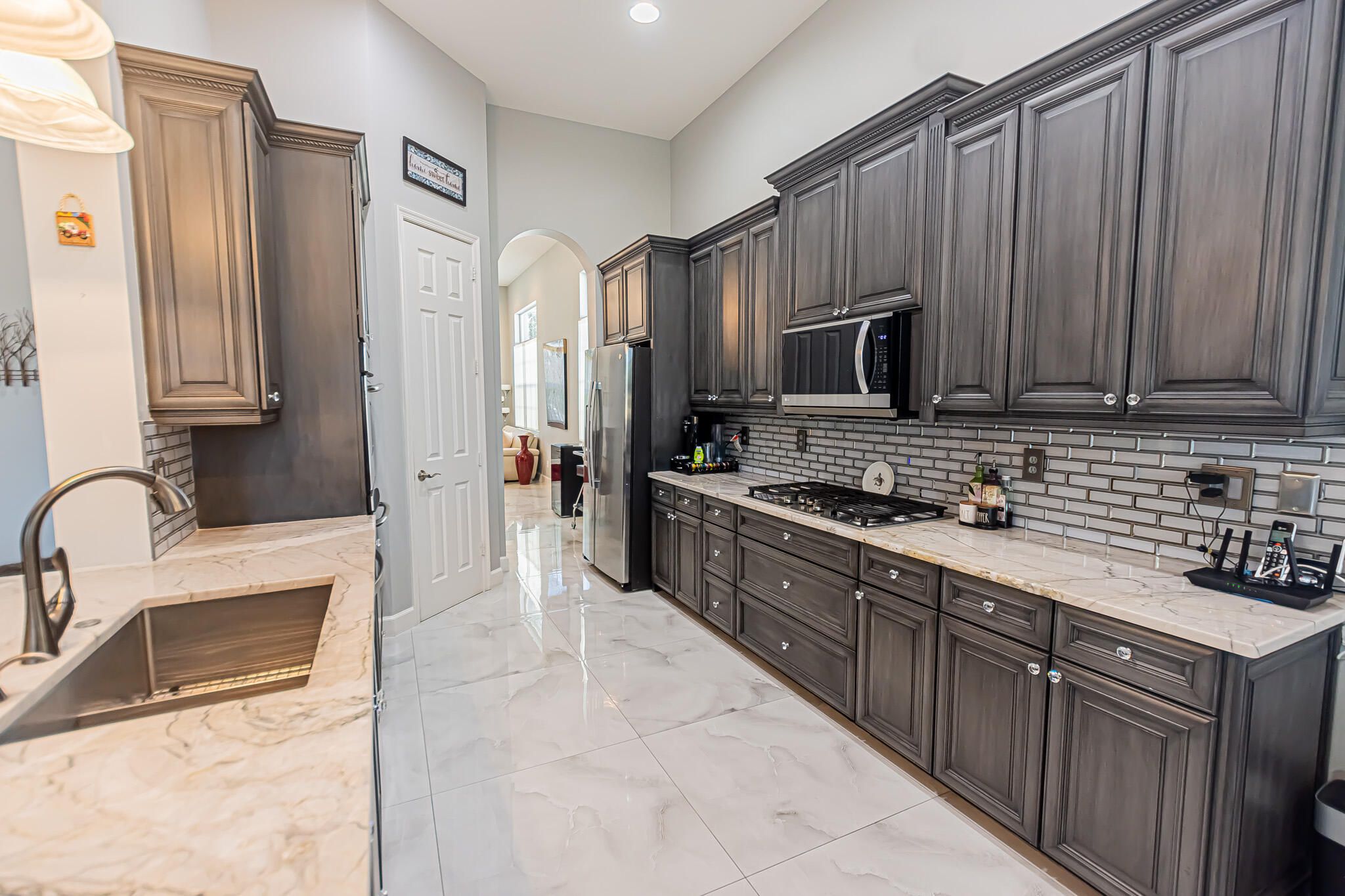 Impressive 3BR/3.5BA/2CG golf-front pool home in PGA Verano 4th green views! Features include a whole-house solar system, EV charger, high-impact windows, luxurious 24'X24' new procelain floors, custom closet cabinetry, beveled glass double-door entry, 2022 A/C. The gourmet kitchen offers granite countertops, 42'' wood cabinets with crown molding, gas cooktop, double wall oven, new stainless appliances, tiled backsplash, breakfast nook, pantry. Spacious layout includes living, dining, and family rooms with decorative fireplace and a large laundry room. Updated baths with touch mirrors, soaking tub. Relax in the covered and screened paver patio with solar-heated pool and spillway spa. HOA includes lawn care, cable, and resort-style amenities clubhouse, efitness center,pools, picklebalL