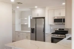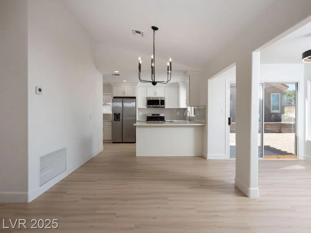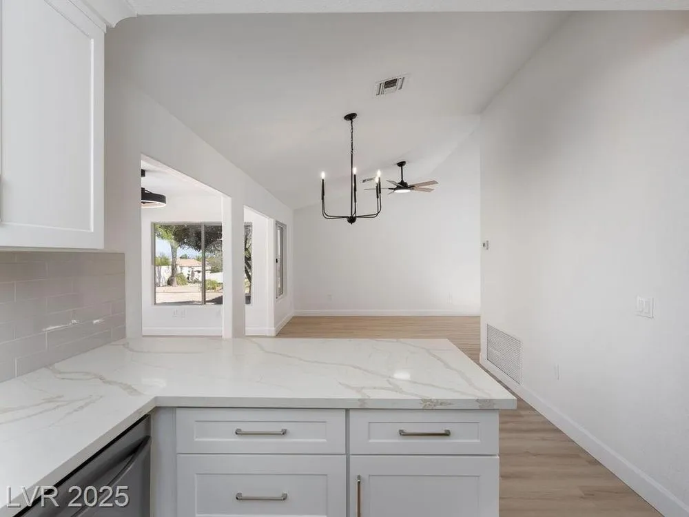This FULLY REMODELED home sits on a private, partially enclosed elevated lot, with serene Mountain Views. A new York brand HVAC system (furnace & AC) was installed in September 2025. Throughout the home, new Visinet Oak LVP flooring and upgraded baseboards create a light, bright, seamless flow between spaces. The expanded kitchen is a showpiece with new shaker-style cabinets featuring soft-close doors and drawers, abundant storage with a pantry, and a peninsula that opens to the living areas. Quartz countertops harmonize beautifully with the flooring, complemented by a classic subway tile backsplash and designer hardware. The kitchen is complete with all-new Samsung SS appliances. Vaulted ceilings in the living and dining rooms enhance the open, airy feel, while a versatile sun room off the main living area offers ideal flex space. Both bathrooms have been fully remodeled with modern finishes that create a cohesive design throughout. The garage is freshly painted with epoxy floors.
