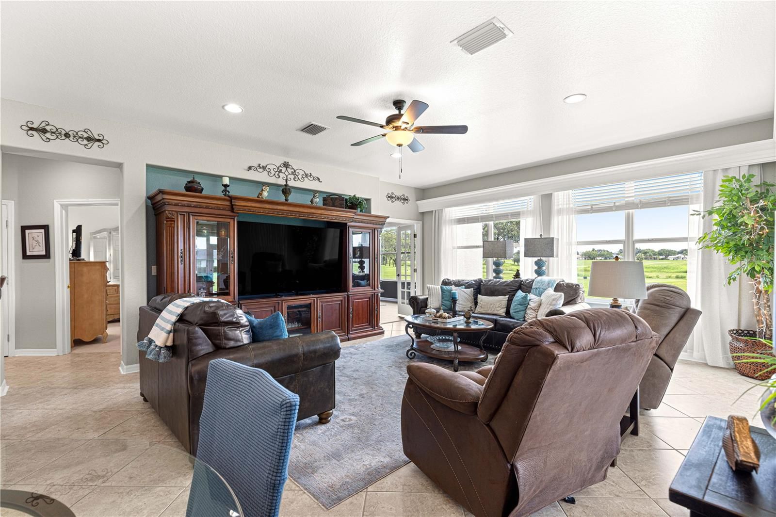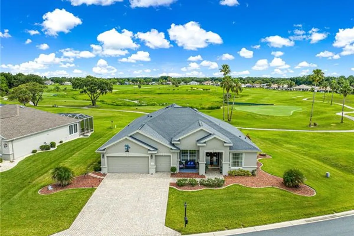 Looking for a large home close to The Villages. Welcome to this beautiful Home in Guard Gated Del Webb Spruce Creek Golf & Country Club. This home is situated on the third hole of the Masters Golf Course, offering sweeping views of holes one and two. With 2806 square feet alongside the heated and cooled lanai equaling 3,222 square feet. This home provides the ultimate blend of luxury and comfort—and there are no bonds or CDD fees. This LEXINGTON (the largest model floor plan built in Del Webb) 3/2 plus an office/den model with enclosed lanai and 3 car garage, has plenty of room for a pool! Step through the grand double-door entry to be greeted by breathtaking golf course views. Enjoy morning coffee or evening sunsets from this oversized enclosed lanai overlooking the manicured greens. The large kitchen with Island, has canned lighting and desk area overlooking the large family room. This one is a split floor plan which is perfect for guests. A large primary bedroom suite that has sliding glass doors to the enclosed lanai. Ensuite bath has a large walk-in closet, shower, double sinks and a garden tub. Three Mini Splits recently installed. The lot next door is empty giving you plenty of space to enjoy the outdoors. There are so many upgrades and features to this beautiful home. The Community is packed with activities, (Club house, golf, fitness center, softball field, basketball court, horseshoes, shuffleboard, bocce, walking trail, pavilion on the lake, 3 pools, 2 hot tubs, billiards, pickleball courts, ballroom, hobby rooms, social activities daily). Liberty Grill Restaurant next to Horizen Center Clubhouse. Home Painted inside and out 2023, New Attic Insulation installed 2024, Kitchen Back Splash 2023, Hot Water Heater 2025. Owner is the Agent