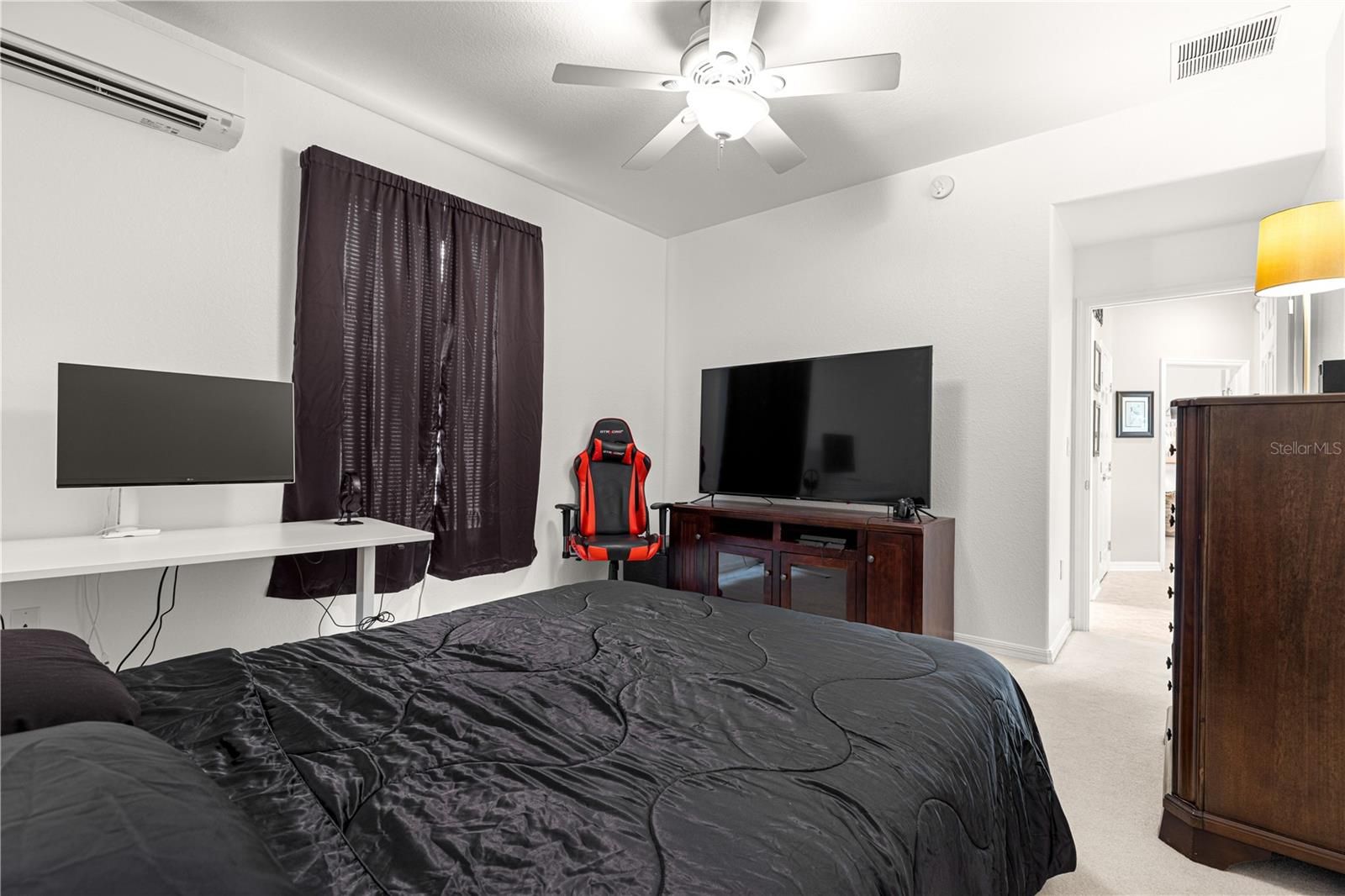 - Ceiling Fan(s), Eat-in Kitchen, Kitchen/Family Room Combo, Main Level Primary, Split Bedrooms, Stone Counters, Thermostat, Window Treatments