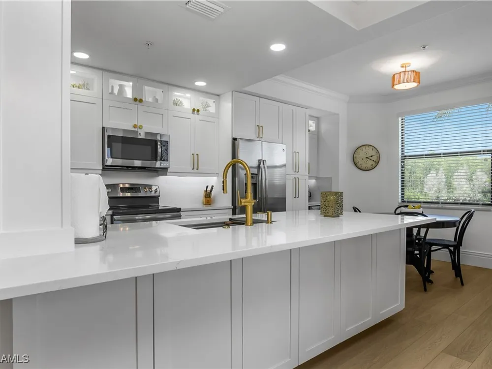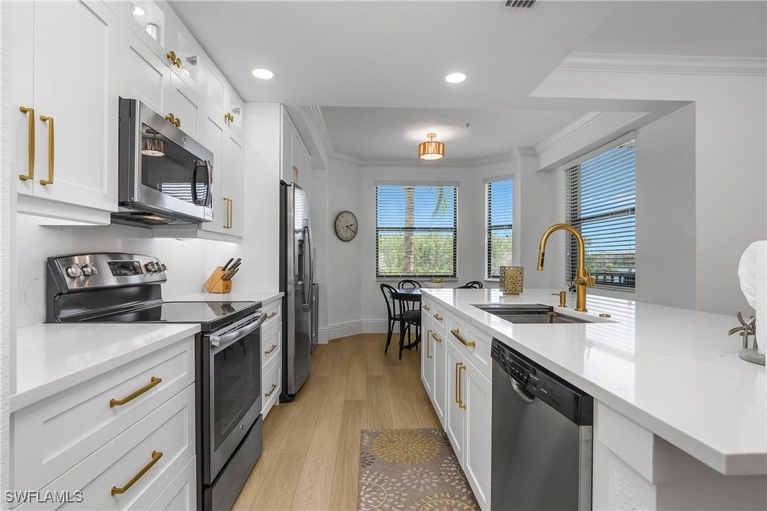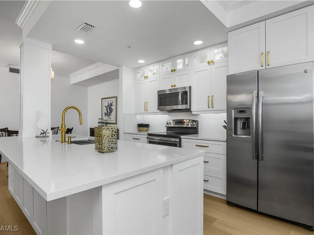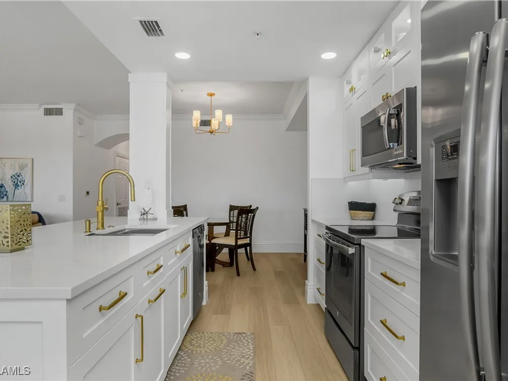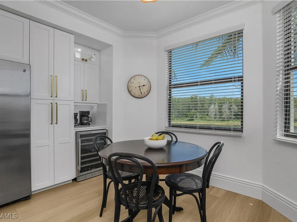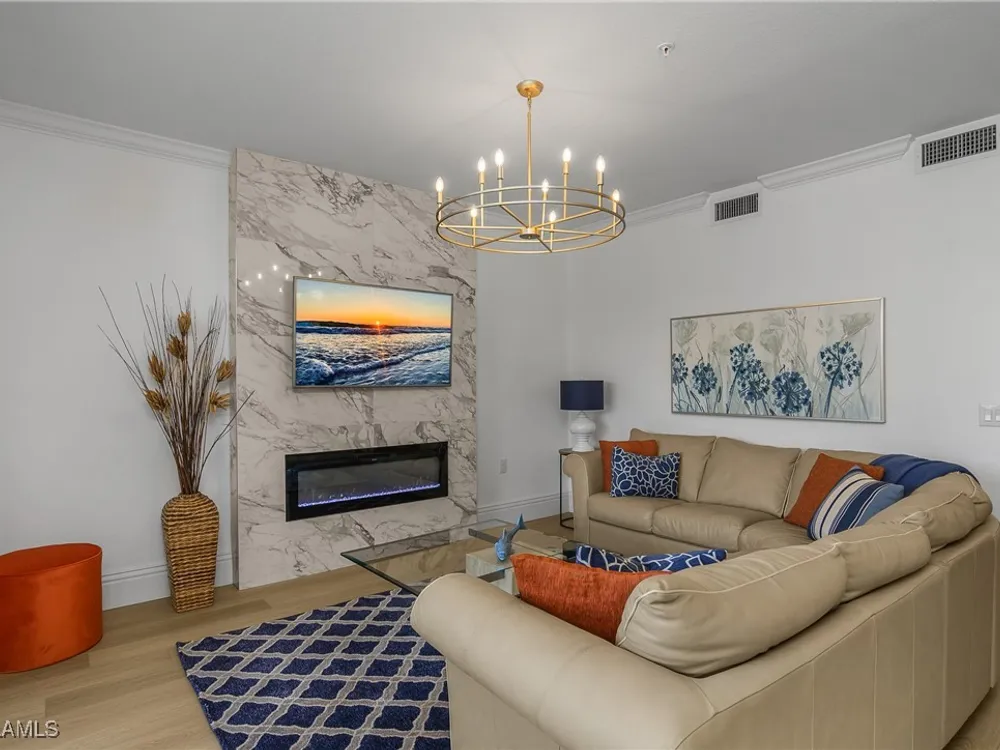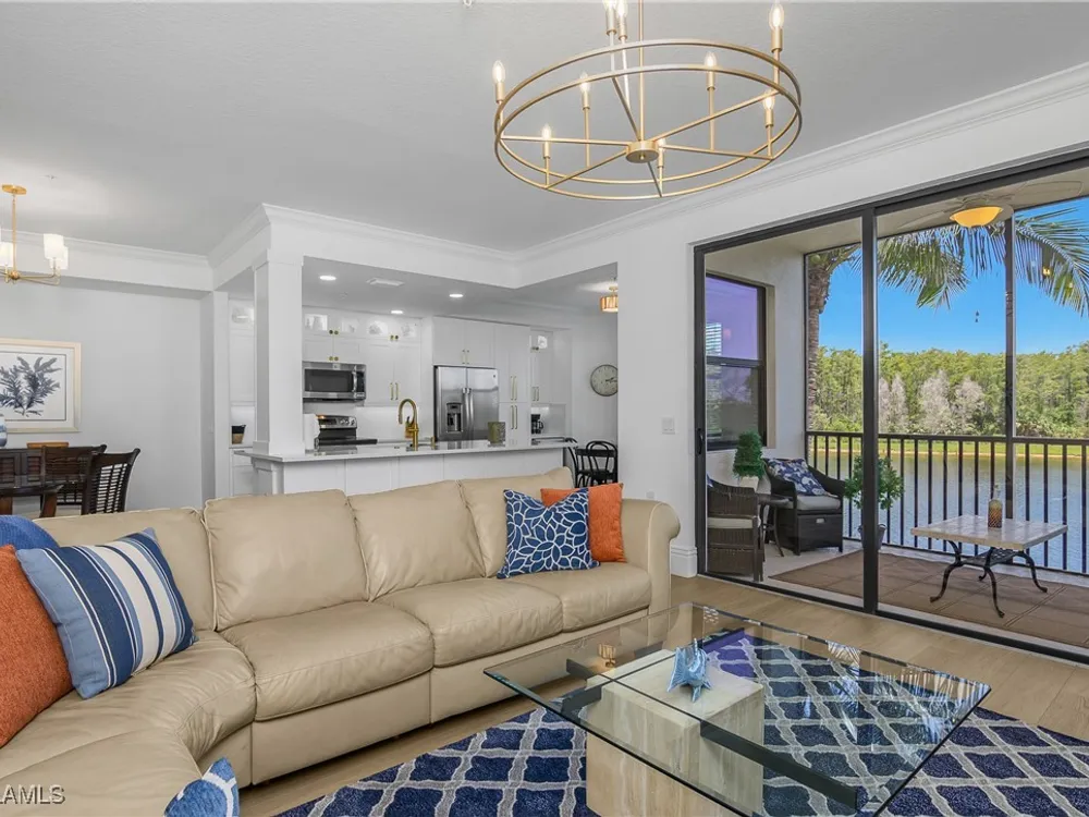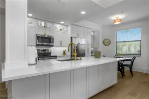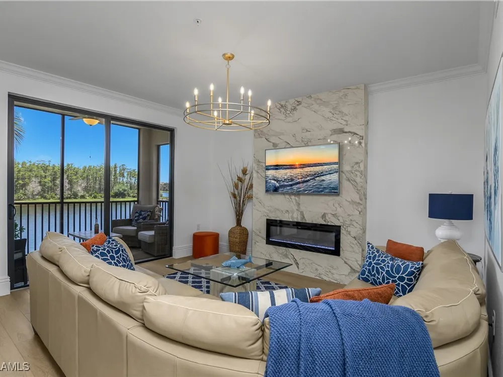 A rare chance to own PERFECTION—this 2nd floor, SOCIAL membership, Bellini model in Treviso Bay has been masterfully remodeled with more than $50,000 in upgrades, creating a home that feels brand new and effortlessly refined. Every detail has been considered, blending style and function into a welcoming retreat with 2 bedrooms, 2 bathrooms, and a spacious open layout perfect for everyday living or entertaining. The redesigned kitchen is the heart of the home, showcasing $20,000 in custom cabinetry from floor to ceiling, sleek quartz countertops, a large stainless-steel sink with upgraded faucet, Jeffrey Alexander hardware, and a built-in wine cooler and dry bar. A removed kitchen wall now creates a more open, airy flow, while designer chandeliers and enhanced electrical work provide an elegant finishing touch. Luxury vinyl flooring stretches throughout, complemented by taller baseboards and wider door trim for a refined look. The living area is anchored by a stunning custom tile TV and fireplace feature wall, making it a perfect space to relax. Freshly painted walls, ceilings, and trim enhance the light and bright atmosphere, while an upgraded screen door at the entrance welcomes breezes inside. Even the laundry room has been elevated with additional cabinetry for storage and convenience. As a bonus, the contractor has a piece of matching quartz available should the new owner wish to upgrade the bathroom counters. The screened lanai has an updated light and fan and offers breathtaking views of the lake and Rookery Bay Preserve, perfect for enjoying a morning cup of coffee or relaxing after a fun filled day in the community. Beyond the home itself, Treviso Bay offers a lifestyle unlike any other in Naples. This gated community features the luxurious Club Rilassare with a resort-style pool, lap lanes, hot tub, kiddie pool, and poolside restaurant and bar. Stay active with a state-of-the-art fitness center, aerobics studio, bocce courts, tennis facilities, pickleball courts, and a half court basketball. Unwind at the full-service spa, explore miles of walking and biking trails, or simply enjoy the natural beauty surrounding the community. The main clubhouse over looks the TPC golf course (tee times available to social members May - October) and offers plenty of dining options with indoor and outdoor bars and seating, a large events room, private dining room, Arthurs Snack Shop, activities room, business center, a golf pro-shop, and large lounge locker rooms. With a social membership included, you’ll have access to endless opportunities to connect, relax, and enjoy the best of resort-style living.
