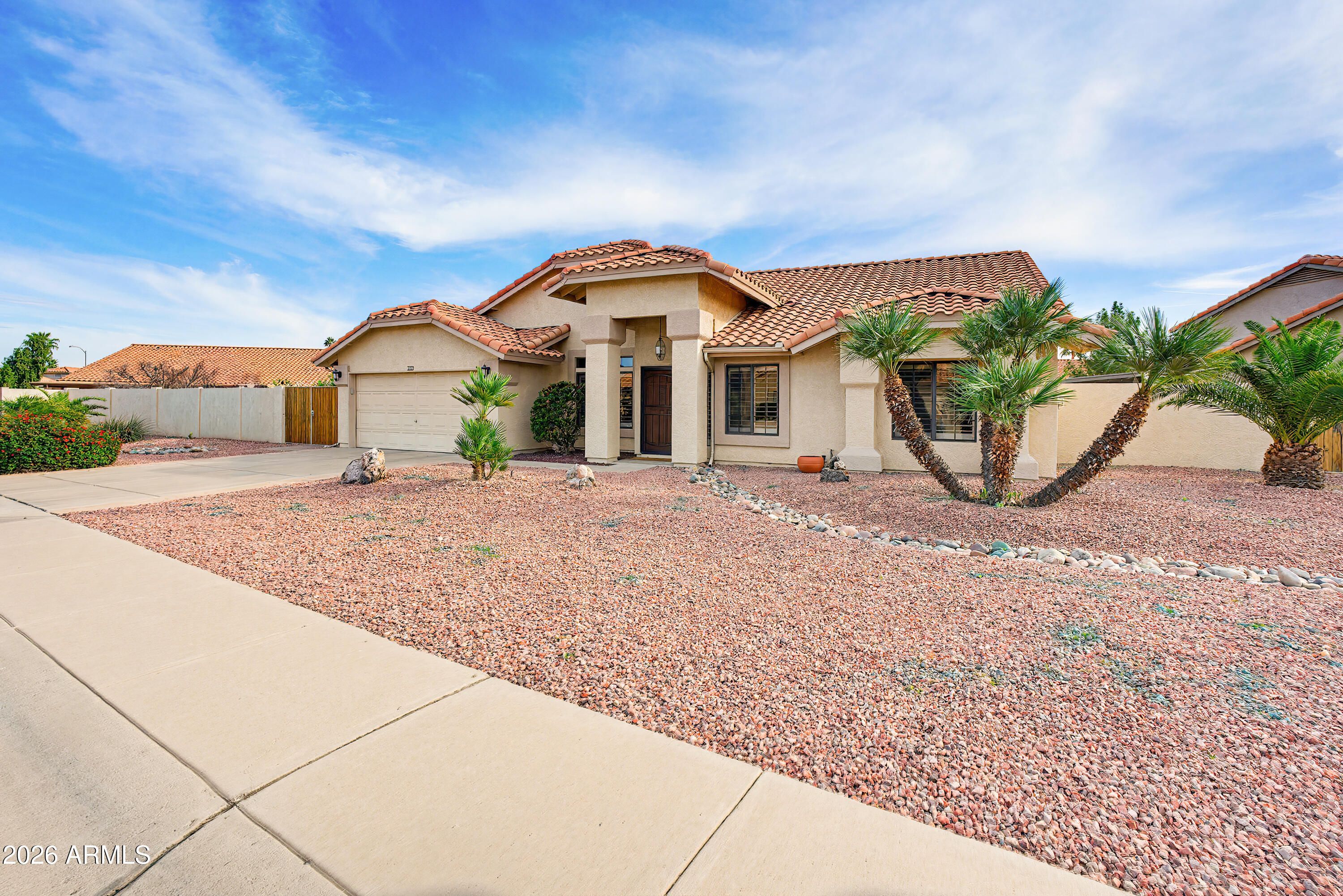 Great Curb appeal home with RV Gate, large corner lot with new irrigation system in Westbrook Village Golf community! Soaring ceilings, brick fireplace, remodeled bathrooms, new plantation shutters, wood tile flooring, and large lot all make for perfect living and entertaining! Fantastic screened in Arizona Room. Kitchen features a built-in serving cabinet, desk area, new appliances in 2022 and stylish counters. Washer/Dryer included in large laundry room with storage cabinets. Generous size bedrooms and ample closets. All of this and located in beautiful Westbrook Village with tons of ammenities including 2 huge pools and spas, 2 golf courses, pickelball, tennis and 50 plus groups to join and located close to the 101, restaurants, and shopping. This pristine home will not last!