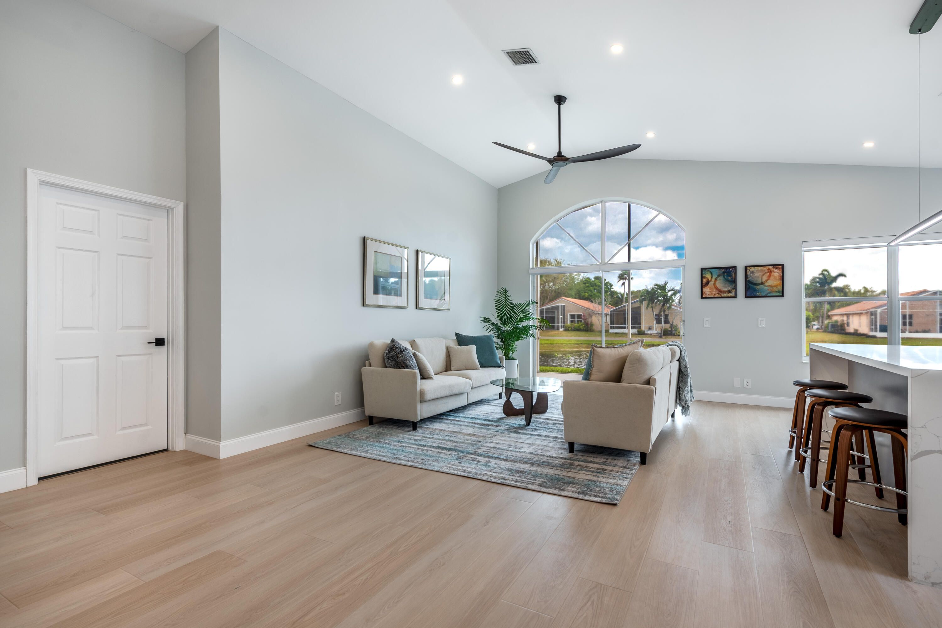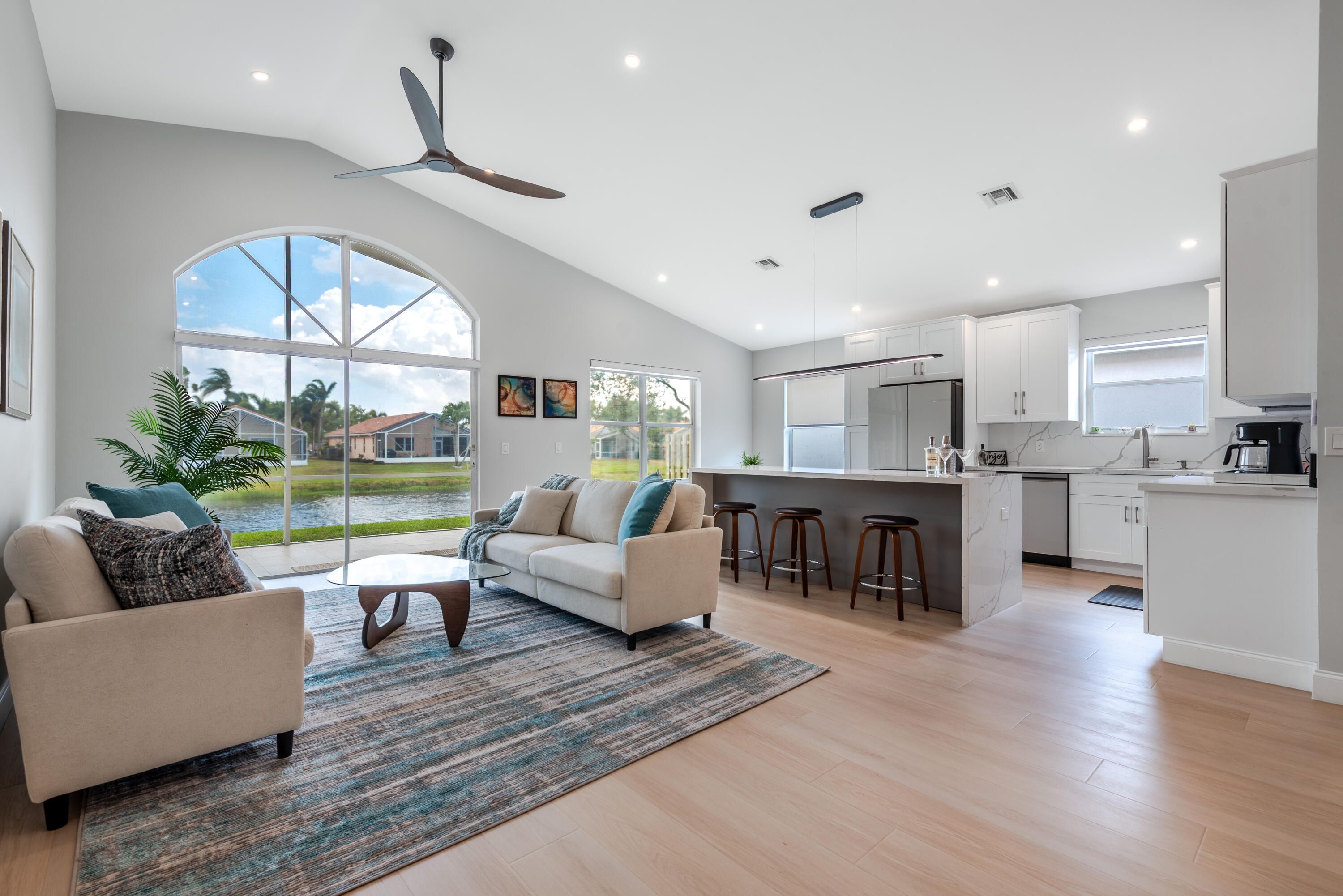 A stunning renovation, everything done to perfection, including a new roof and AC in 2024. Walk through the front door and you will see the beautiful lake view and fountain. Kitchen has been opened up and is a sleek, modern design with a huge island and quartz counters and backsplash. Bathrooms are spa-like with beatiful tile work and modern vanities. Very large model in community with expansive living space and a comfortable primary suite. The 3rd bedroom - den with double doors. Remote operated blinds thruout. Community - upgraded, active clubhouse with new pickleball courts and a large resort like pool. Friendly community. Recent quote to replace all windows with impact but owner travels regularly and has not done the work. Seller will credit amount to Buyer.