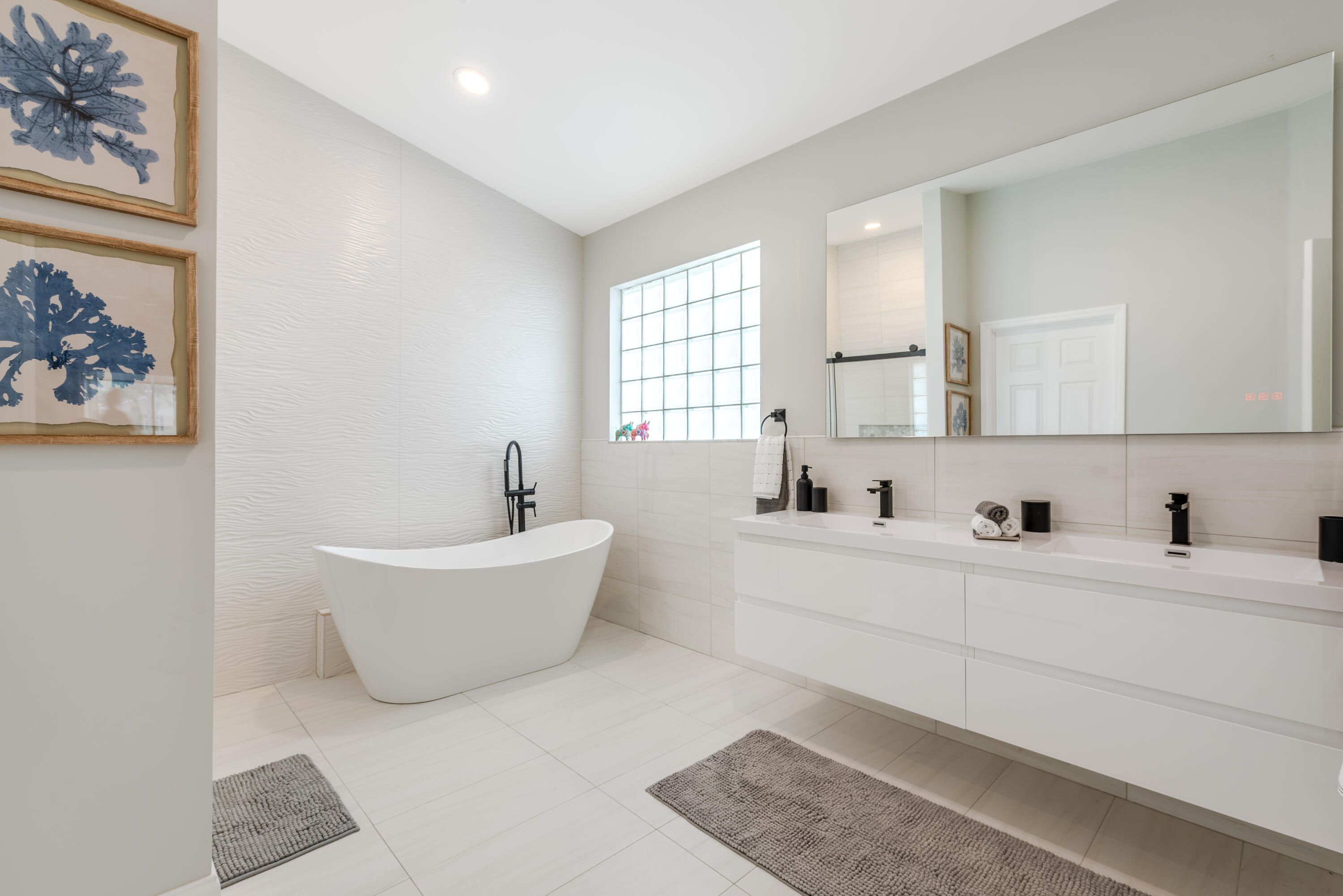 - High Ceilings, Walk-In Closet(s), Split Bedrooms, Closet Cabinetry, Custom Mirrors, Family/Dining Room, Dual Sinks, Main Level Primary, Separate Shower, Soaking Tub