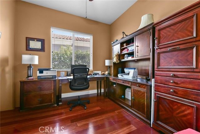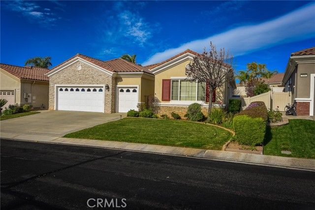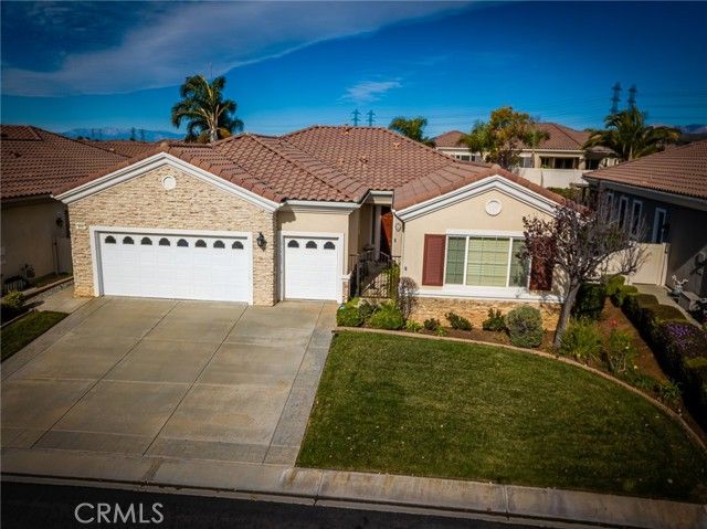 Welcome to this stunning 2-bedroom plus den, 2.5 bath residence located in the Solera 55+ gated community. This home offers two spacious primary suites, a generous sized den, high ceilings, walk in closets, and an open concept floor plan designed for both comfort and functionality. The kitchen is well-appointed with double built-in ovens, LG induction microwave and stove top, granite countertops, a large center island with seating, and abundant cabinetry and counter space. The laundry room includes a separate sink and additional storage. Additional features include a 2-car garage and dedicated golf cart parking. Step outside to a private backyard with a covered patio, ideal for morning coffee, weekend BBQs, or simply unwinding. The community features resort-style amenities such as tennis courts, bocce ball courts, billiards, a gym, indoor track, a clubhouse, meeting rooms, and a pool and spa. Conveniently located near the I-10 freeway, Cabazon outlets, Morongo Casino, and golf courses.