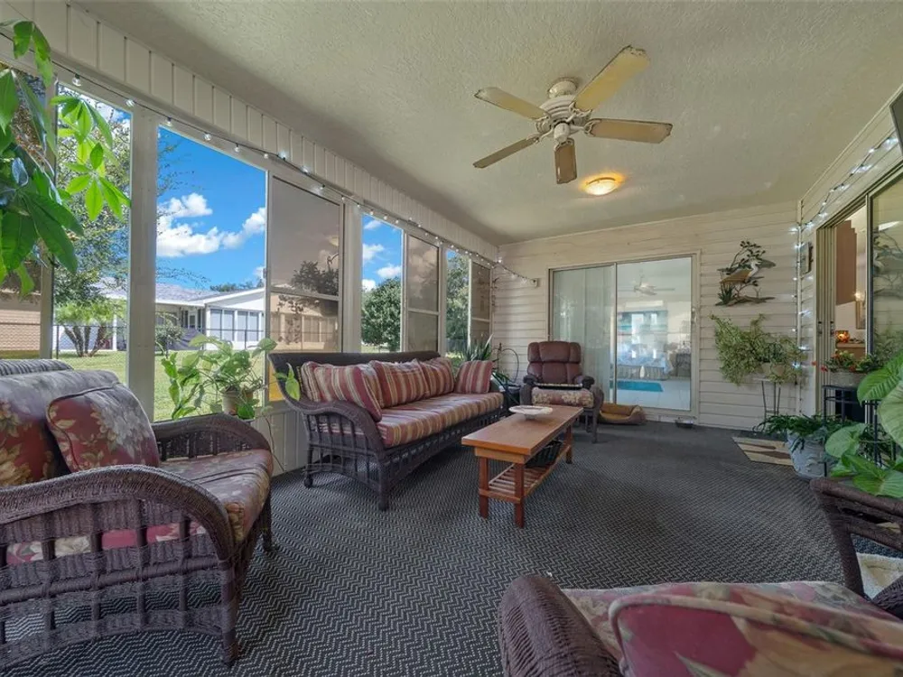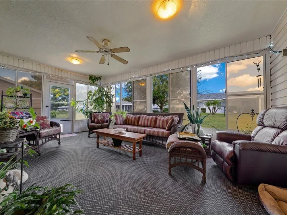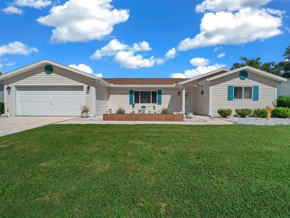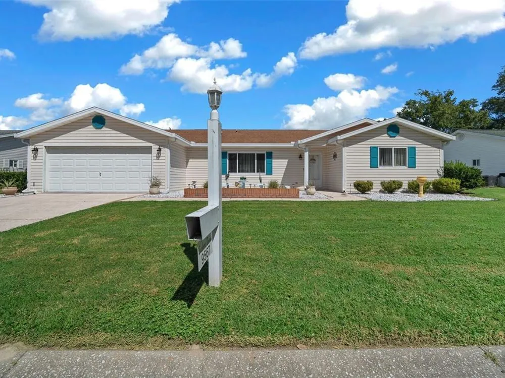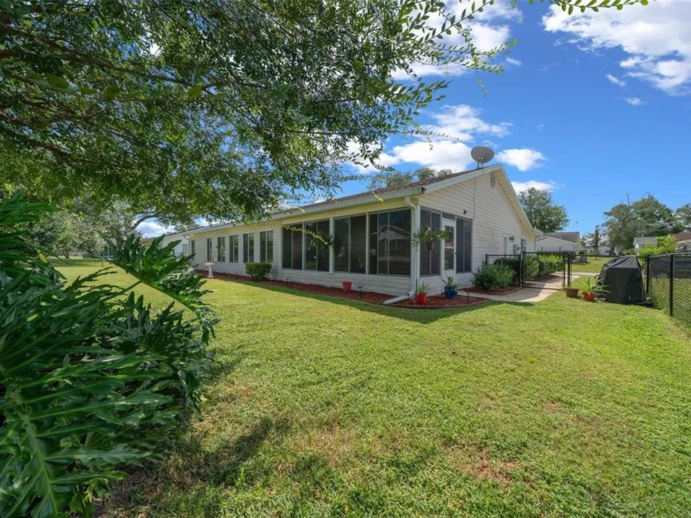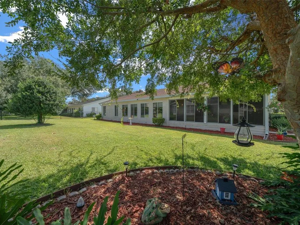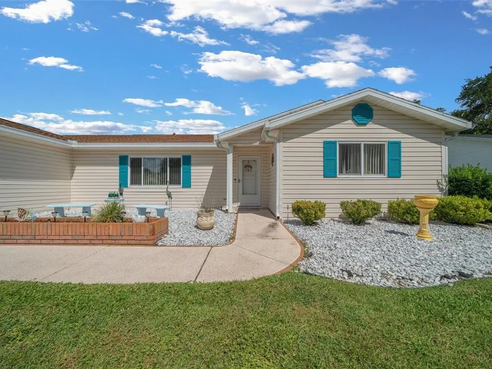 This this beautifully maintained 2-bedroom, 2-bath home is nestled in the heart of the vibrant 55+ gated community of Spruce Creek South in Summerfield, FL. This expanded Palm III model offers a spacious and inviting layout with vaulted ceilings, abundant natural light, and elegant crown molding accents throughout. The open-concept living and dining areas flow seamlessly into a bright, eat-in kitchen featuring ample cabinetry, pull-out drawers, and a pantry for effortless storage. Just off the living space, an enclosed sunroom with acrylic windows provides the perfect year-round spot to relax or entertain. The primary suite offers a peaceful retreat with a walk-in closet, additional storage, and a private bath with walk-in shower, while the guest bedroom also includes its own walk-in closet. A dedicated laundry room with utility sink and storage adds everyday convenience, and the oversized 2-car garage offers even more functionality. Outside, mature landscaping and a 2019 roof provide peace of mind and charming curb appeal. Residents of Spruce Creek South enjoy access to a clubhouse, fitness center, pool, tennis, pickleball, golf cart trails, and more — all with a low monthly HOA. Whether you're looking to unwind or stay active, this move-in-ready home delivers the perfect blend of comfort, style, and Florida lifestyle living.