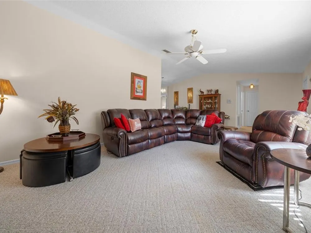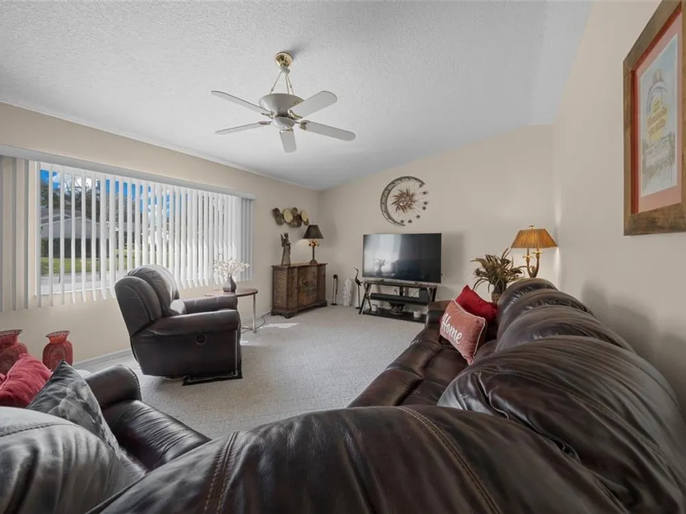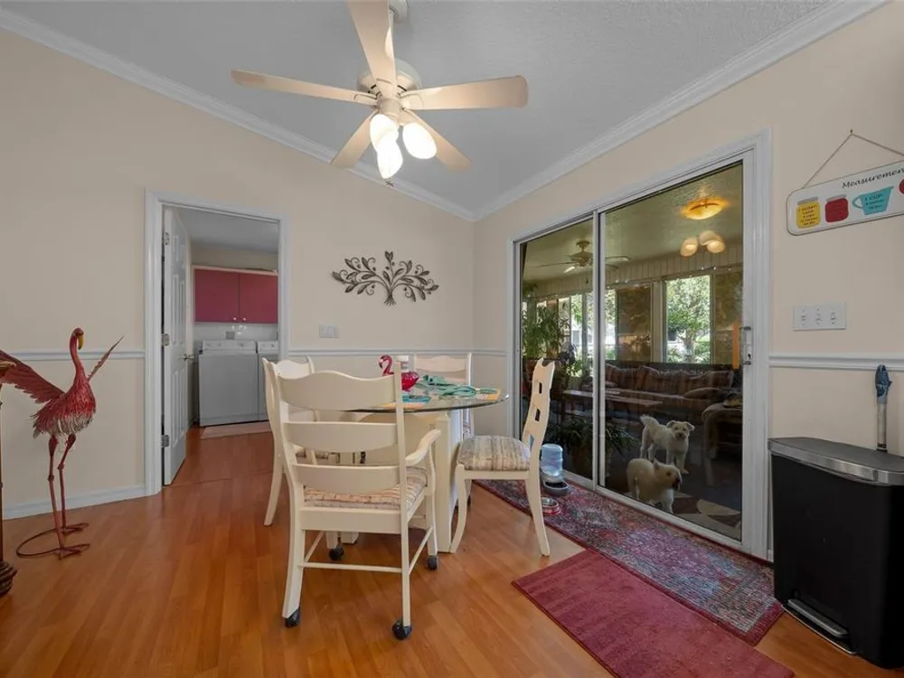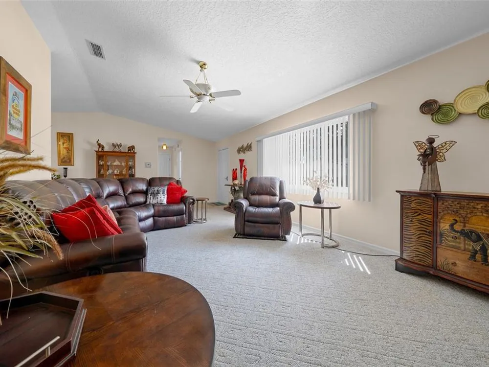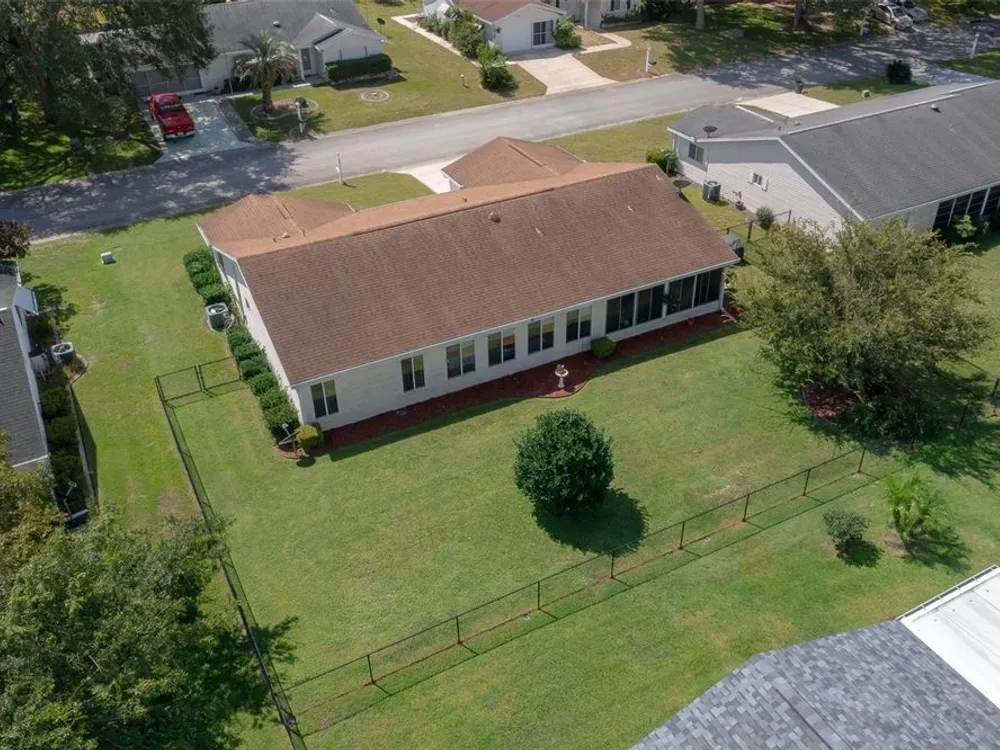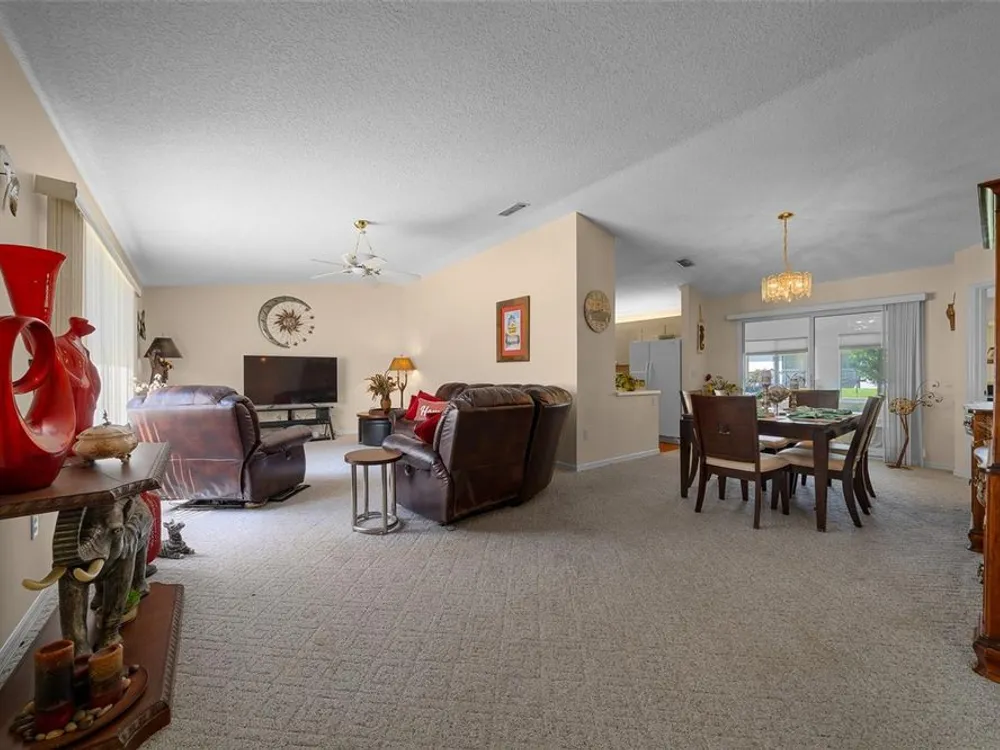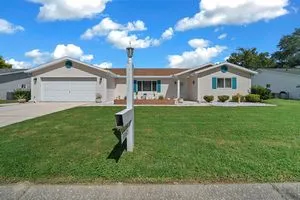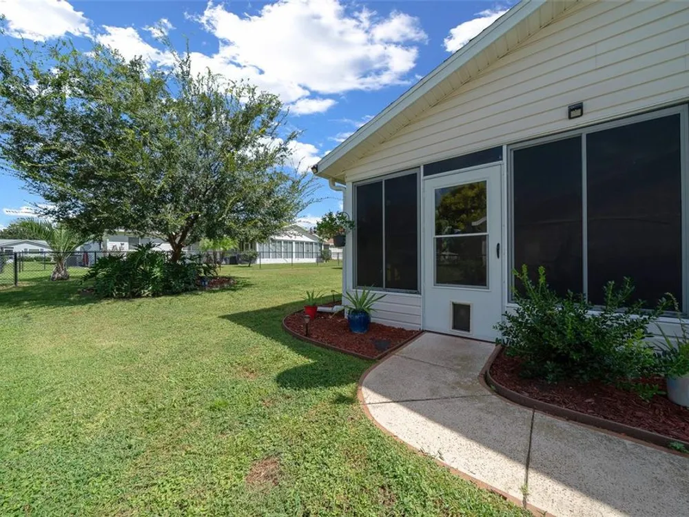 This this beautifully maintained 2-bedroom, 2-bath home is nestled in the heart of the vibrant 55+ gated community of Spruce Creek South in Summerfield, FL. This expanded Palm III model offers a spacious and inviting layout with vaulted ceilings, abundant natural light, and elegant crown molding accents throughout. The open-concept living and dining areas flow seamlessly into a bright, eat-in kitchen featuring ample cabinetry, pull-out drawers, and a pantry for effortless storage. Just off the living space, an enclosed sunroom with acrylic windows provides the perfect year-round spot to relax or entertain. The primary suite offers a peaceful retreat with a walk-in closet, additional storage, and a private bath with walk-in shower, while the guest bedroom also includes its own walk-in closet. A dedicated laundry room with utility sink and storage adds everyday convenience, and the oversized 2-car garage offers even more functionality. Outside, mature landscaping and a 2019 roof provide peace of mind and charming curb appeal. Residents of Spruce Creek South enjoy access to a clubhouse, fitness center, pool, tennis, pickleball, golf cart trails, and more — all with a low monthly HOA. Whether you're looking to unwind or stay active, this move-in-ready home delivers the perfect blend of comfort, style, and Florida lifestyle living.