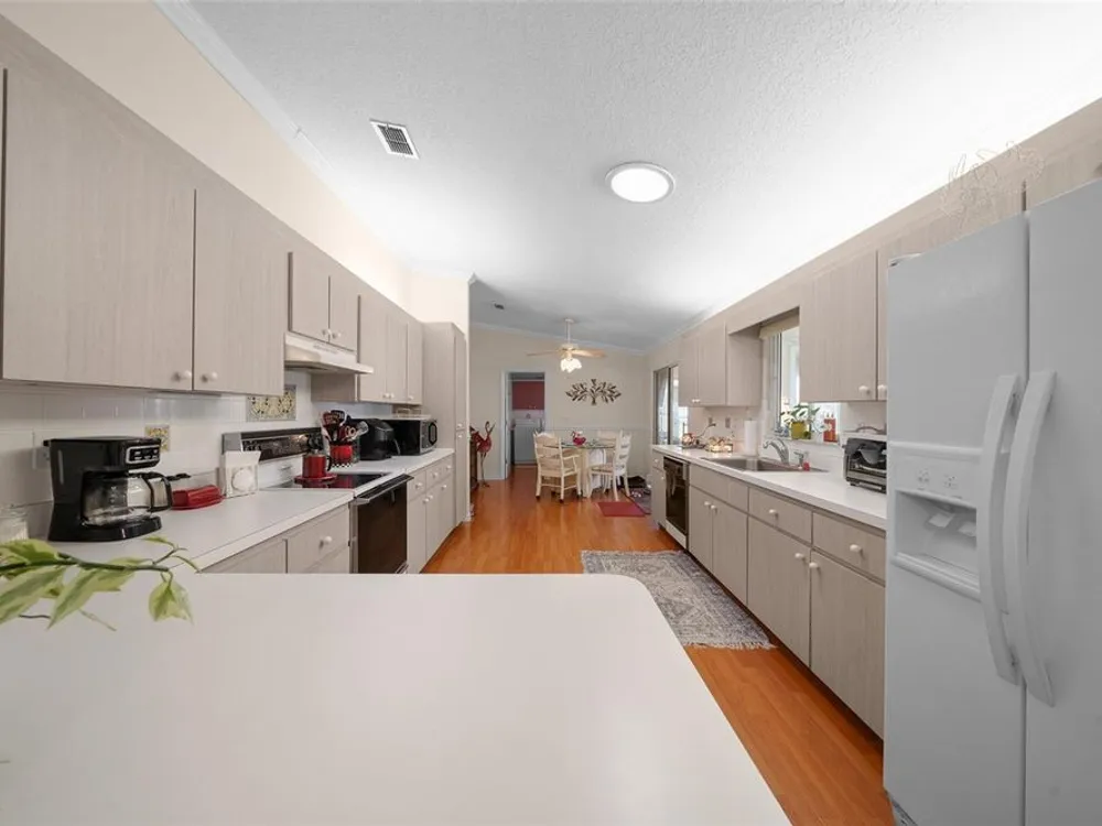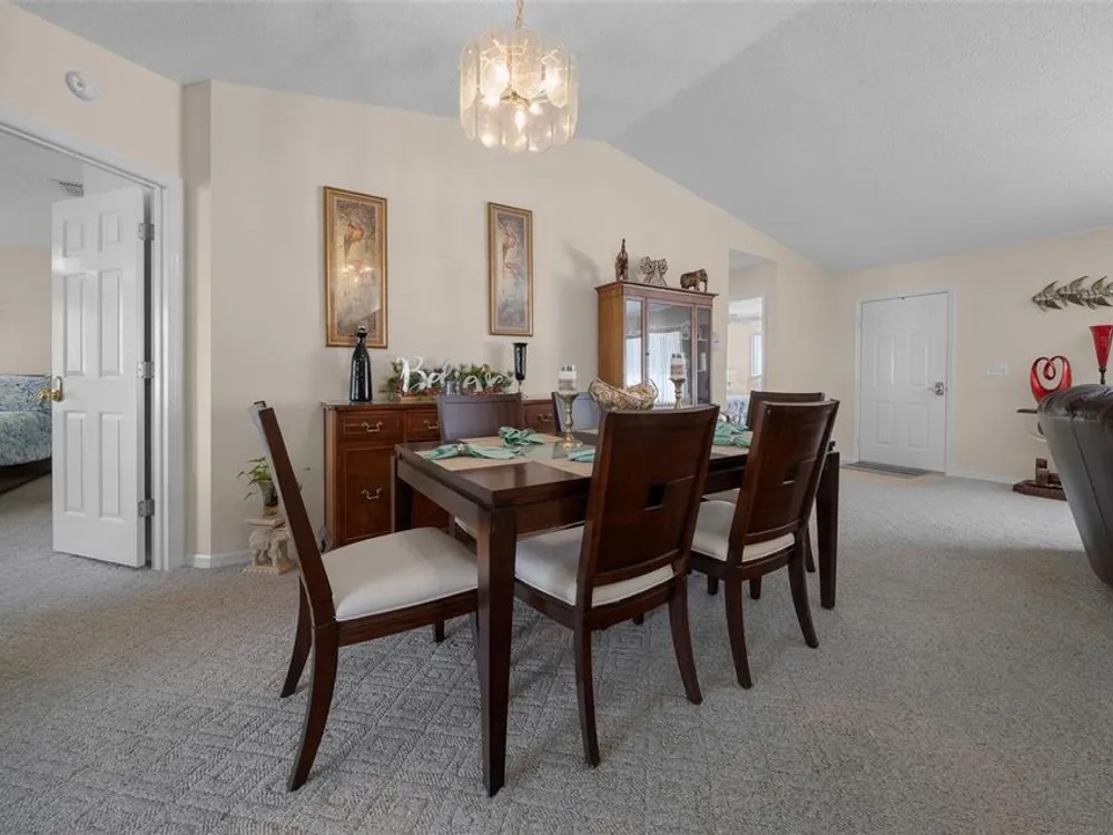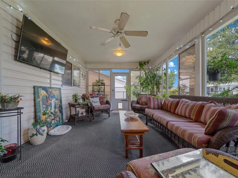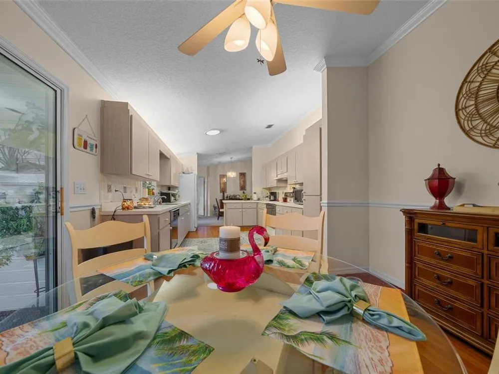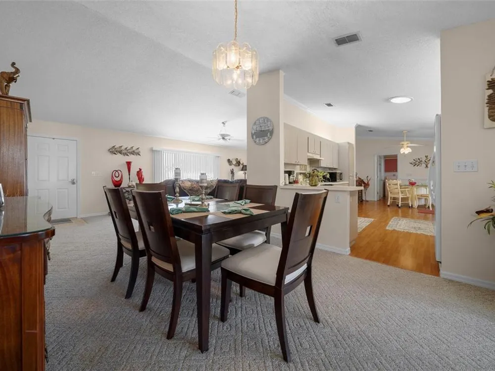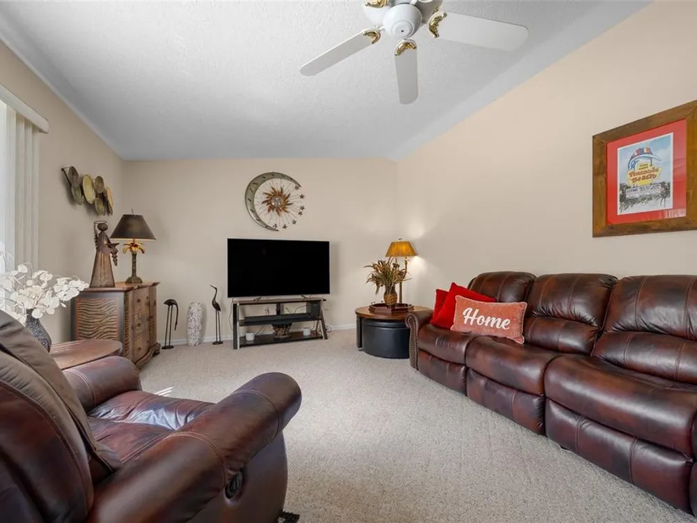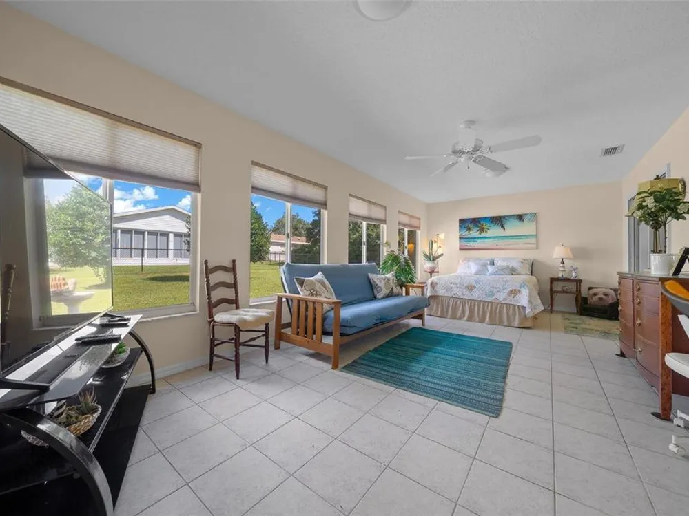 This this beautifully maintained 2-bedroom, 2-bath home is nestled in the heart of the vibrant 55+ gated community of Spruce Creek South in Summerfield, FL. This expanded Palm III model offers a spacious and inviting layout with vaulted ceilings, abundant natural light, and elegant crown molding accents throughout. The open-concept living and dining areas flow seamlessly into a bright, eat-in kitchen featuring ample cabinetry, pull-out drawers, and a pantry for effortless storage. Just off the living space, an enclosed sunroom with acrylic windows provides the perfect year-round spot to relax or entertain. The primary suite offers a peaceful retreat with a walk-in closet, additional storage, and a private bath with walk-in shower, while the guest bedroom also includes its own walk-in closet. A dedicated laundry room with utility sink and storage adds everyday convenience, and the oversized 2-car garage offers even more functionality. Outside, mature landscaping and a 2019 roof provide peace of mind and charming curb appeal. Residents of Spruce Creek South enjoy access to a clubhouse, fitness center, pool, tennis, pickleball, golf cart trails, and more — all with a low monthly HOA. Whether you're looking to unwind or stay active, this move-in-ready home delivers the perfect blend of comfort, style, and Florida lifestyle living.