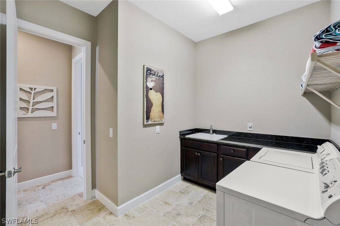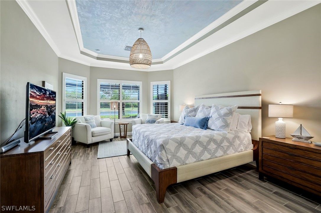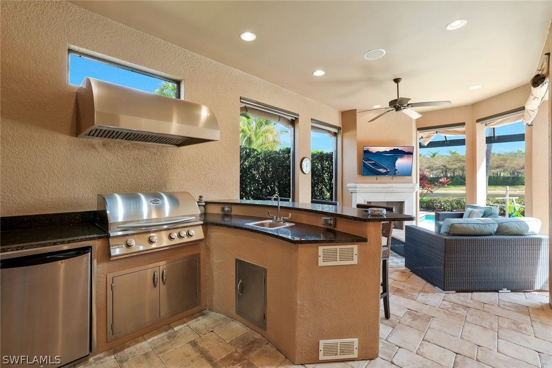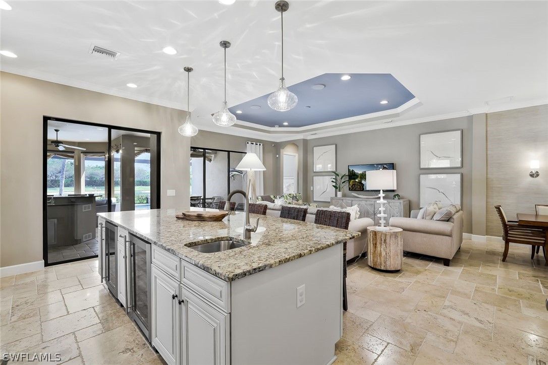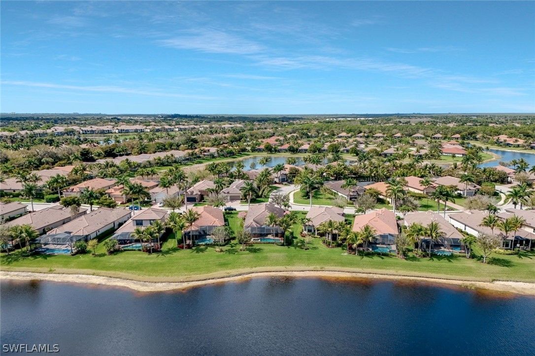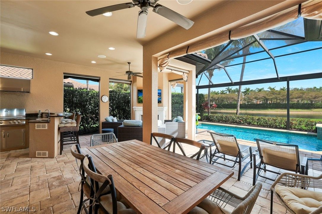 Enjoy captivating lake views from this impeccably turnkey with minor exceptions and elegantly appointed 3-bedroom-plus-den, 3-bath residence in Mussorie Village at Fiddler’s Creek, the prestigious gated community. This refined yet inviting home presents like a designer model and stands ready for immediate occupancy ideal as a sophisticated seasonal escape or distinguished year-round sanctuary. Signature elements include travertine tile flooring, graceful crown molding, trey ceilings, and refined coastal finishes that infuse the interiors with effortless elegance. The expansive, open-concept great room transitions seamlessly to the formal dining area and a chef-caliber kitchen boasting a substantial island, walk-in pantry, stainless-steel appliances, and dual wine coolers. The serene master suite features a private sitting area, generous walk-in closet, and a beautifully appointed en-suite bathroom with dual vanities and a striking large glass shower. Two additional bedrooms on the split plan ensure guest privacy with dedicated full baths. Outside awaits your private retreat: an expansive lanai complete with an outdoor kitchen and bar, saltwater pool and spa—all framed by tranquil lake views. The CDD bond is paid in full. Fiddler’s Creek offers unparalleled amenities, including tennis, pickleball, a clubhouse, state-of-the-art fitness center, resort-style pool, day spa, and both fine and casual dining. Optional golf, beach, and marina memberships are available.
