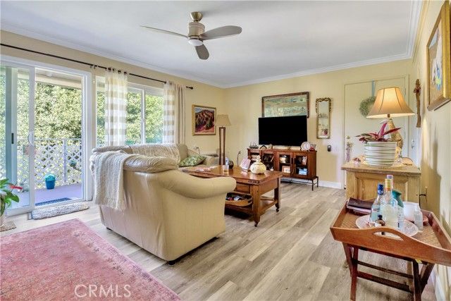 Perched above a lush greenbelt, this very popular second-floor Casa Contenta model offers a true treehouse in the woods feel with spectacular west-facing views from the private balcony. Just 14 easy-riser stairs lead to this beautifully updated home, ideally positioned on a quiet cul-de-sac atop a peaceful knoll. The light-filled living room features a wall of newer dual-pane sliding glass doors, framing serene views of mature trees and manicured greenbelt below. From the expansive deck, enjoy unobstructed vistas and tranquil sunsets in total privacy. Inside, the home offers two bedrooms and two bathrooms, smooth ceilings throughout, elegant crown molding, and easy-care wood-look laminate flooring. Sleek stainless-steel ceiling fans add a modern touch in both the living room and bedrooms. The updated kitchen showcases quartz countertops, a custom tile backsplash, and an opened ceiling with recessed lighting for bright, even illumination. Appliances include a glass cooktop, range hood, oven, dishwasher, and garbage disposal. A conveniently located stacked washer and dryer sit in a closet within the dressing area. Nestled within the active, award-winning senior community of Laguna Woods Village, residents enjoy a resort-style lifestyle with seven clubhouses, three gyms, five swimming pools, tennis courts, equestrian facilities, golf cart trails, and both 9-hole executive and 27-hole championship golf courses. HOA dues include water, sewer, trash, and basic cable with 100+ channels, along with fare-free bus service throughout the community. Pet-friendly, wonderfully walkable, and just five miles from the ocean, this safe and serene setting is close to shopping, restaurants, churches, and more.