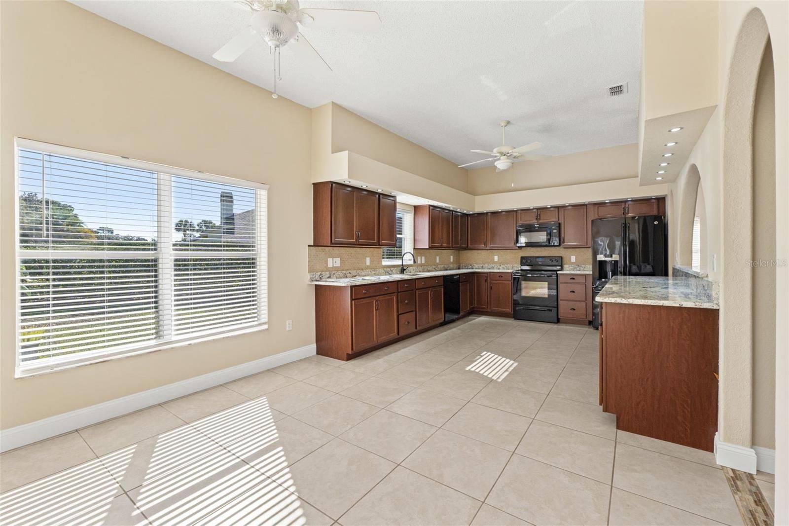 - Cathedral Ceiling(s), Ceiling Fan(s), Chair Rail, Eat-in Kitchen, Open Floorplan, Solid-Wood Cabinets, Split Bedrooms, Stone Counters, Walk-In Closet(s), Window Treatments