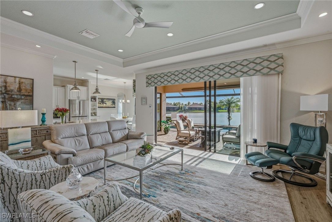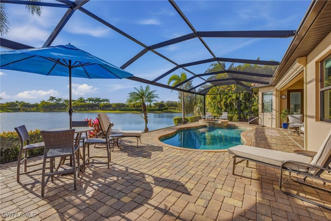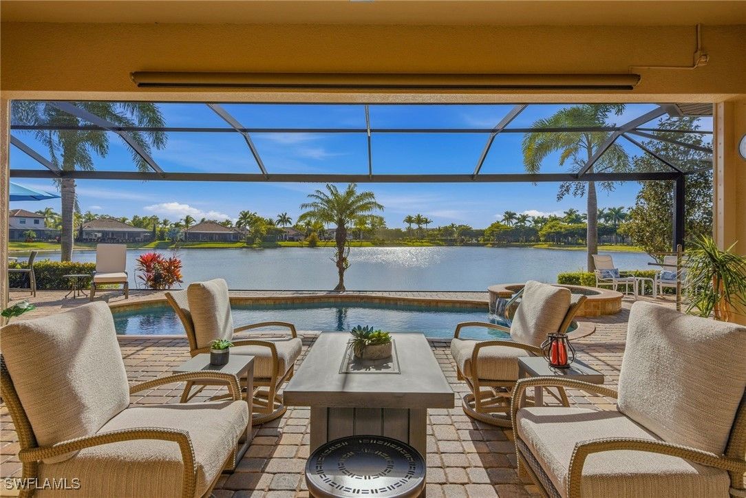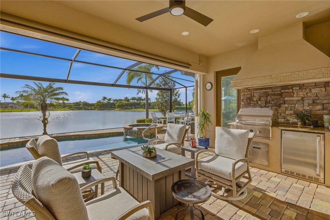 AMAZING WATER VIEWS, TPC GOLF MEMBERSHIP, SOLD TURNKEY AND UPGRADES! Just bring your suitcase and move right in! This stunning "Napoli" model home offers an unparalleled blend of luxury and comfort in the highly sought-after Treviso Bay Golf community with FULL TPC golf membership! From the moment you step into the foyer, you feel an immediate sense of sophistication with your eye drawn to the amazing water views! The open-concept design seamlessly connects the kitchen and living areas, making it ideal for both everyday living and elegant entertaining.This home has been very well maintained and thoughtfully upgraded! This home offers a split floor plan, newly painted interior and exterior and new vinyl flooring throughout! Both the primary closet and den have California Closet system installed. The chef’s kitchen is a true showpiece, featuring quartz countertops and backsplash, a natural gas stove, premium stainless steel appliances. The home has been professionally decorated with new lighting, Hunter Douglass shades, power drapery, designer furniture and accessories. The showcase lanai offers amazing water views through the newly added panoramic screened cage, Storm Smart hurricane shutters, outdoor kitchen with beverage cooler and a propane fire pit to relax after a long day! Complete replacement of Pool equipment including pump, heater, filter, pool/hot tub lights and addition of smart home pool control (wifi). The home is equipped with a Kohler generator providing whole house electrical backup, hurricane rated doors, windows and garage doors for peace of mind as well as a 220V electrical outlet in garage (for electric vehicle charging). For ease of living the HVAC is only 5 years old, addition of Lutron Smart home hub that allows for verbal control of lanai lights and internal art lights, additional recessed lighting and dimmers. There are so many upgrades you must see this lovely Home! This executive home comes with a TRANSFERABLE TPC GOLF MEMBERSHIP to enjoy! This entitles you to play the many TPC designated golf courses around the United States! Treviso Bay's Five Star amenities are second to none boasting the Villa Rilassare amenity center La Brezza resort style pool and full bar, professionally staffed fitness center, tennis courts, bocce, pickle ball, basketball and full spa services. The spectacular Treviso Bay TPC Golf clubhouse has two dining rooms, library, TPC pro shop, luxurious locker rooms and a breathtaking terrace over looking hole 9 and 18 to enjoy cocktails or fine dining. Just 5 miles away from Naples beautiful sandy beaches and fabulous 5th Ave shopping and restaurants! Just unpack your suitcase and enjoy!