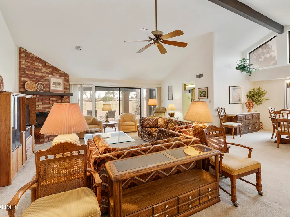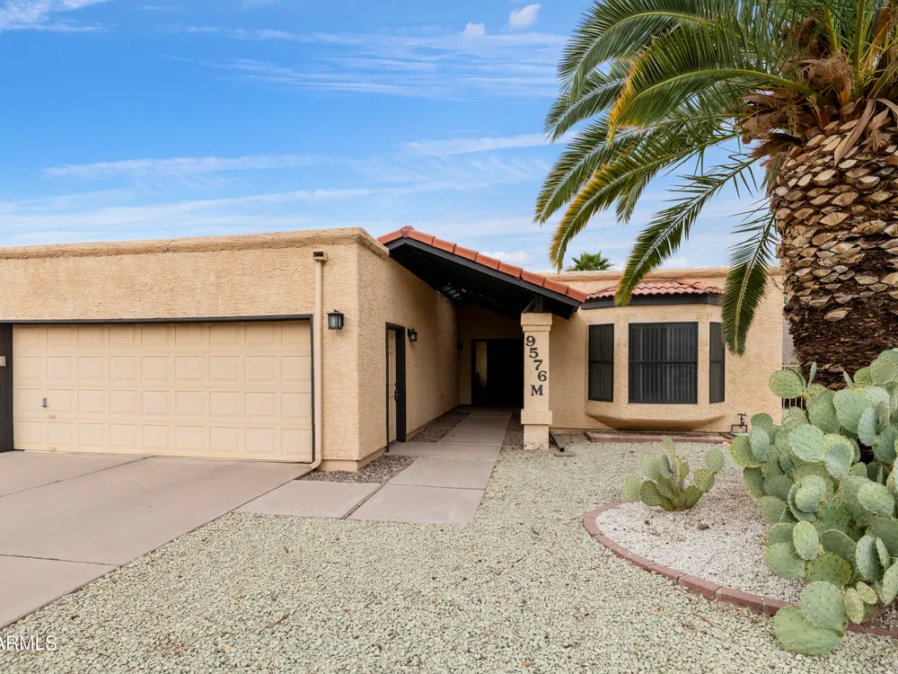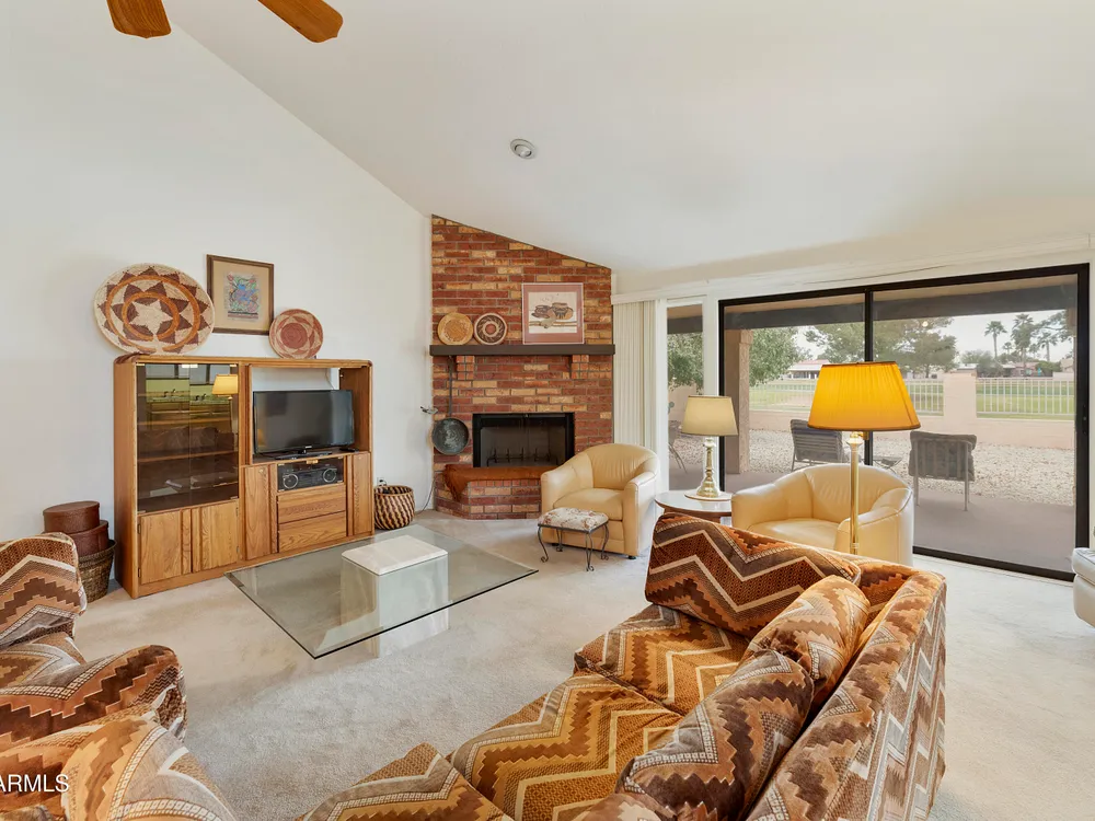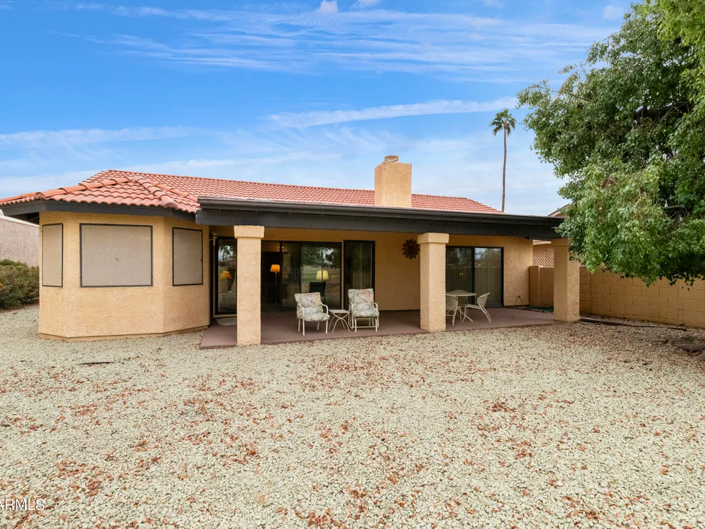 Golf Course gem! This rare 2BR, 2BA spacious split bedroom model on the golf course in the active adult community of Sun Lakes Country Club at Sun Lakes is a must see. Spacious Great Room with soaring vaulted ceilings, fireplace, wet bar and transom windows for amazing light. Cute kitchen with a breakfast nook perfect for morning coffee golf views. Large primary suite also has vaulted ceilings, dual sinks, walk-in shower, walk-in closet, and sliding doors to the fully covered patio with golf, mountain & sunset views. Roomy spare suite, split from the primary suite for maximum guest privacy, also has a bay window. Spare bath has doors to the hall and to the spare suite. Start enjoying the amazing amenities of Sun Lakes Country Club like golf, pools, tennis, pickleball and countless clubs.