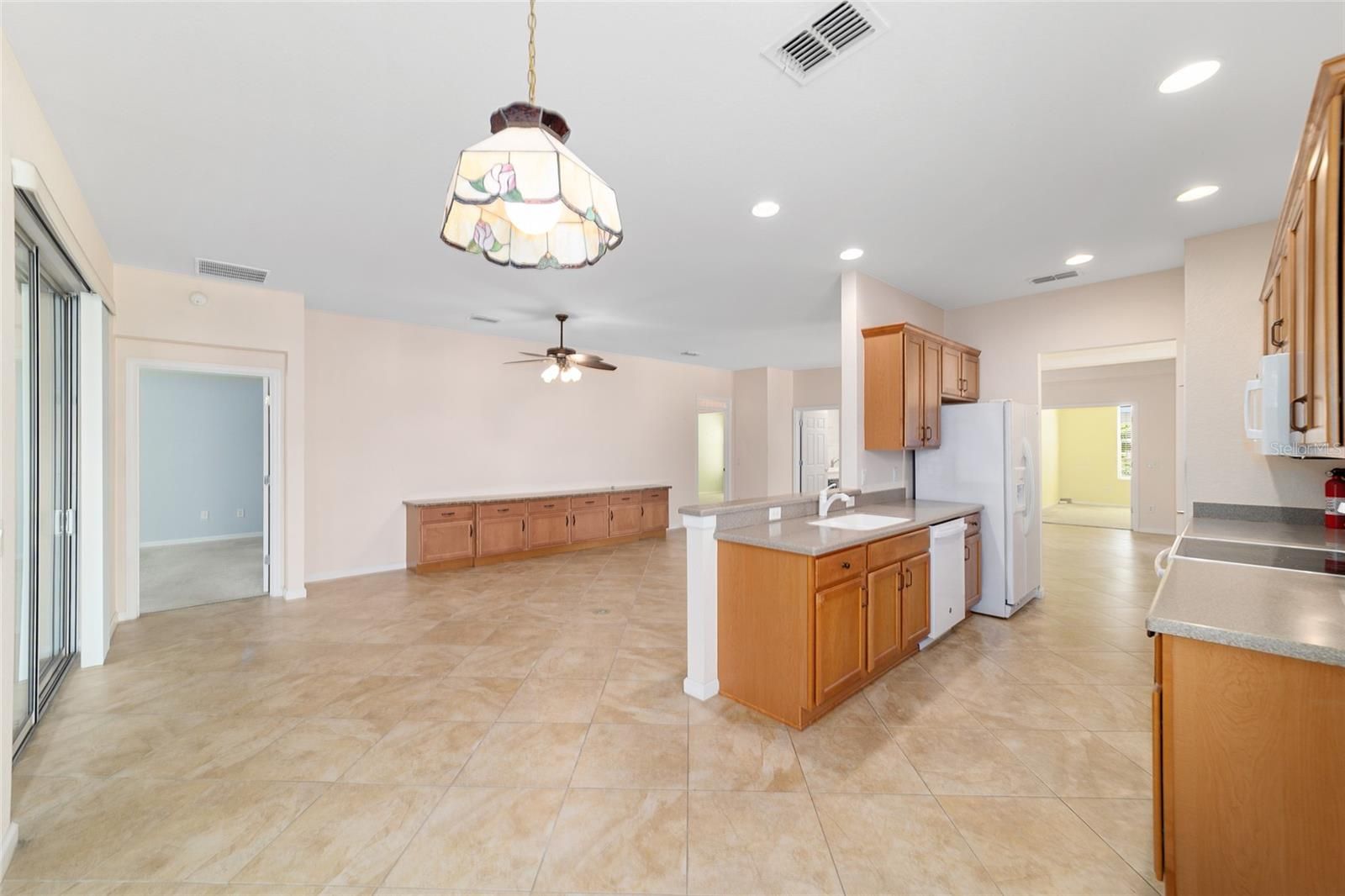 One or more photo(s) has been virtually staged. Florida ranks as the #1 best place to retire! Discover effortless living in the highly sought-after community of Del Webb Stone Creek, set in the heart of Ocala’s horse country with easy access to coastal beaches, shopping and entertainment. This move-in-ready Alexander Villa offers two bedrooms, two baths, a versatile flex room and a two-car garage. The open-concept floor plan features elegant tile flooring throughout the main living areas, a kitchen with Corian countertops, recessed lighting and a café nook, plus a formal dining space for gatherings. The living room opens to a large, enclosed lanai with floor-to-ceiling windows, transom details, and tile flooring—perfect for year-round enjoyment. The primary suite includes a walk-in closet and en-suite bath with updated glass shower doors (2020) and solid-surface vanity. A guest bedroom and bath provide comfort for visitors, while the flex room with French doors serves as an office, reading room, or extra guest space. The dedicated laundry room offers a utility sink and folding counter. Upgrades include a Franklin furnace (2019), Culligan water system, and a stylish credenza (2021). Maintenance-free living allows you more time to enjoy resort-style amenities: an 18-hole championship golf course, restaurant, pools, fitness, sports courts, clubs, and activities. Take your golf cart to the clubhouse for lunch, events or a round of golf and experience the lifestyle Stone Creek is known for. Close to the new Sprouts Farmer Market grocery store, Shalom Park, HCA Marion Hospital, and restaurants.