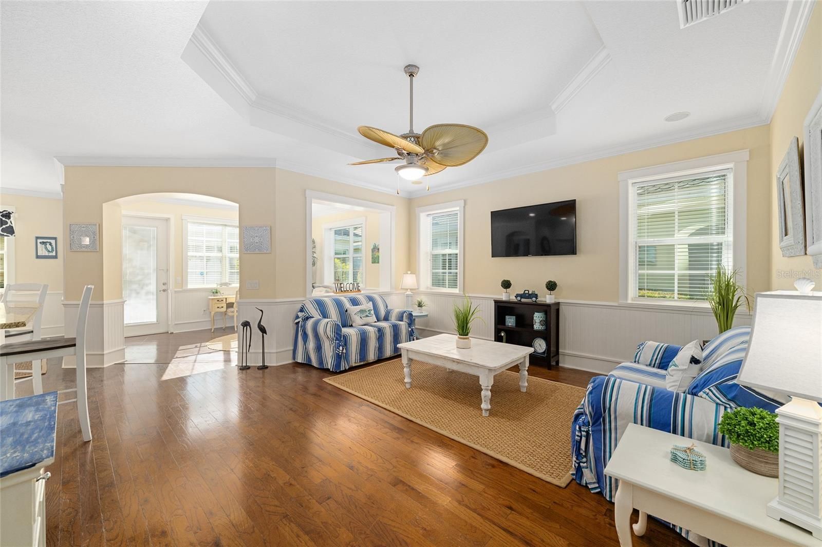 **RARE FIND** This charming TURN-KEY 3-bedroom, 2-bathroom Camden model comes with a spacious 2-car garage and is nestled in the highly desirable LAKE SHORE COTTAGES Village, right next to the lively LAKE SUMTER LANDING! Enjoy a hassle-free exterior with low maintenance and delightful curb appeal thanks to HARDIE PLANK SIDING, plus a lovely SCREENED front porch to relax and unwind. Inside, you'll love the bright and airy open floor plan featuring stunning HARDWOOD flooring throughout the living room, kitchen, and Florida room. The kitchen is a chef's dream with GRANITE countertops, a GAS stove, a handy closet PANTRY, beautiful white cabinets with pull-out shelves, a cozy breakfast bar, and sleek SS appliances. The primary suite offers a generous walk-in closet, dual vanity sinks, a spacious walk-in shower, and a private water closet for extra comfort. The two guest bedrooms at the front of the home include built-in closets, and the guest bath provides plenty of space for visitors to feel at home. Additional wonderful features include an HVAC system (2025), convenient inside laundry, elegant CROWN MOLDING, move-in readiness, a NEWER ROOF, and it’s situated directly across from the pool—plus, there’s NO BOND! This is a fantastic opportunity to become part of this highly sought-after community. Whether you're looking for a seasonal retreat, a full-time residence, or a smart investment rental, this home has so much to offer. Plus, it’s within walking or golf-cart distance to Lake Sumter Landing Market Square, where you can enjoy lively shopping, dining, live entertainment, and movie nights—making every day feel like a getaway!
