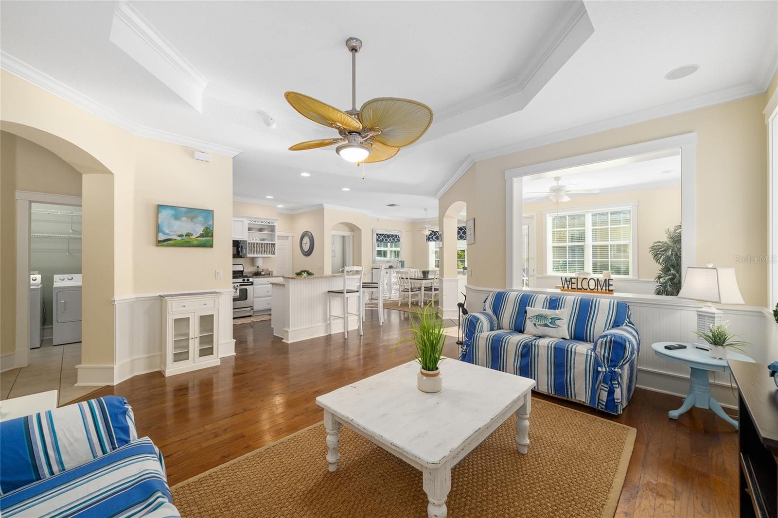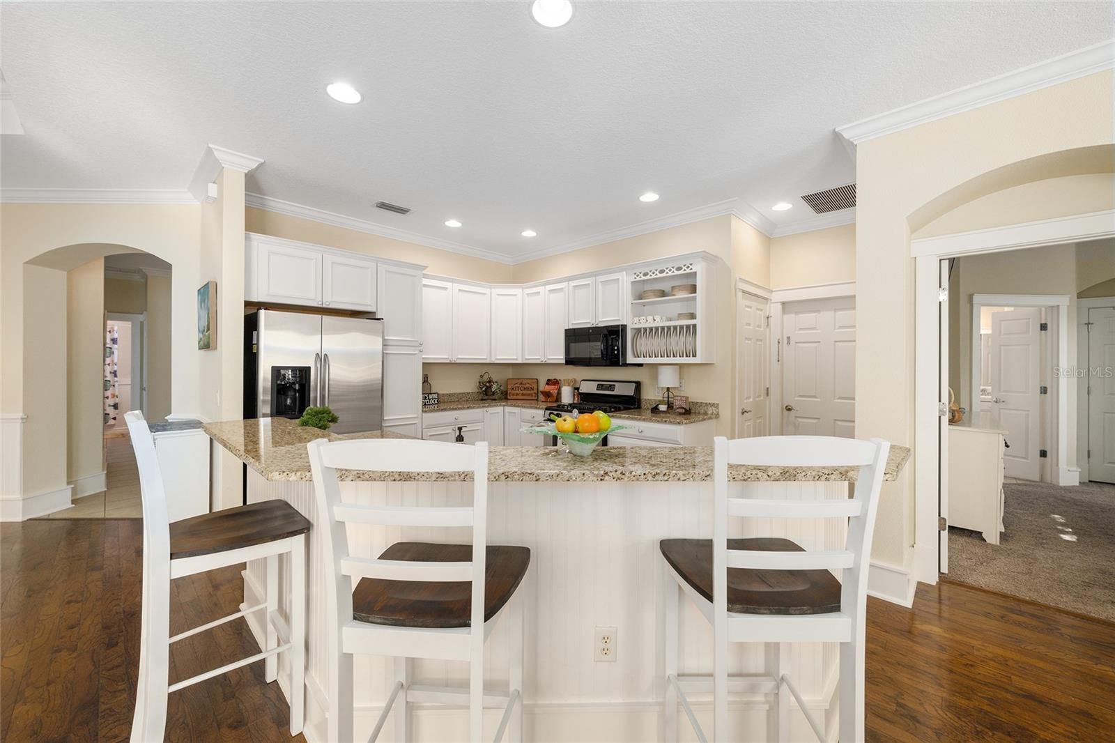 - Ceiling Fan(s), Crown Molding, Eat-in Kitchen, High Ceilings, Open Floorplan, Main Level Primary, Split Bedrooms, Stone Counters, Walk-In Closet(s)
