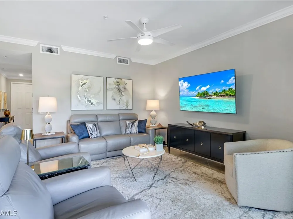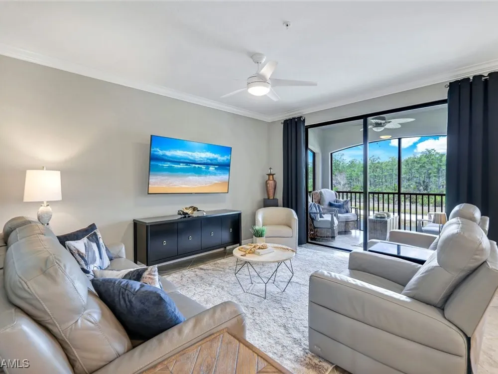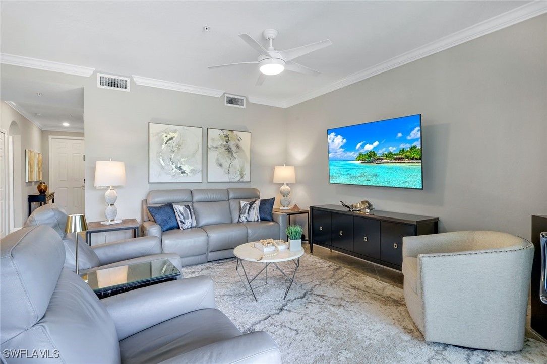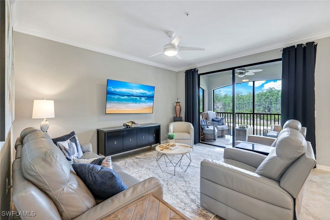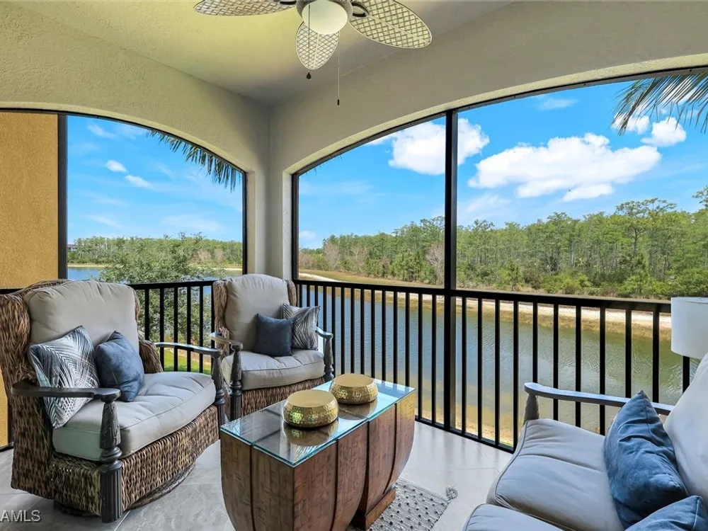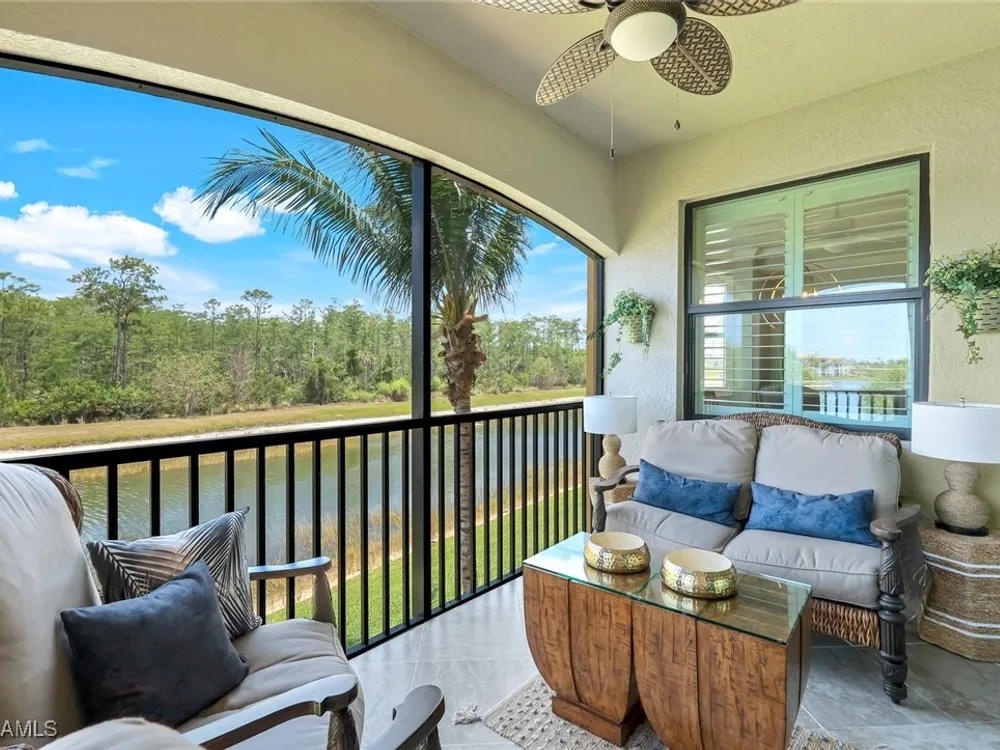 Welcome to Treviso Bay, an exquisite gated golf community in Naples, Florida, where resort-style living is redefined. This rarely available (Birkdale design) residence offers a sophisticated blend of luxury and comfort. The well appointed condo features 2 spacious bedrooms and 2 stylish bathrooms. Every detail has been meticulously curated, showcasing plantation shutters, an inviting tiled lanai, and no-see-um screens for your enjoyment. The spacious primary suite boasts new carpeting, while additional custom cabinetry and glass shower enclosures in the baths, enhance the home's refined aesthetic. Intricate moldings and ceiling fans add to the elegance, all enveloped in a professionally painted, tasteful palette. The open-concept layout is ideal for entertaining, with a stunning chef's kitchen at its heart. The expansive 4x9 quartz island serves as a centerpiece, illuminated by natural light from the dining rooms bay window. This space seamlessly flows into the great room, adorned with designer Natuzzi furnishings, creating a perfect setting for gatherings. Step outside to your private lanai and immerse yourself in serene views of nature, complete with a lighted floating waterfall and tranquil lake vistas. Treviso Bay is perfectly situated just minutes from Naples’ renowned white sand beaches, upscale shopping, and gourmet dining experiences. Beyond your doorstep, Treviso Bay offers an unparalleled lifestyle with world-class amenities including a resort-style pool and spa, polished-casual restaurant, tennis, pickleball, and bocce courts, as well as a state-of-the-art fitness center. Indulge in fine dining at the golf club or pamper yourself at the full-service salon and spa. Scenic walking/biking paths and community satellite pools enhance the outdoor experience. With its proximity to the boutiques, fine dining, and vibrant culture of downtown Naples, this residence is perfect for those seeking a full-time home, a seasonal retreat, or an investment opportunity. Embrace the ultimate resort lifestyle in one of Naples’ most prestigious communities. Your paradise awaits!