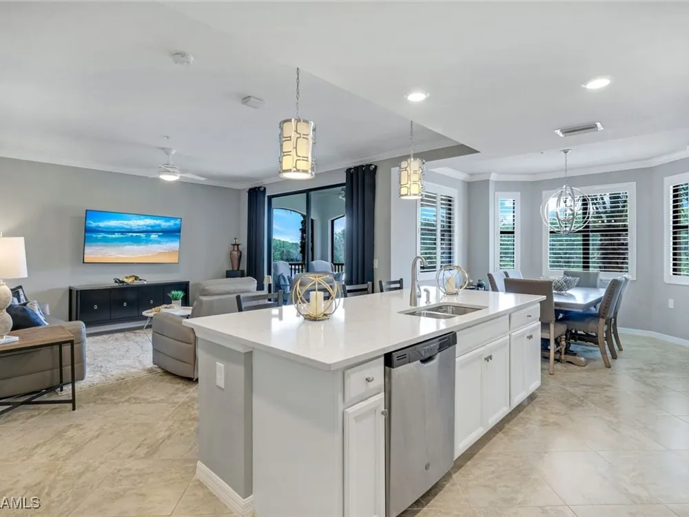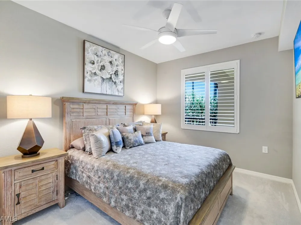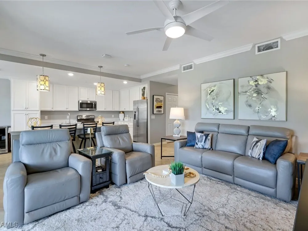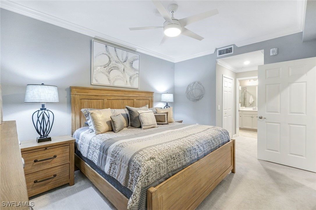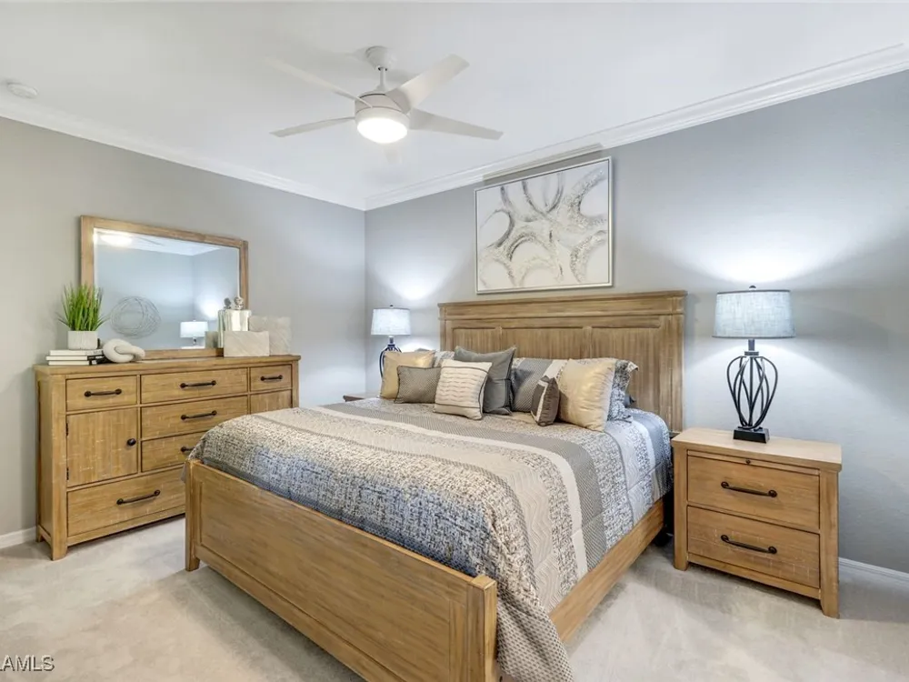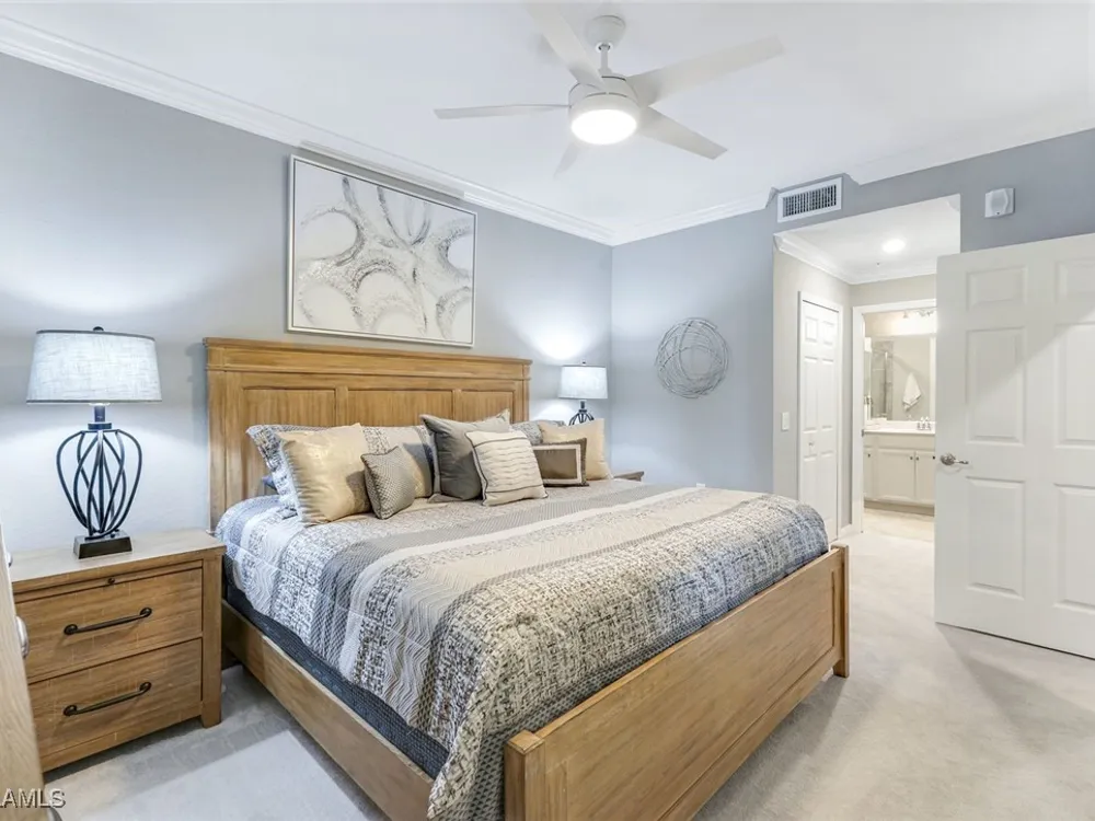 Welcome to Treviso Bay, an exquisite gated golf community in Naples, Florida, where resort-style living is redefined. This rarely available (Birkdale design) residence offers a sophisticated blend of luxury and comfort. The well appointed condo features 2 spacious bedrooms and 2 stylish bathrooms. Every detail has been meticulously curated, showcasing plantation shutters, an inviting tiled lanai, and no-see-um screens for your enjoyment. The spacious primary suite boasts new carpeting, while additional custom cabinetry and glass shower enclosures in the baths, enhance the home's refined aesthetic. Intricate moldings and ceiling fans add to the elegance, all enveloped in a professionally painted, tasteful palette. The open-concept layout is ideal for entertaining, with a stunning chef's kitchen at its heart. The expansive 4x9 quartz island serves as a centerpiece, illuminated by natural light from the dining rooms bay window. This space seamlessly flows into the great room, adorned with designer Natuzzi furnishings, creating a perfect setting for gatherings. Step outside to your private lanai and immerse yourself in serene views of nature, complete with a lighted floating waterfall and tranquil lake vistas. Treviso Bay is perfectly situated just minutes from Naples’ renowned white sand beaches, upscale shopping, and gourmet dining experiences. Beyond your doorstep, Treviso Bay offers an unparalleled lifestyle with world-class amenities including a resort-style pool and spa, polished-casual restaurant, tennis, pickleball, and bocce courts, as well as a state-of-the-art fitness center. Indulge in fine dining at the golf club or pamper yourself at the full-service salon and spa. Scenic walking/biking paths and community satellite pools enhance the outdoor experience. With its proximity to the boutiques, fine dining, and vibrant culture of downtown Naples, this residence is perfect for those seeking a full-time home, a seasonal retreat, or an investment opportunity. Embrace the ultimate resort lifestyle in one of Naples’ most prestigious communities. Your paradise awaits!