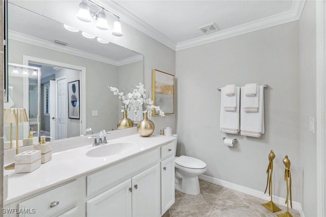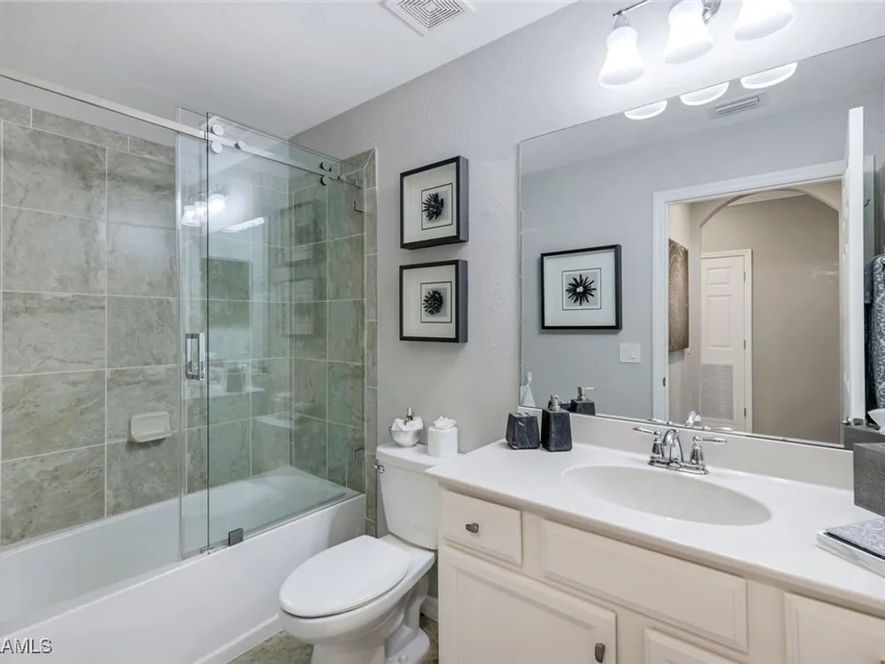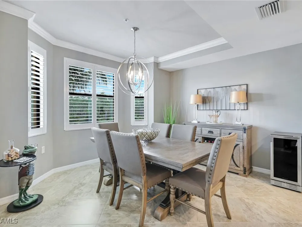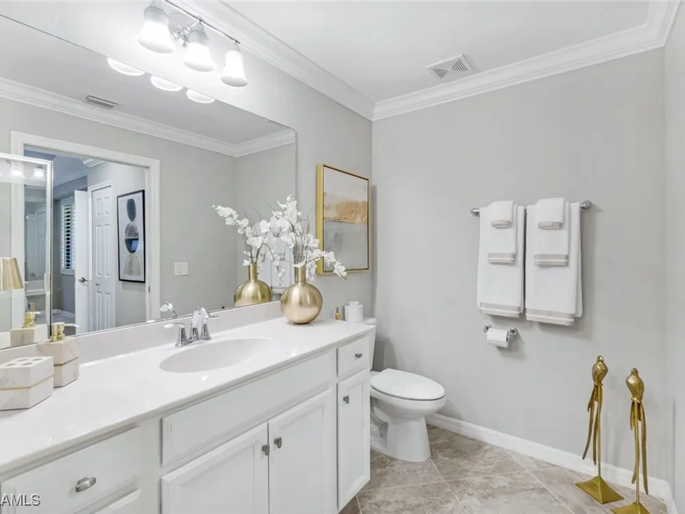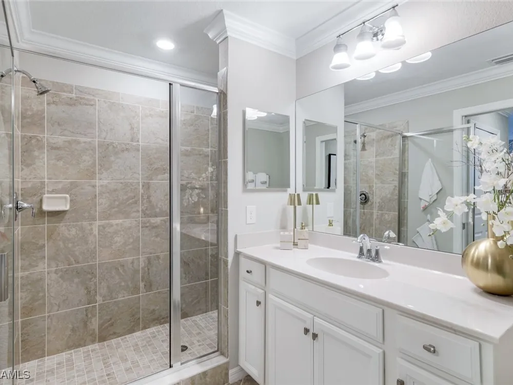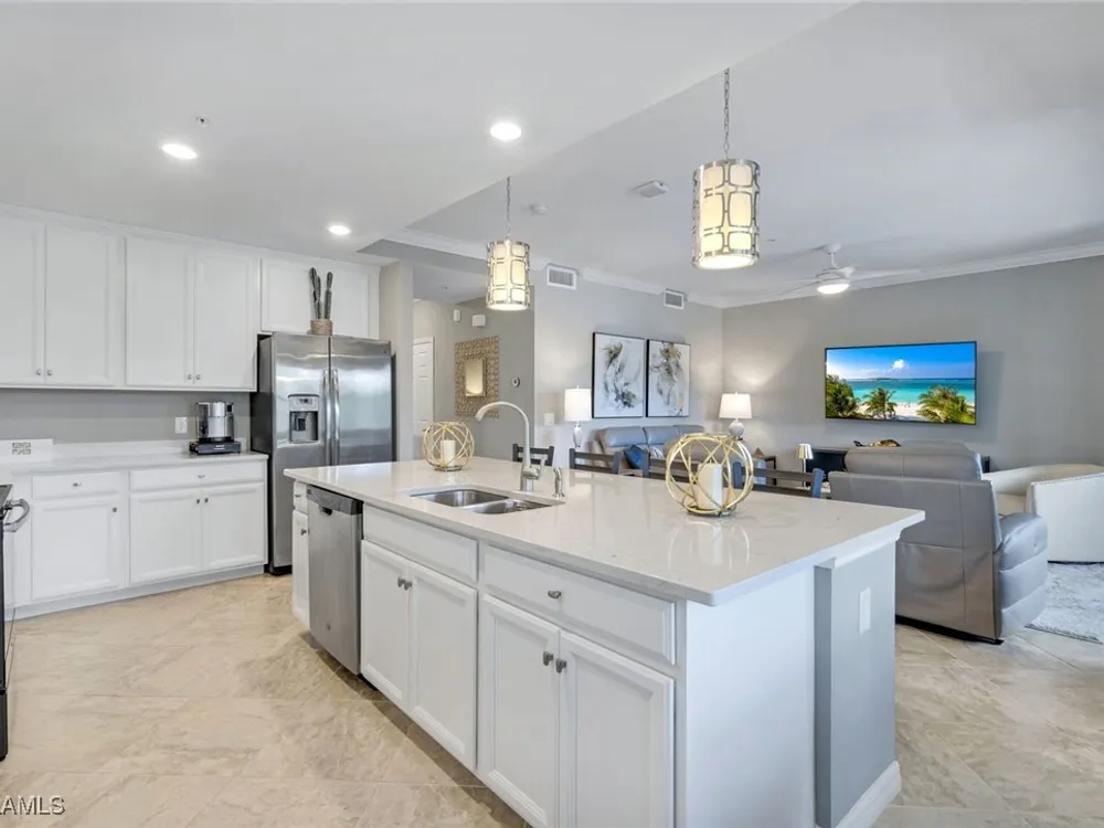 Welcome to Treviso Bay, an exquisite gated golf community in Naples, Florida, where resort-style living is redefined. This rarely available (Birkdale design) residence offers a sophisticated blend of luxury and comfort. The well appointed condo features 2 spacious bedrooms and 2 stylish bathrooms. Every detail has been meticulously curated, showcasing plantation shutters, an inviting tiled lanai, and no-see-um screens for your enjoyment. The spacious primary suite boasts new carpeting, while additional custom cabinetry and glass shower enclosures in the baths, enhance the home's refined aesthetic. Intricate moldings and ceiling fans add to the elegance, all enveloped in a professionally painted, tasteful palette. The open-concept layout is ideal for entertaining, with a stunning chef's kitchen at its heart. The expansive 4x9 quartz island serves as a centerpiece, illuminated by natural light from the dining rooms bay window. This space seamlessly flows into the great room, adorned with designer Natuzzi furnishings, creating a perfect setting for gatherings. Step outside to your private lanai and immerse yourself in serene views of nature, complete with a lighted floating waterfall and tranquil lake vistas. Treviso Bay is perfectly situated just minutes from Naples’ renowned white sand beaches, upscale shopping, and gourmet dining experiences. Beyond your doorstep, Treviso Bay offers an unparalleled lifestyle with world-class amenities including a resort-style pool and spa, polished-casual restaurant, tennis, pickleball, and bocce courts, as well as a state-of-the-art fitness center. Indulge in fine dining at the golf club or pamper yourself at the full-service salon and spa. Scenic walking/biking paths and community satellite pools enhance the outdoor experience. With its proximity to the boutiques, fine dining, and vibrant culture of downtown Naples, this residence is perfect for those seeking a full-time home, a seasonal retreat, or an investment opportunity. Embrace the ultimate resort lifestyle in one of Naples’ most prestigious communities. Your paradise awaits!