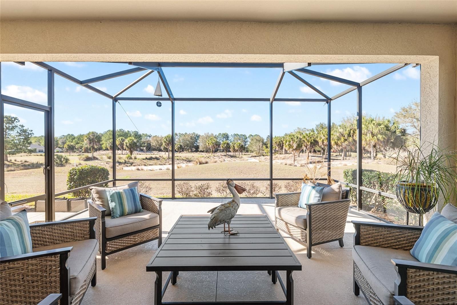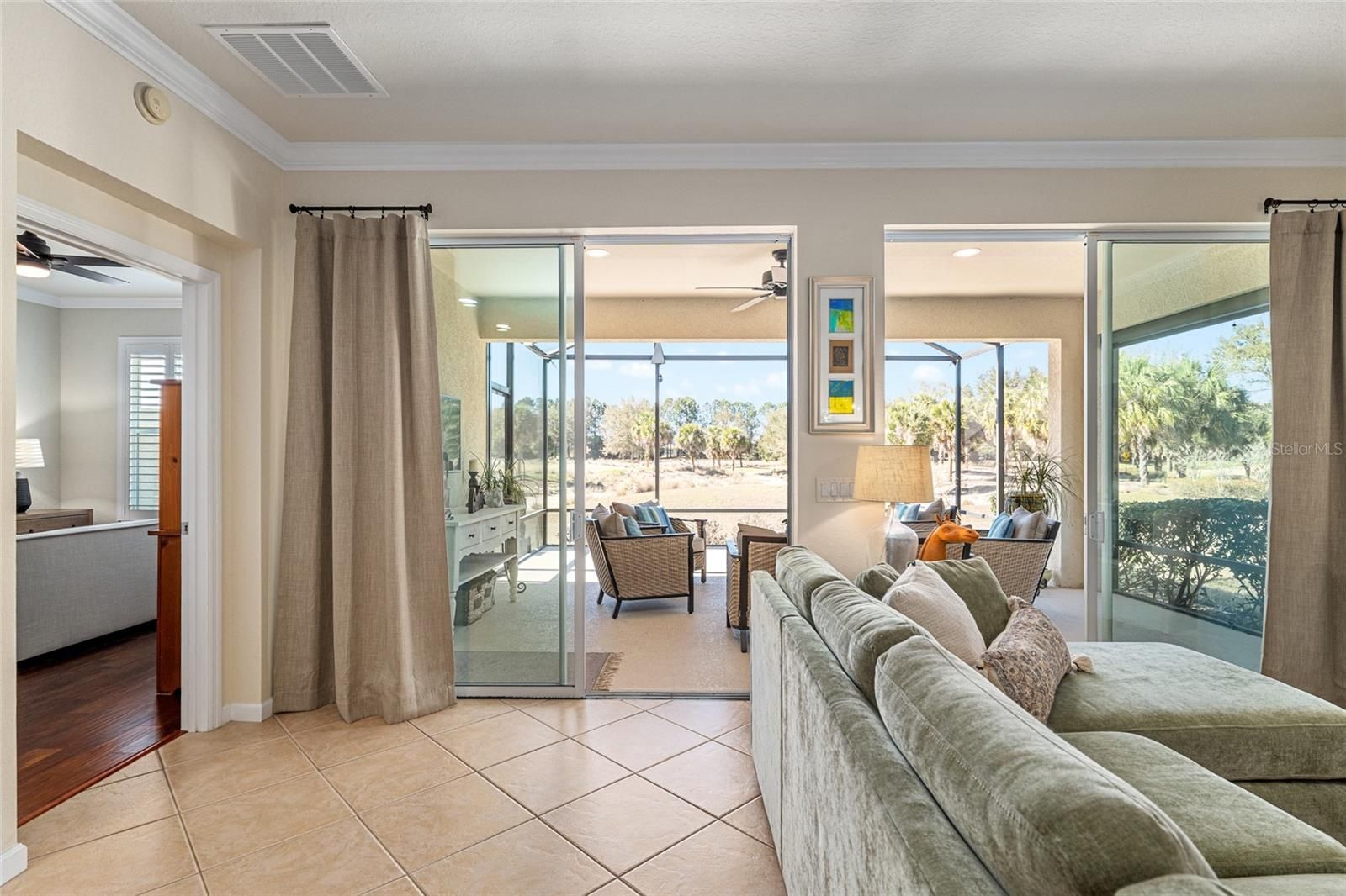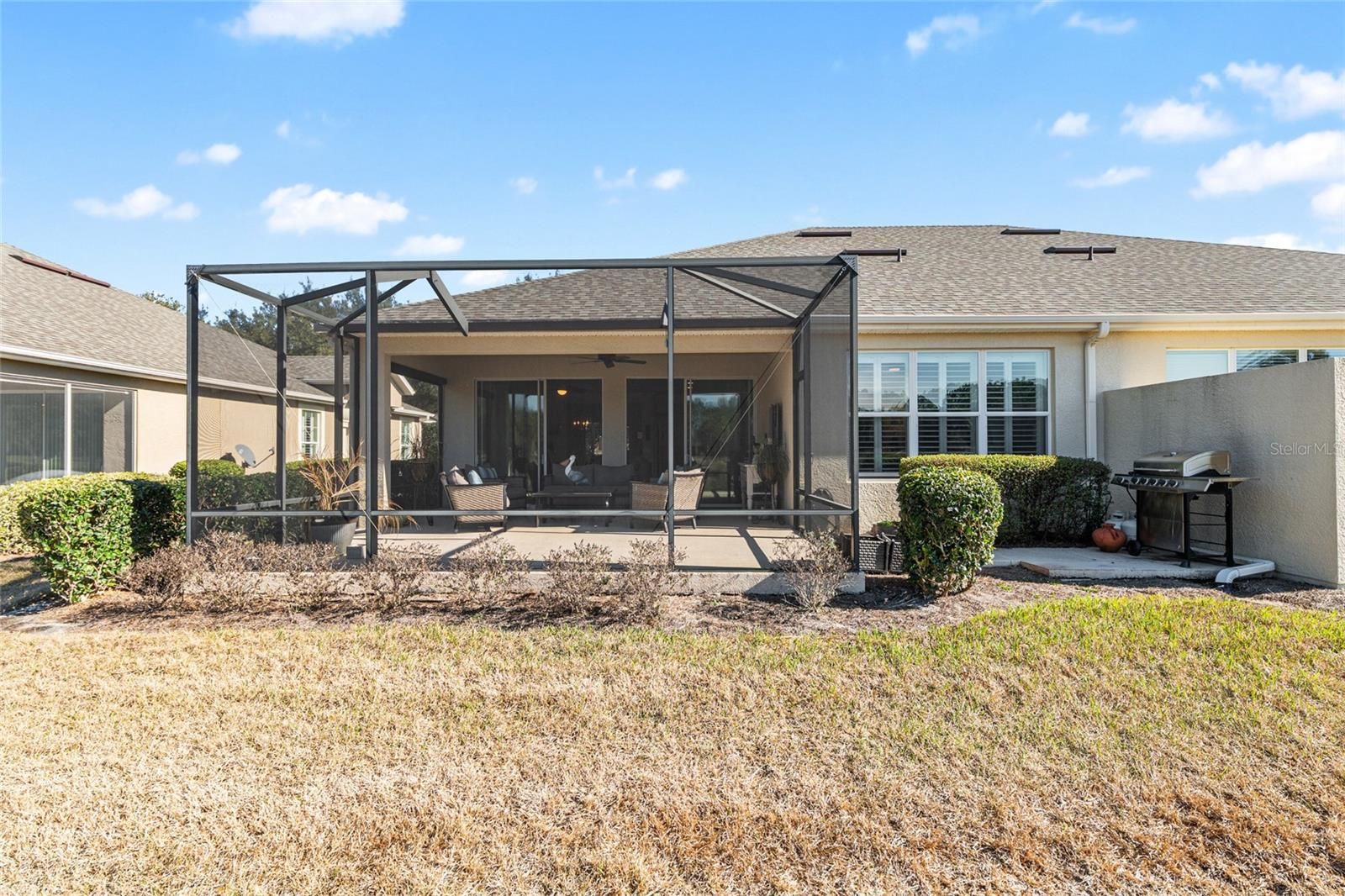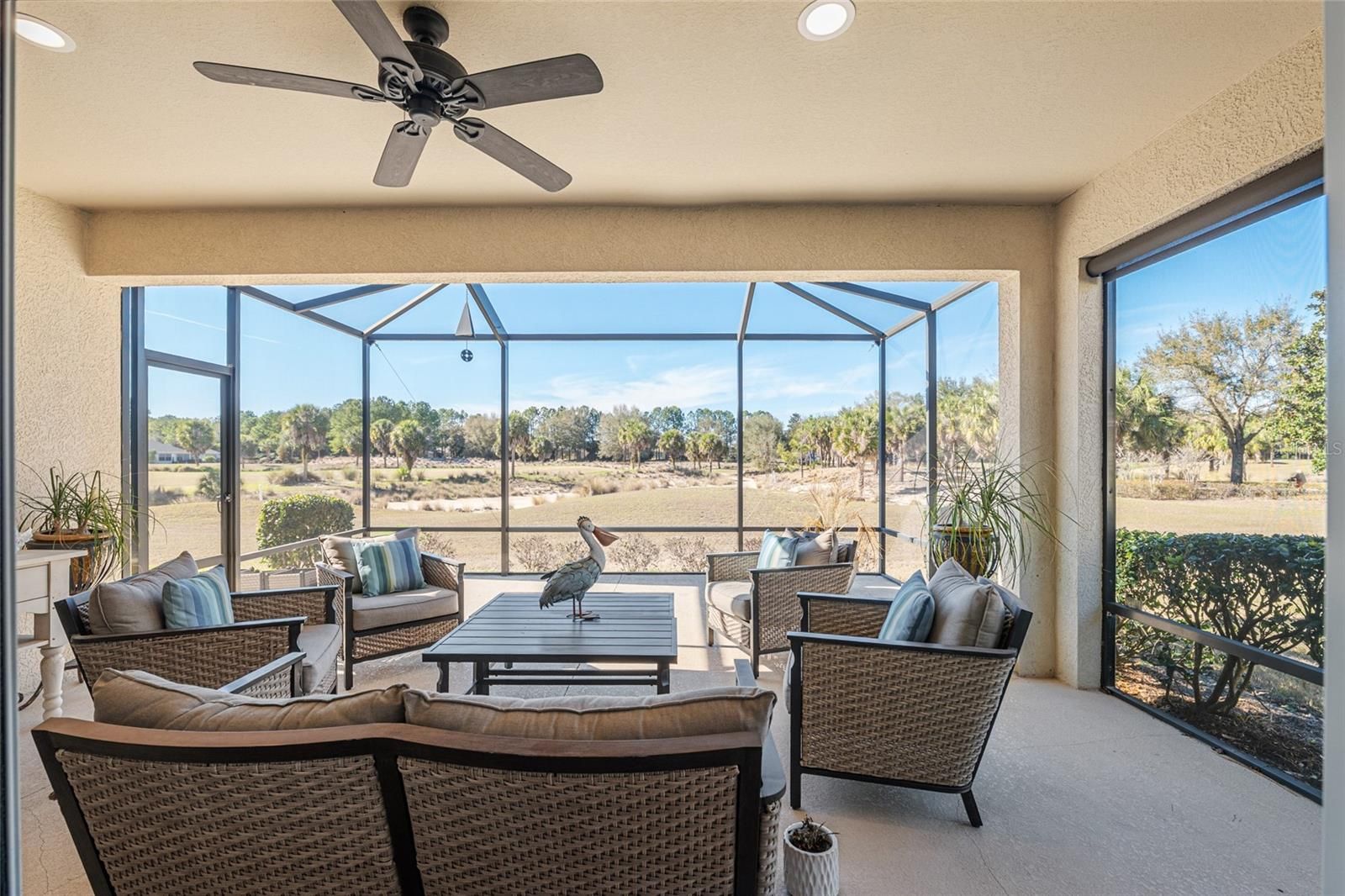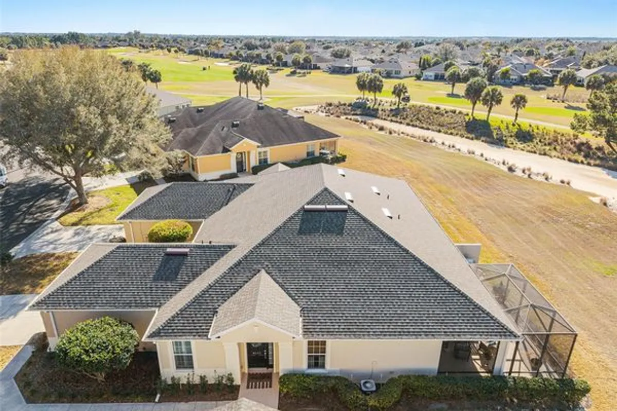 GOLF COURSE HOME WITH STUNNING VIEWS. This villa home is currently the only maintenance free villa available on the golf course. Known as the Augustus model the floor plan is designed for fabulous entertaining with family and friends. The Augustus model is a fully open floor plan with two full bedrooms, two full bathrooms, a den/office with glass french doors and an inside laundry room. The large island kitchen is spacious and open to all of the main living areas. The island easily fits three chairs/stools. This beautiful kitchen has ample cabinet space with a built in pantry and a built desk/office space. All of the SS kitchen appliances are included which also includes a built in microwave. Enjoy entertaining while your guests relax in the large open living room and formal dining area. Your main living space leads the desirable screen room and bird cage overlooking the golf course. Opening the two sets of sliding glass doors allows you to bring the outdoors in. This is simply perfect for enjoying your home and your Florida lifestyle while living in Stone Creek, which is just like vacationing in a resort. The master bedroom which overlooks the golf course easily fits a king-sized bedroom suite. The master bathroom has dual sinks, a walk-in shower, water closet, linen closet, and a large walk-in closet. This home is a split plan which offers privacy for the guest bedroom and guest bathroom. The den/office is roomy enough to use as an office or an office and additional guest bedroom or even an art studio for the artist in the family. Custom plantation shutters show off beautifully in the home. The home is also accented with crown molding. The garage has a lot of upper ceiling storage. NO NEED TO WORRY ABOUT YOUR EXTERIOR MAINTENANCE. IT’S ALL INCLUDED IN THE HOA FEE. ROOF REPLACEMENT AND REPAIRS, EXTERIOR PAINTING, LANDSCAPING, IRRIGATION WATER, SPRINKLER REPAIRS AND EXTERIOR INSURANCE POLICY. Bridgenet internet is also included in your monthly HOA fee. And that’s not all…the list of amenities are endless and are included the HOA fee: The huge indoor pool, resort style outdoor pool, resort style gym, billiards room, crafts room, ball room, library, PICKLEBALL COURTS, tennis courts, basketball court, baseball field, dog parks, and the list goes on. Stone Creek doesn’t just offer a place to live. Living in Stone Creek offers a lifestyle full of endless activities to keep you busy and enjoy life. Come and see this lovely villa.