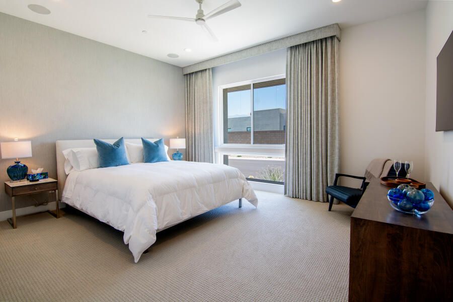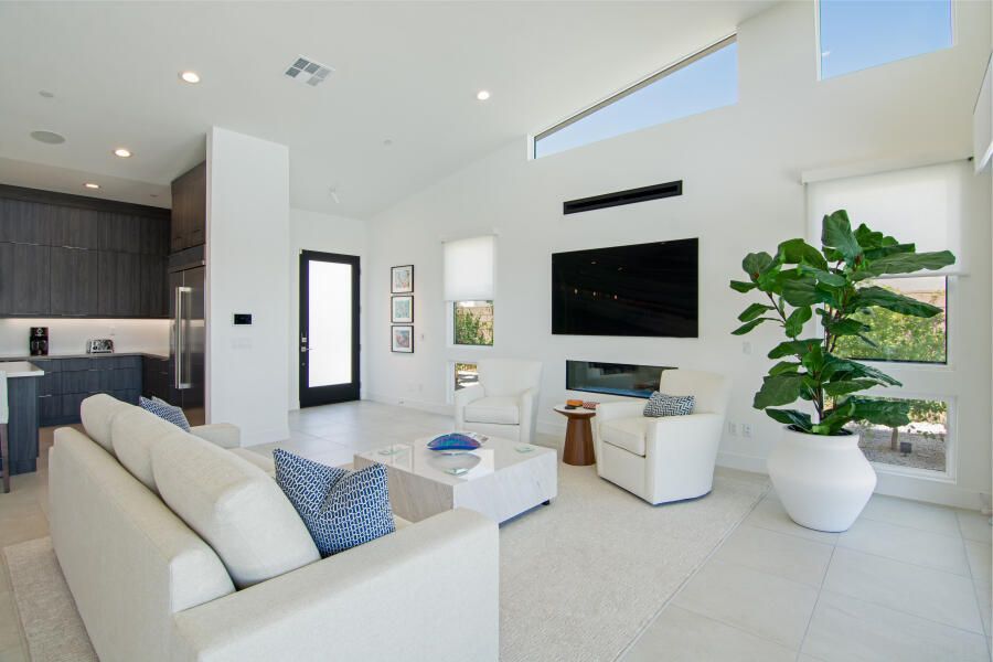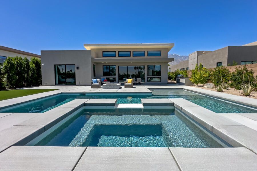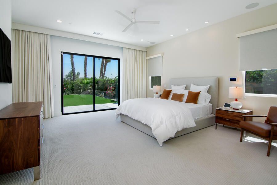 Located within the highly sought-after, guard-gated Escena community, 960 Patina Lane offers an exceptional blend of contemporary design, refined finishes, and the effortless indoor/outdoor lifestyle Palm Springs is known for. This modern 3 bedroom, 3 bathroom, 2,705 sq. ft. residence sits directly on the Escena Golf Course, capturing sweeping fairway and mountain views through dramatic walls of glass and triple-pane windows providing additional privacy. Designed as a true Smart Home, the property features motorized blinds throughout, intelligent lighting controls, and a layout that emphasizes both convenience and style. The open-concept great room boasts soaring ceilings, abundant natural light, and seamless flow to the outdoors—ideal for entertaining, relaxing, or simply taking in the desert scenery. The gourmet kitchen is equipped with high-end JennAir appliances, quartz countertops, a large central island, and sleek cabinetry, making it as functional as it is beautiful. The luxurious primary suite is a standout retreat, offering direct access to the backyard and a spa-inspired bathroom complete with a standalone soaking tub, a dual walk-in shower, and generous closet space. One additional guest suite and an additional office or third bedroom are thoughtfully separated, providing privacy and comfort for visitors or extended stays. Step outside to your private resort-like oasis where the sparkling pool, sunning areas, and brand-new built-in BBQ set the stage for open-air dining and year-round enjoyment. A pedestrian gate provides direct access to the golf course—perfect for morning walks, an easy tee time. Offered fully furnished with high-quality, designer-selected pieces, this residence is truly turnkey and ready for immediate enjoyment. Whether as a full-time home, seasonal escape, or investment opportunity, 960 Patina Lane delivers an unparalleled combination of style, comfort, and prime golf-course living within one of Palm Springs' most desirable communities.