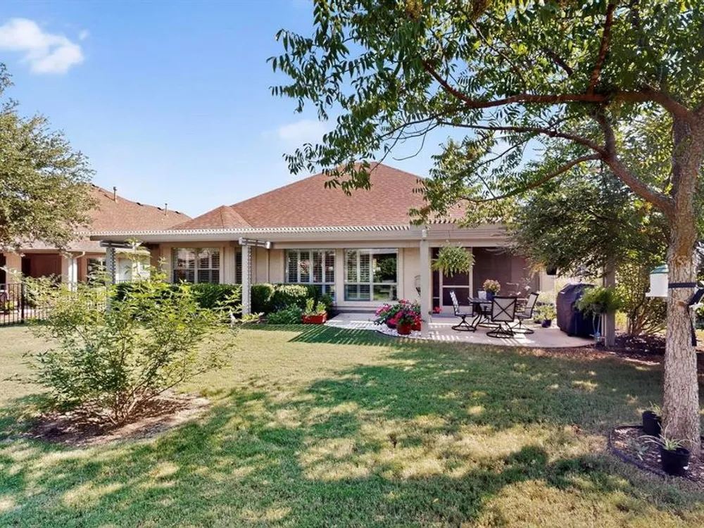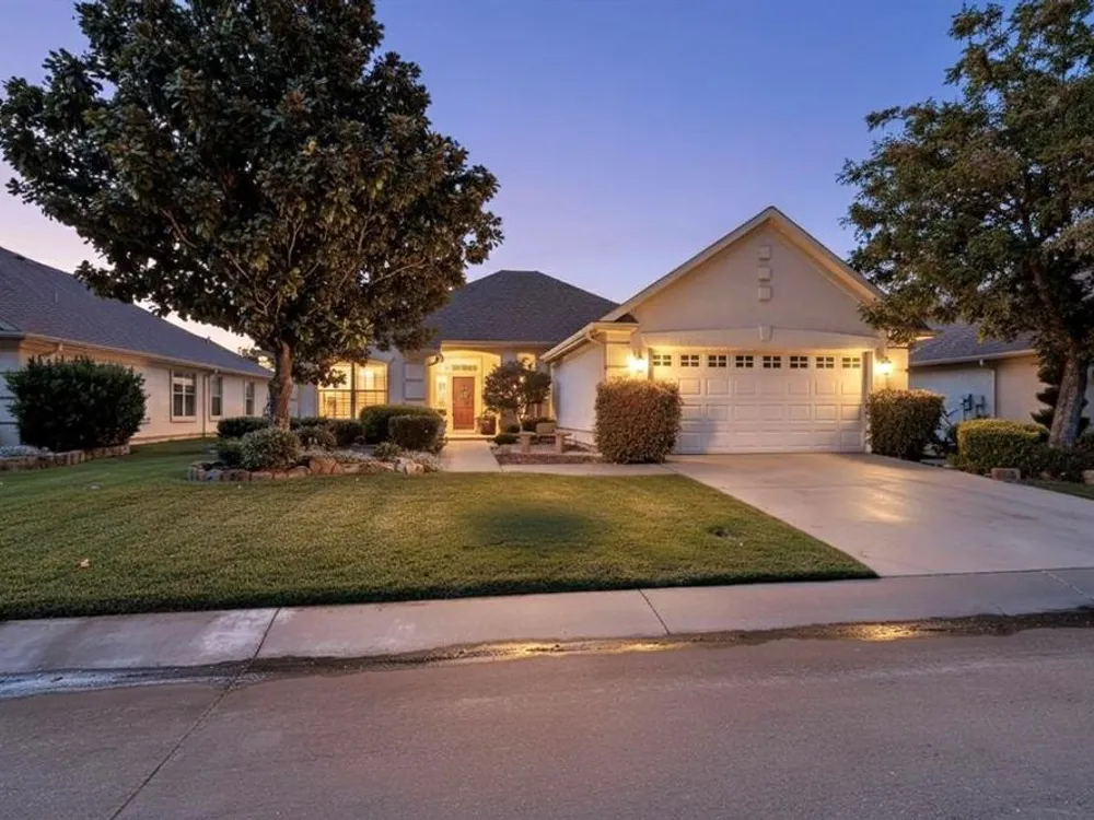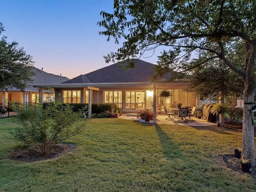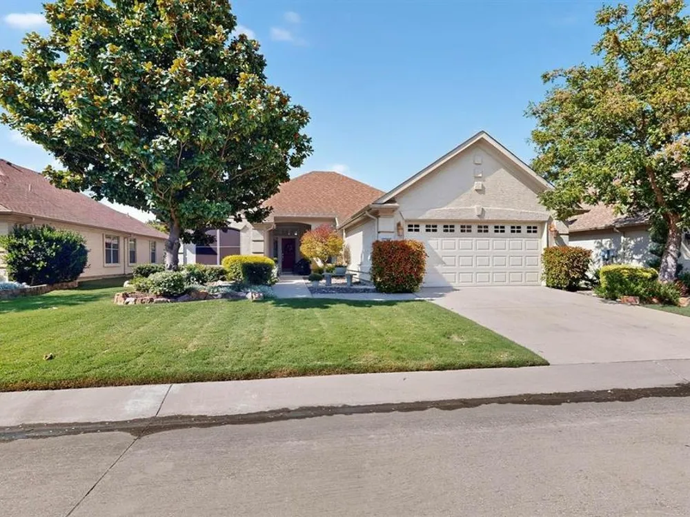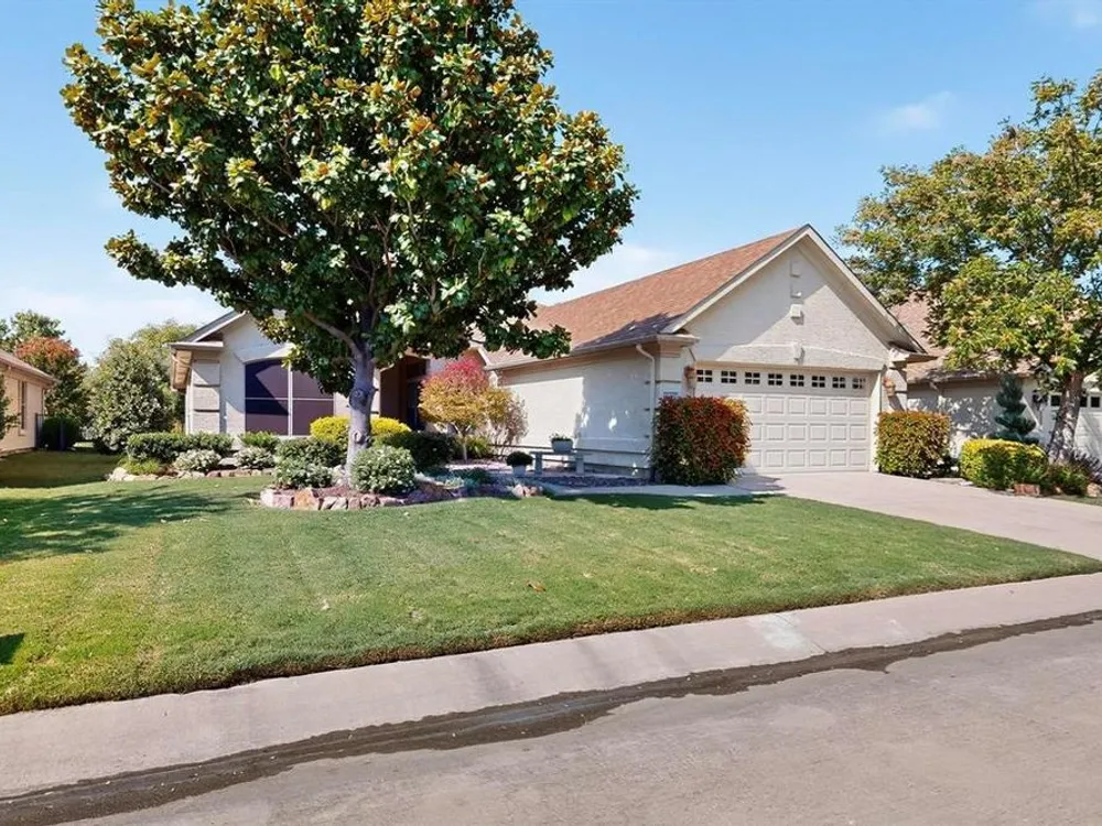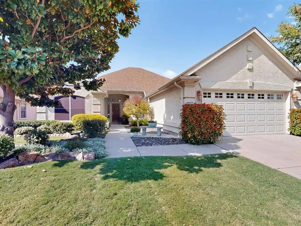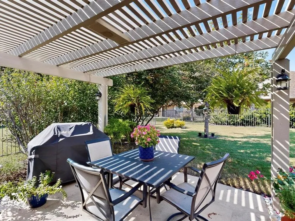 Welcome to this charming Oakmont model located in the award-winning community of Robson Ranch. Step inside and discover a home that blends comfort, elegance, and functionality. Plantation shutters grace every window, creating a timeless look and soft natural light throughout. The kitchen is bright and inviting, featuring quartz countertops, a classic subway tile backsplash, under-cabinet lighting, and ample cabinetry—a perfect space for both everyday meals and entertaining.The living room exudes warmth with its crown molding, electric fireplace, and lighted built-in shelving, offering a perfect setting for relaxing or hosting guests.Retreat to the primary suite, where a tray ceiling and bay window enhance the spacious feel. The bathroom features dual sinks, mirrored medicine cabinets, a linen closet, and a custom walk-in closet designed for exceptional storage and style. Guests will love their own private space in the second bedroom. The flex room, currently styled as a formal dining space, offers French doors for privacy and can easily serve as a home office, craft room, or intimate sitting area.Outdoor living shines here. Enjoy morning coffee or evening sunsets on the screened-in porch, leading to an extended concrete patio with a charming pergola and fenced yard. It’s an ideal setting for grilling, gardening, or simply soaking up the peaceful Texas evenings.Experience the best of Robson Ranch living—a vibrant, gated 55+ neighborhood offering resort-style living and an active social atmosphere. Residents enjoy a championship golf course, multiple clubhouses, pools, restaurants, creative arts studios, pickleball and tennis courts, and hundreds of clubs and events designed to make every day feel like a getaway.