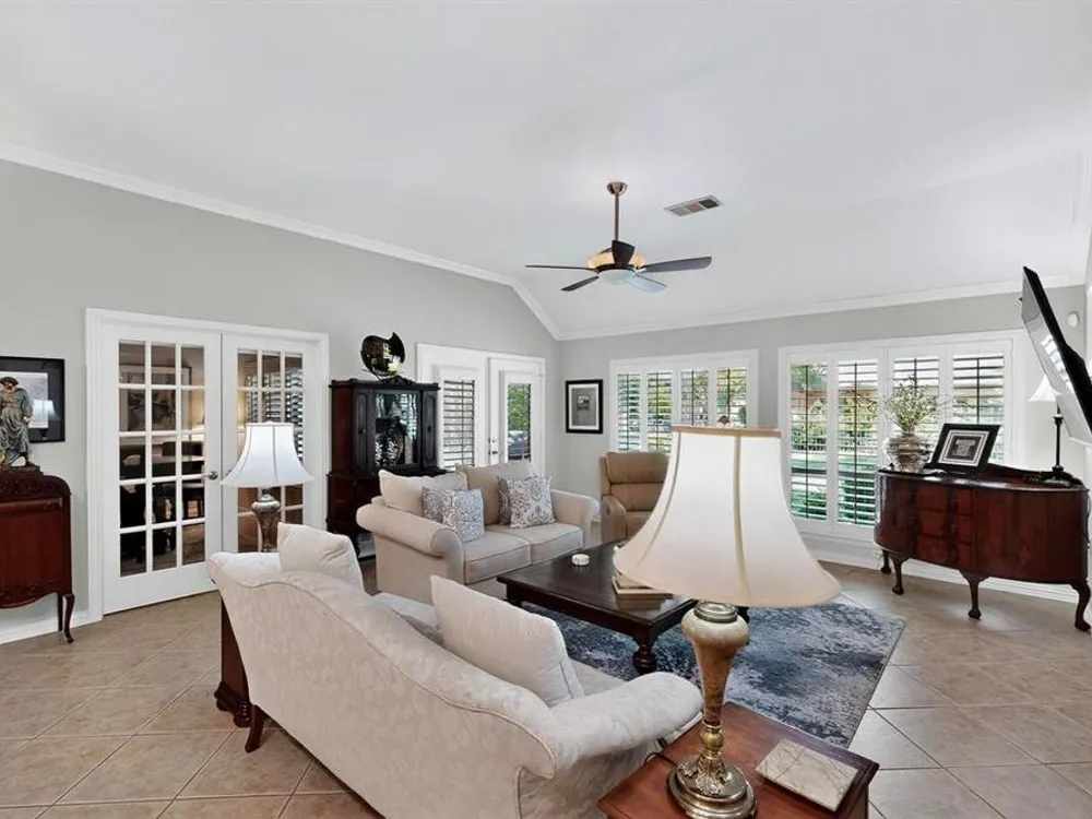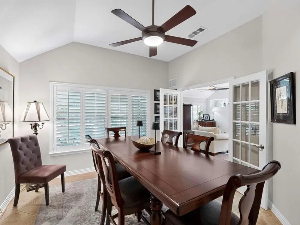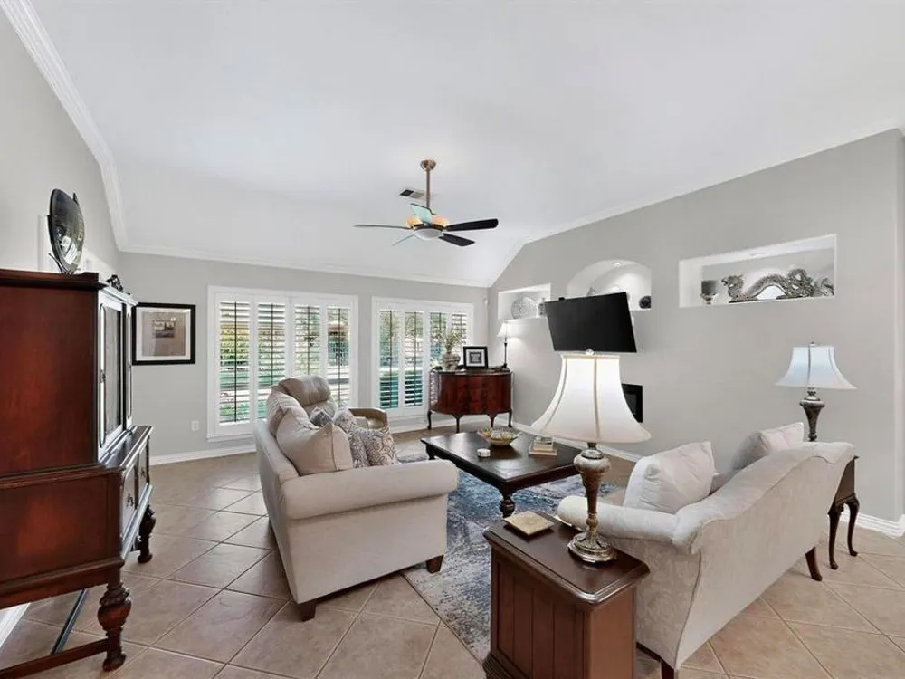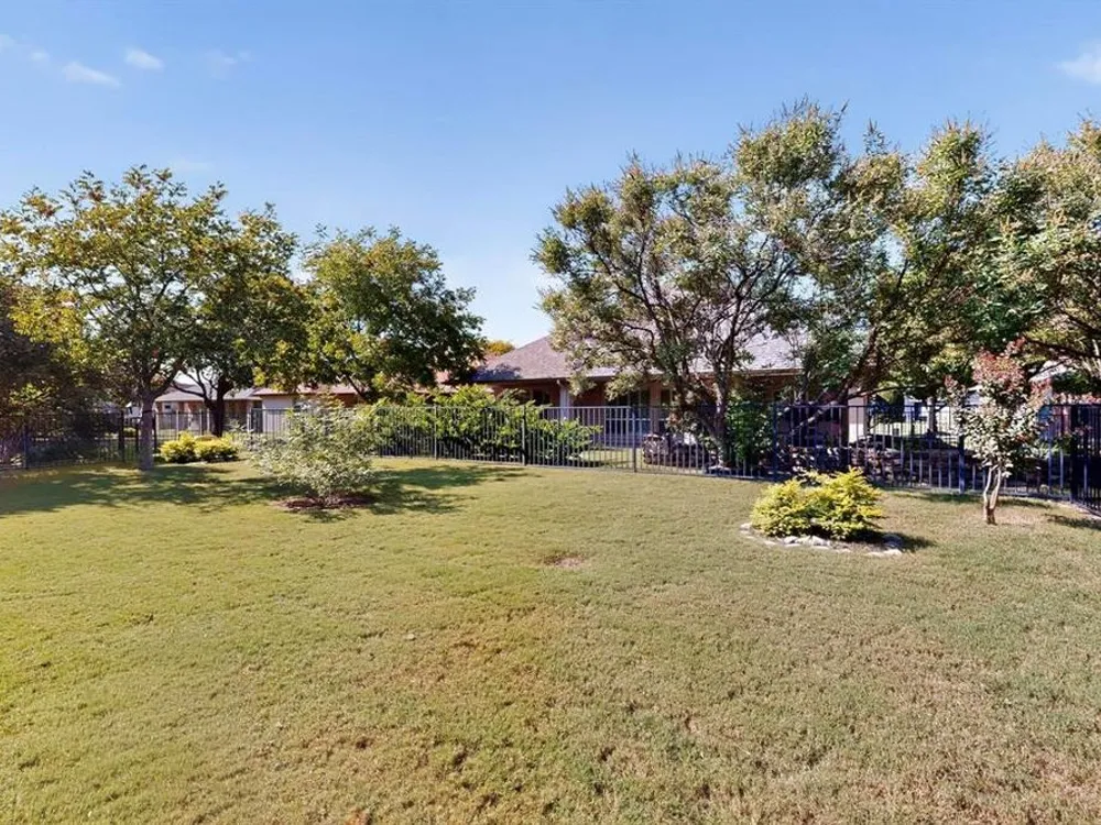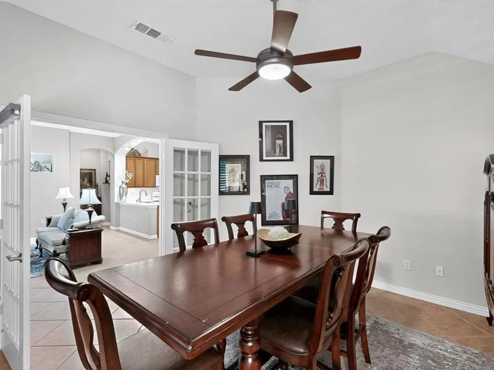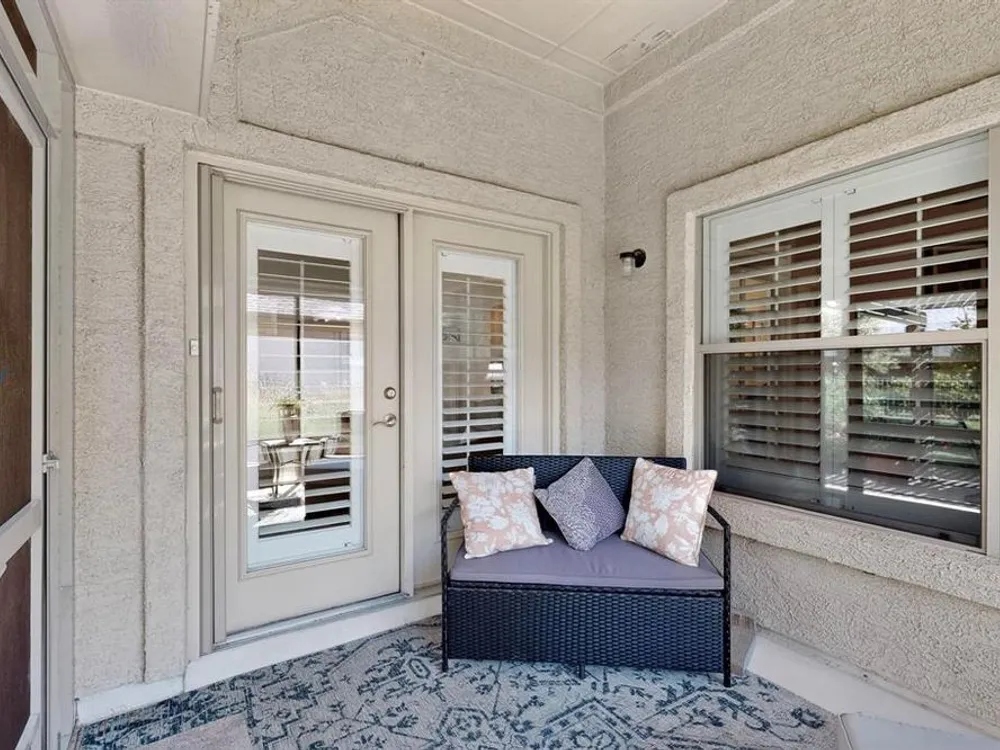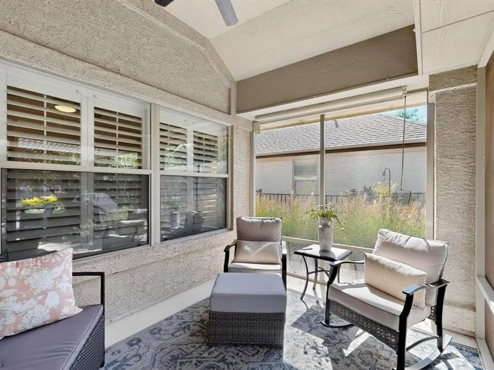 Welcome to this charming Oakmont model located in the award-winning community of Robson Ranch. Step inside and discover a home that blends comfort, elegance, and functionality. Plantation shutters grace every window, creating a timeless look and soft natural light throughout. The kitchen is bright and inviting, featuring quartz countertops, a classic subway tile backsplash, under-cabinet lighting, and ample cabinetry—a perfect space for both everyday meals and entertaining.The living room exudes warmth with its crown molding, electric fireplace, and lighted built-in shelving, offering a perfect setting for relaxing or hosting guests.Retreat to the primary suite, where a tray ceiling and bay window enhance the spacious feel. The bathroom features dual sinks, mirrored medicine cabinets, a linen closet, and a custom walk-in closet designed for exceptional storage and style. Guests will love their own private space in the second bedroom. The flex room, currently styled as a formal dining space, offers French doors for privacy and can easily serve as a home office, craft room, or intimate sitting area.Outdoor living shines here. Enjoy morning coffee or evening sunsets on the screened-in porch, leading to an extended concrete patio with a charming pergola and fenced yard. It’s an ideal setting for grilling, gardening, or simply soaking up the peaceful Texas evenings.Experience the best of Robson Ranch living—a vibrant, gated 55+ neighborhood offering resort-style living and an active social atmosphere. Residents enjoy a championship golf course, multiple clubhouses, pools, restaurants, creative arts studios, pickleball and tennis courts, and hundreds of clubs and events designed to make every day feel like a getaway.
