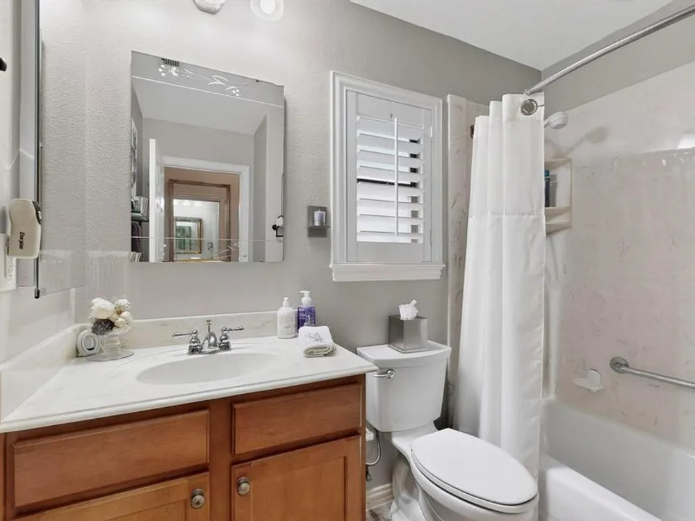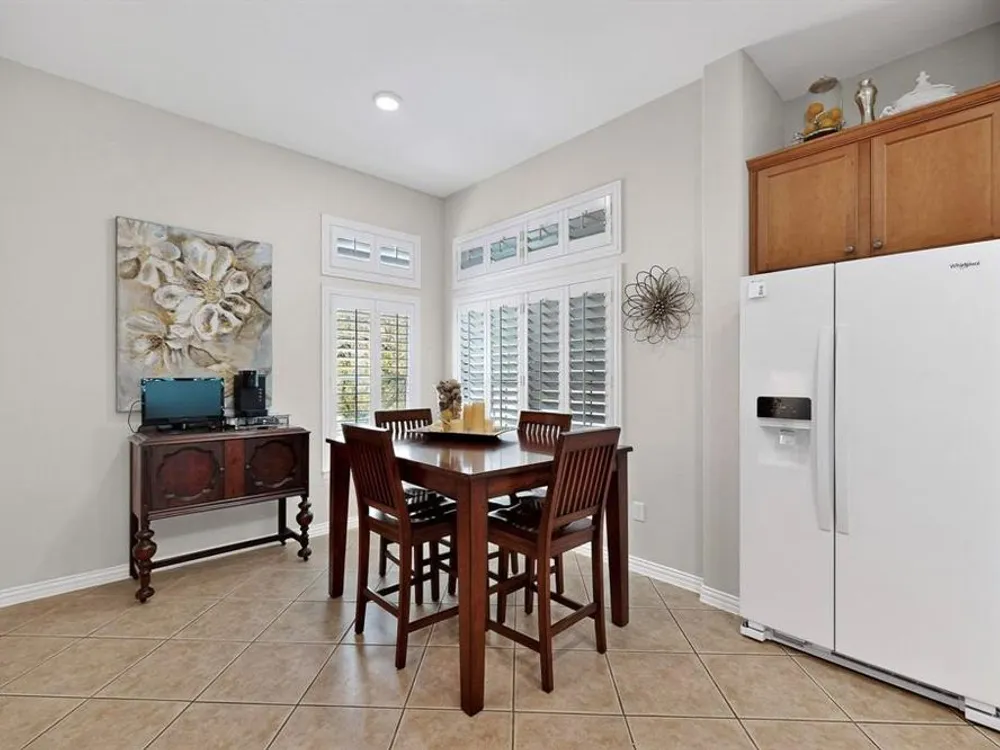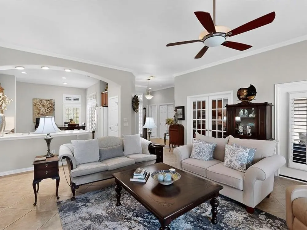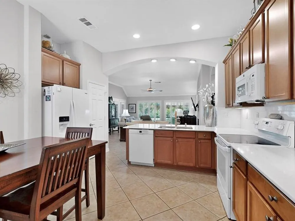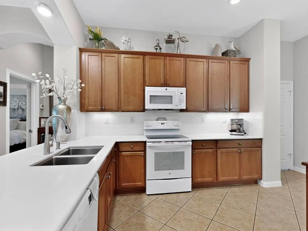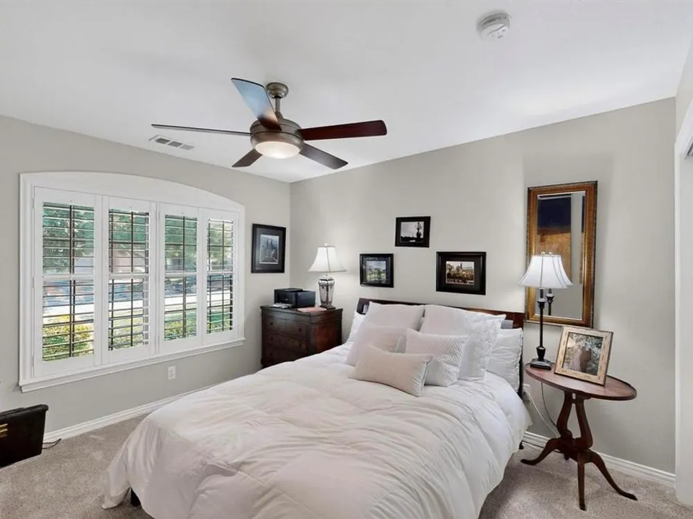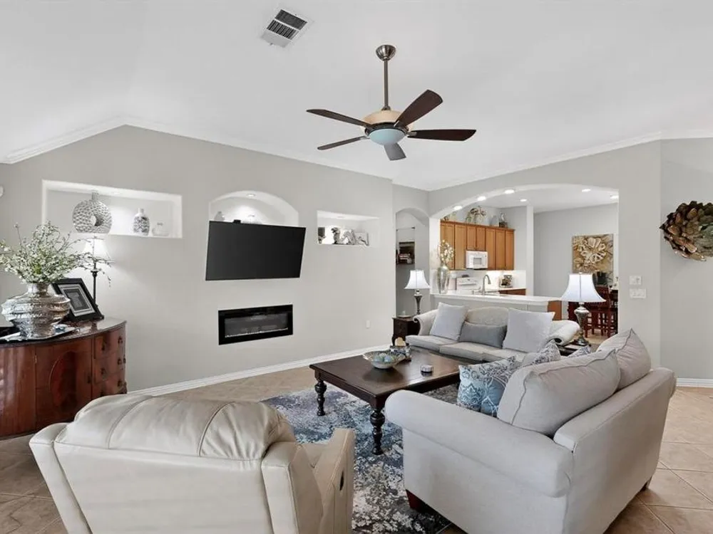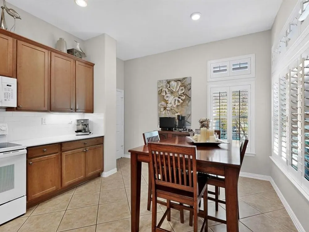 Welcome to this charming Oakmont model located in the award-winning community of Robson Ranch. Step inside and discover a home that blends comfort, elegance, and functionality. Plantation shutters grace every window, creating a timeless look and soft natural light throughout. The kitchen is bright and inviting, featuring quartz countertops, a classic subway tile backsplash, under-cabinet lighting, and ample cabinetry—a perfect space for both everyday meals and entertaining.The living room exudes warmth with its crown molding, electric fireplace, and lighted built-in shelving, offering a perfect setting for relaxing or hosting guests.Retreat to the primary suite, where a tray ceiling and bay window enhance the spacious feel. The bathroom features dual sinks, mirrored medicine cabinets, a linen closet, and a custom walk-in closet designed for exceptional storage and style. Guests will love their own private space in the second bedroom. The flex room, currently styled as a formal dining space, offers French doors for privacy and can easily serve as a home office, craft room, or intimate sitting area.Outdoor living shines here. Enjoy morning coffee or evening sunsets on the screened-in porch, leading to an extended concrete patio with a charming pergola and fenced yard. It’s an ideal setting for grilling, gardening, or simply soaking up the peaceful Texas evenings.Experience the best of Robson Ranch living—a vibrant, gated 55+ neighborhood offering resort-style living and an active social atmosphere. Residents enjoy a championship golf course, multiple clubhouses, pools, restaurants, creative arts studios, pickleball and tennis courts, and hundreds of clubs and events designed to make every day feel like a getaway.