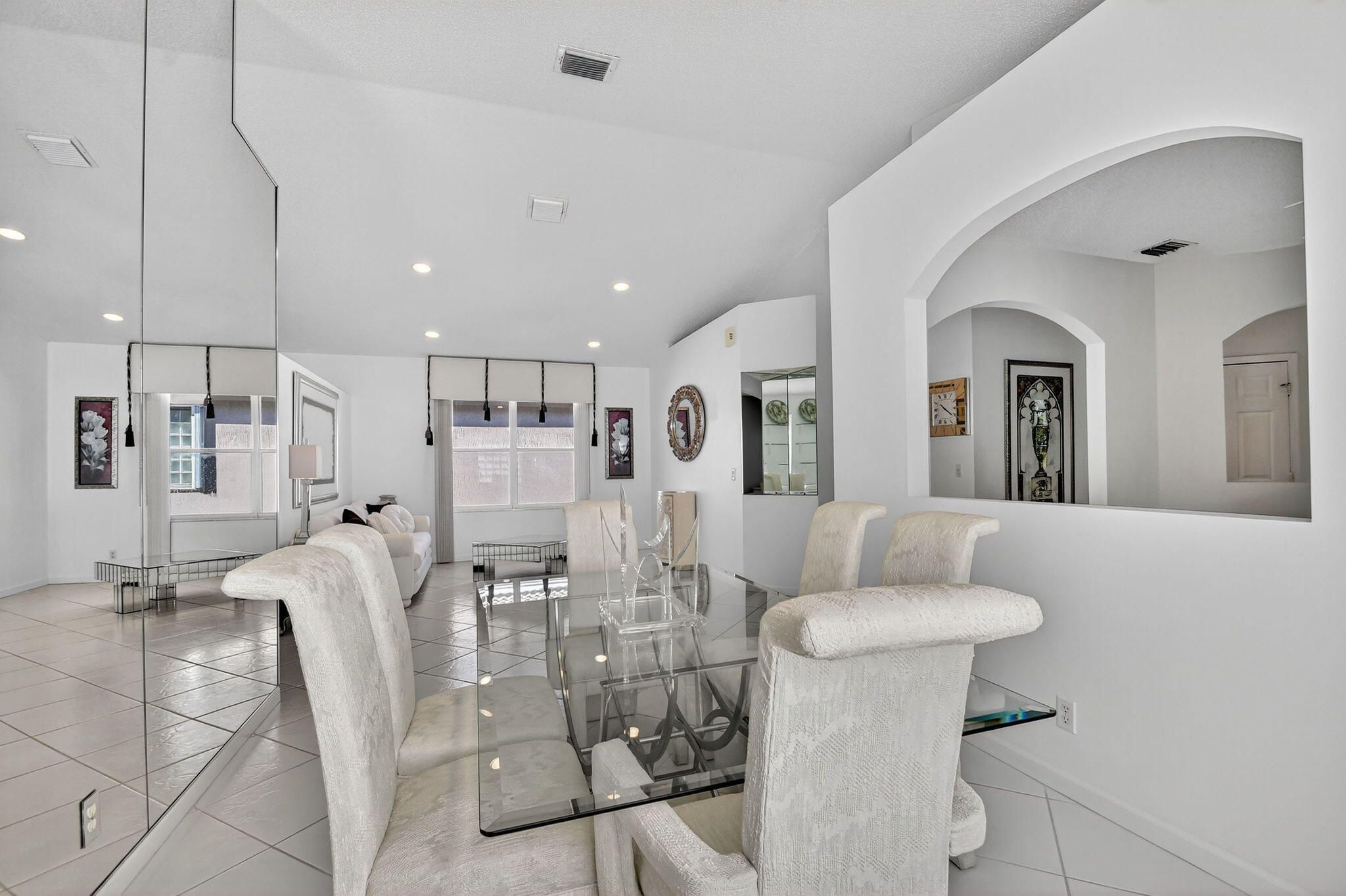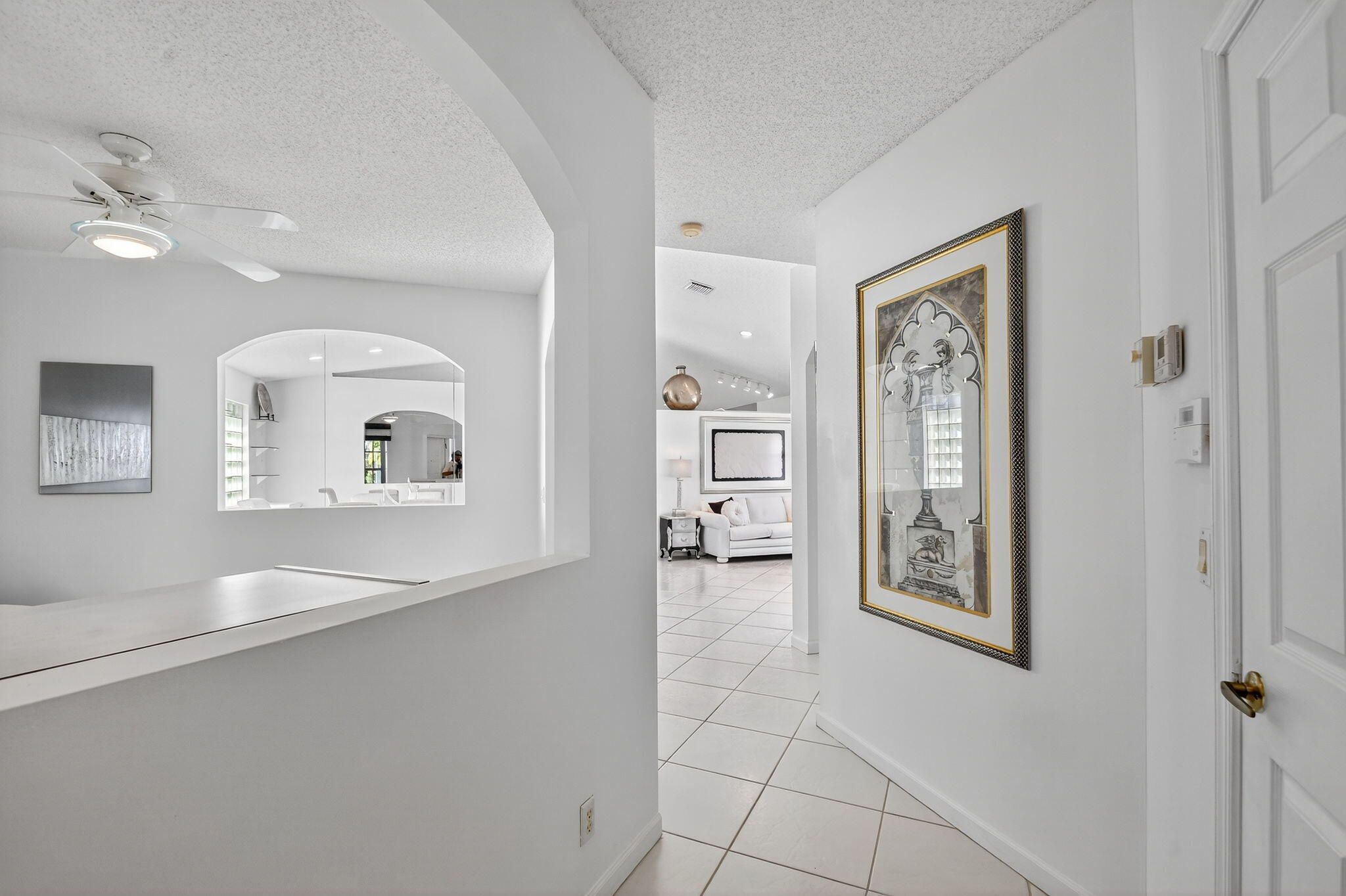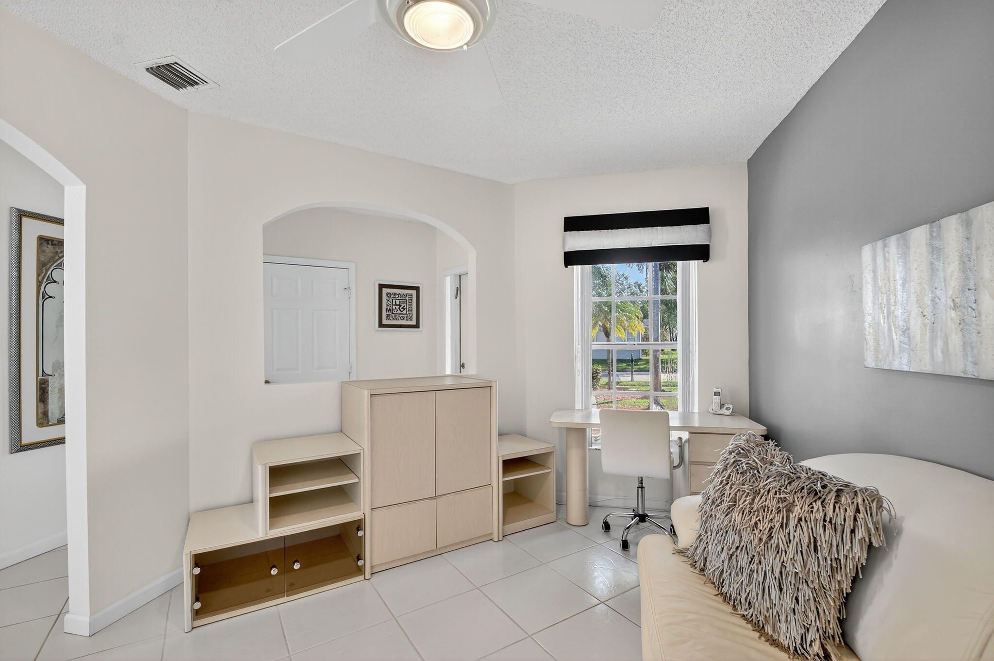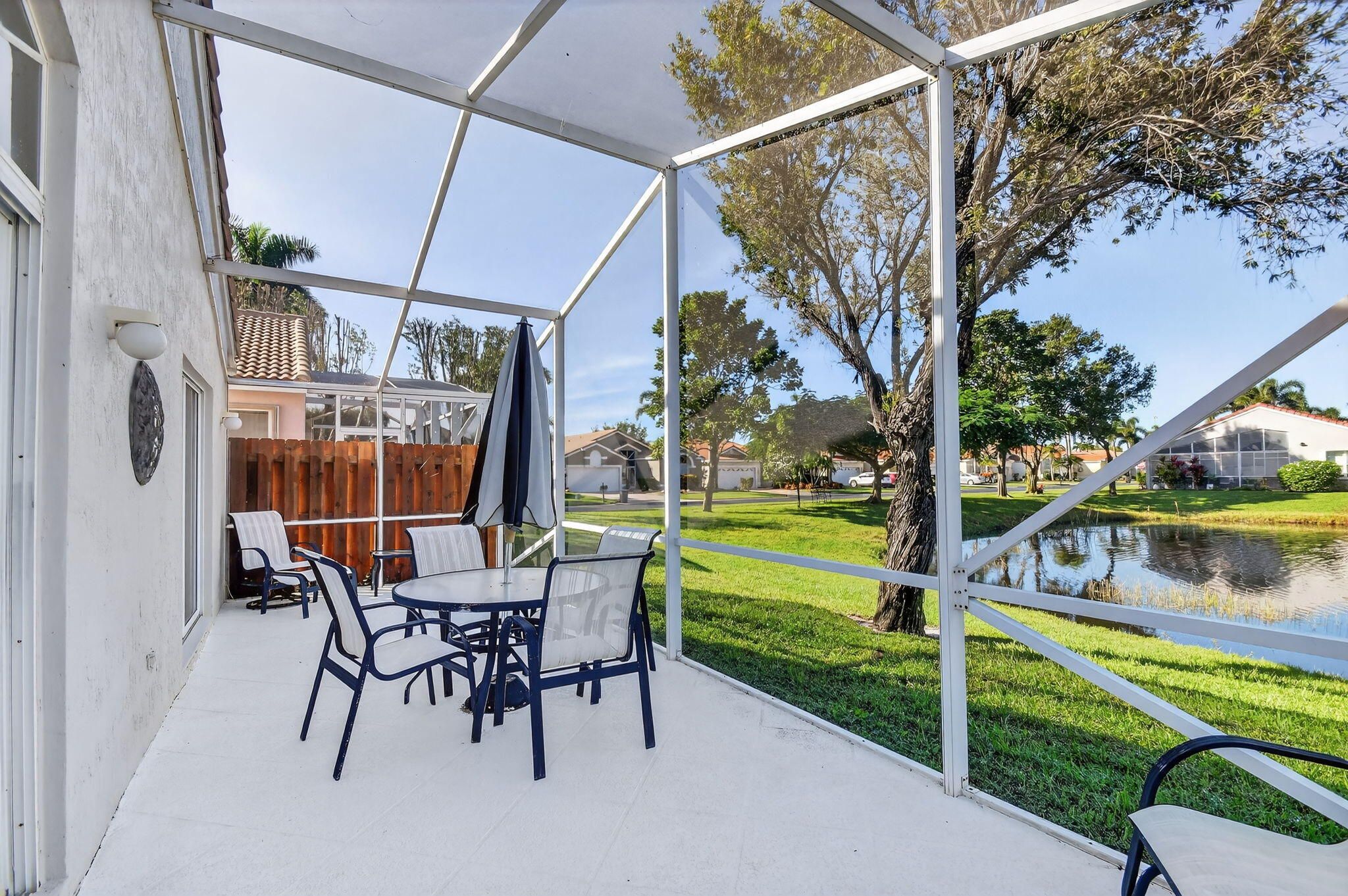 Step into a life of true peace in this beautifully furnished and maintained 3-bedroom, 2-bathroom home. The third bedroom has been professionally converted to a spacious den, perfect for an office or library. Imagine starting your day on the screened patio, sipping coffee as you overlook the sparkling lake and fountain. Perfectly situated on a very quiet, no-through-traffic street, you get the best of both worlds: tranquility and unparalleled convenience, as this home is perfectly positioned within easy walking distance to the pool, clubhouse, and the heart of it all. The freshly manicured exterior immediately invites you in, and once inside, high ceilings and expansive windows flood the space with natural light, creating an open and uplifting atmosphere where tile flooring flows seamlessly throughout. You'll love the generous living spaces, including a formal living room and a separate family room - perfect for entertaining or elegantly showcasing your favorite art. The updated kitchen is a delight, featuring sleek white quartz countertops, a stylish look, and all white appliances. Retreat to the primary bedroom where you'll wake up to calm water views, complete with two walk-in closets. The community supports a vibrant, active lifestyle with amenities like a social hall, fitness center, tennis, pickleball, bocce, billiards, and shuffleboard, all in a prime location near essential shopping, dining, and medical facilities. Best of all, the HOA fees offer incredible value and peace of mind, covering Comcast cable, internet, meticulous lawn care, house painting every 7 years, alarm monitoring, a secure guard gate, and more.