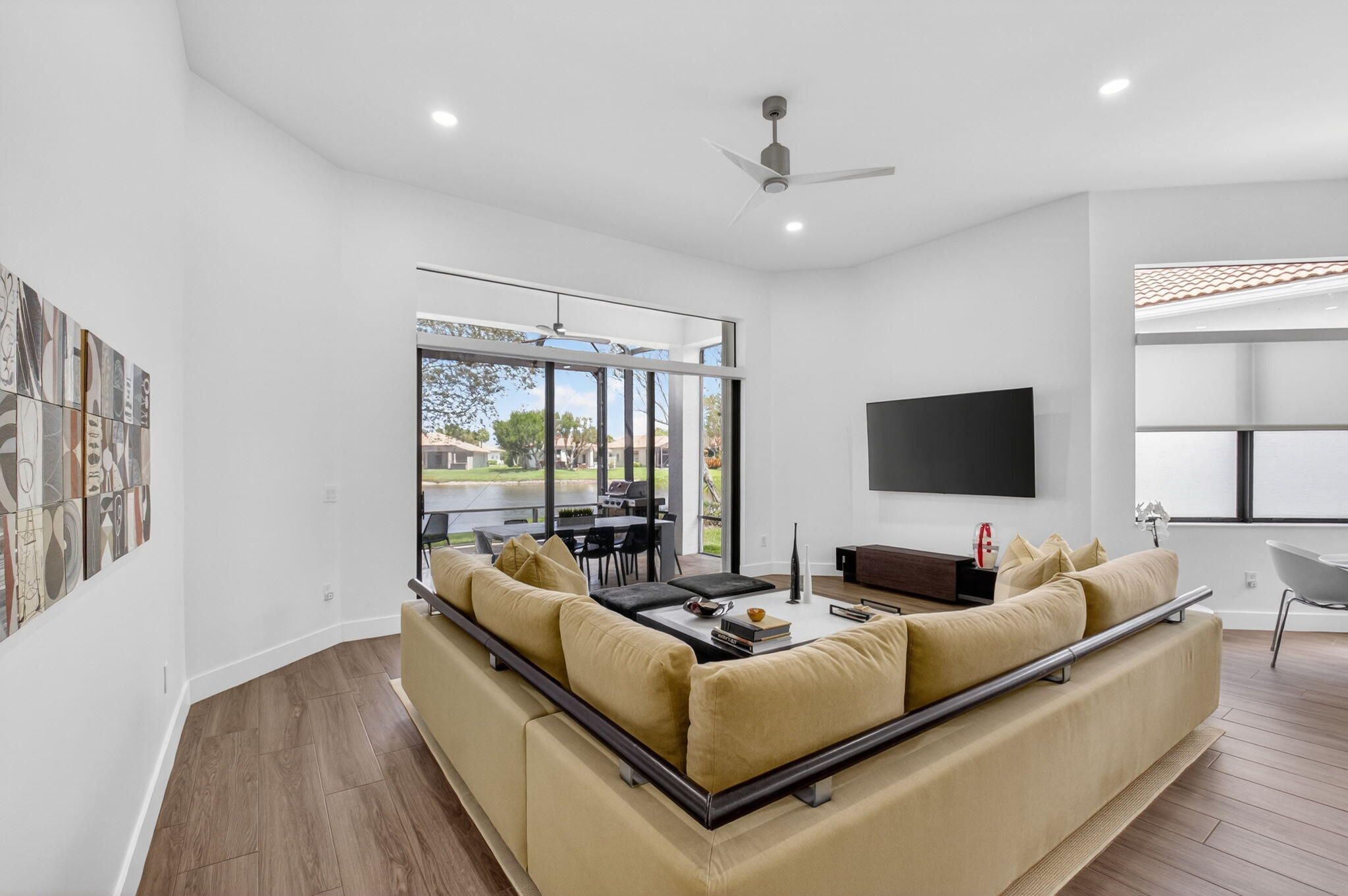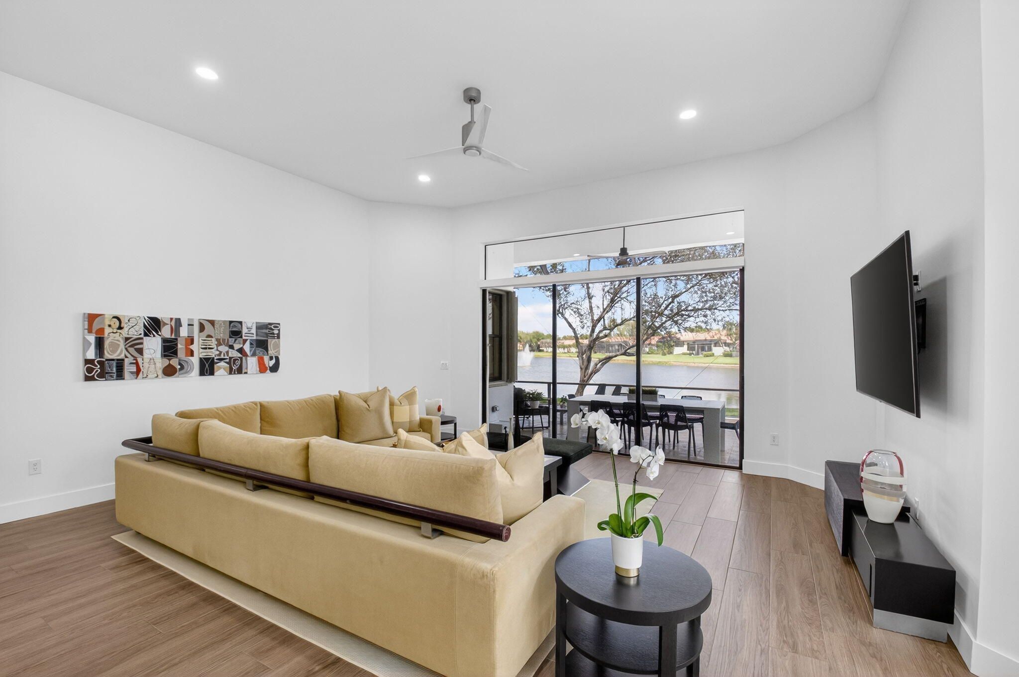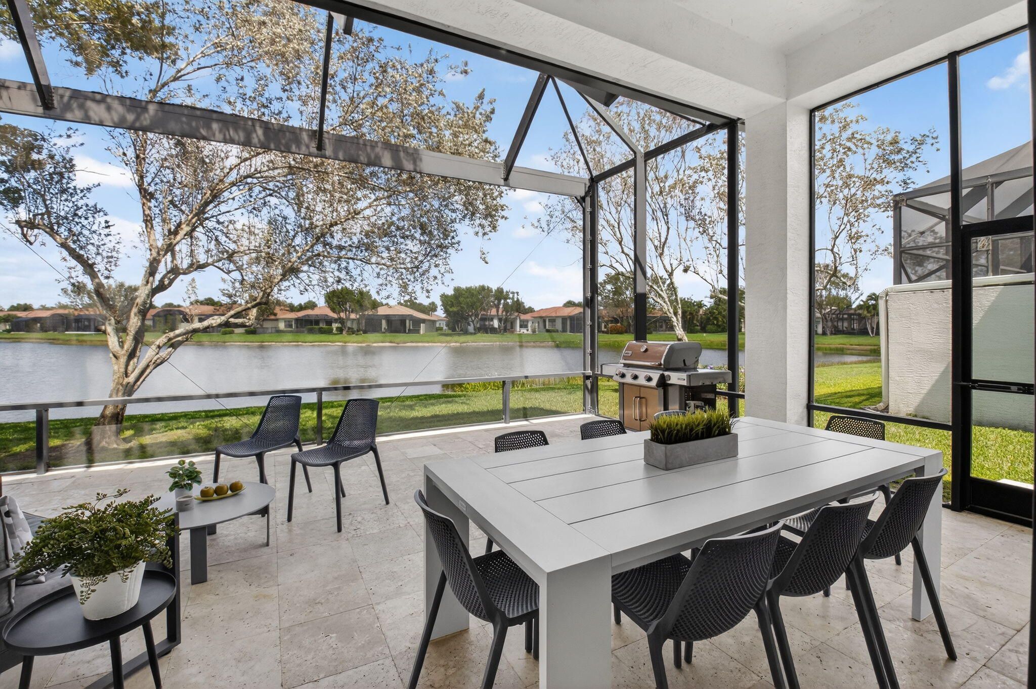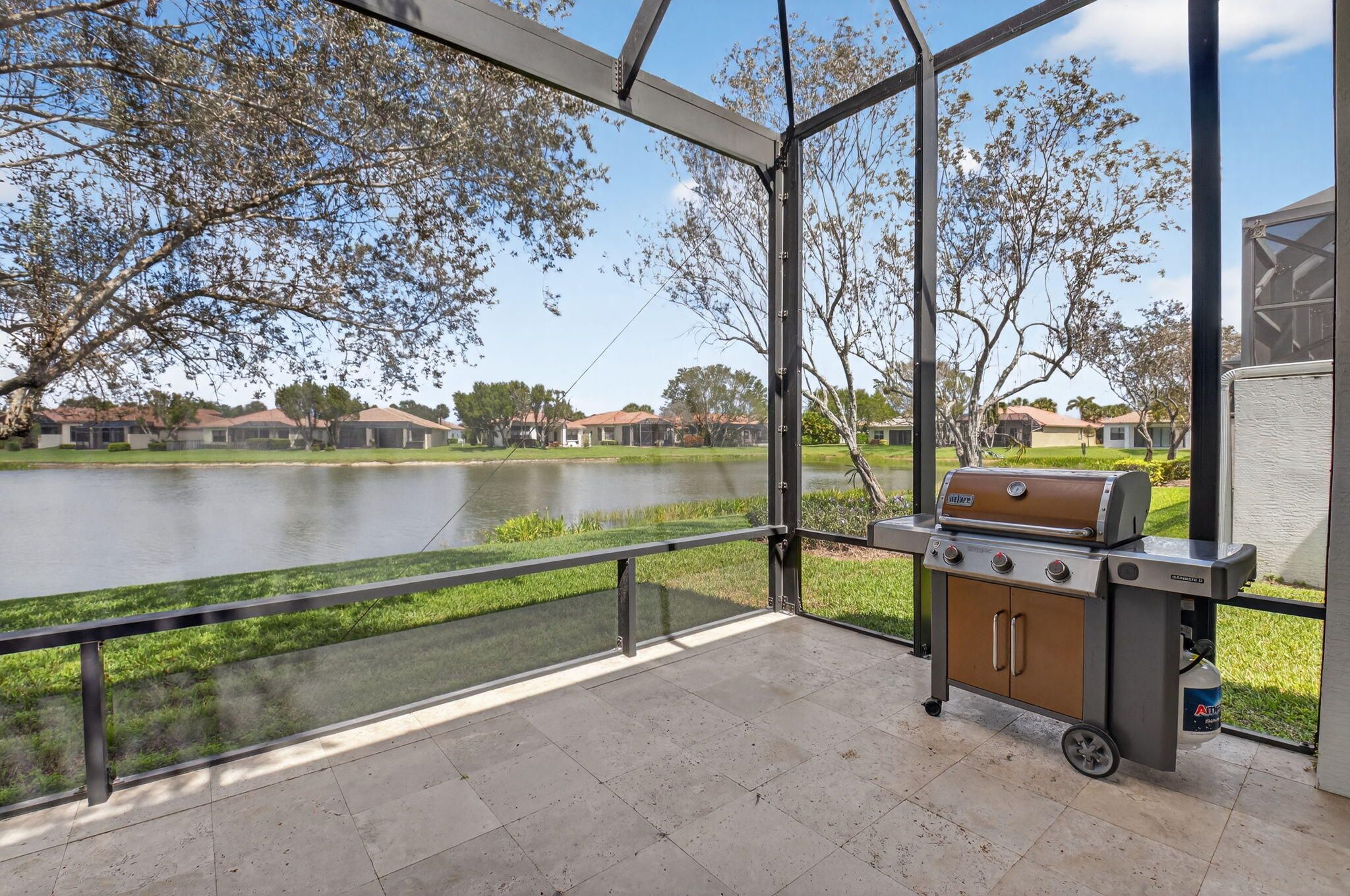 This amazing lake view, 3 bedroom, 2 bath Great Room home has been renovated with high end materials and lots of love and attention. The kitchen is a chef's dream with quartz counters and backsplash, a stainless steel appliance package, including french door refrigerator, wall oven/microwave and lots of storage with not one but two pantries. The floors in the living areas, front bedroom and den are wood plank look porcelain tile giving the taste of elegance throughout the home. The primary suite has generous space for any size bedroom set and two walk in closets that have been smartly designed for maximum space. The beautifully renovated primary bathroom features dual vanities, a luxurious soaking tub, and a separate glass-enclosed shower. Thoughtfully updated with modern finishes, it offers both style and functionality for a spa-like retreat. The expansive screened lanai showcases beautiful lake views and creates the perfect backdrop for quiet relaxation or memorable gatherings with family and friends. The 3rd bedroom is used as a den and doesn't have a closet. Four Seasons at Delray Beach provides many amenities and clubs. Among the amenities include a recently renovated clubhouse featuring a grand gathering room, multiple card rooms, a catering kitchen and a beautiful ballroom featuring a performance stage and dance floor. The sports center will provide you with a state of the art fitness center, har-tru tennis courts, pickleball courts, table tennis and bocce. Close to the Delray Marketplace and the popular downtown area of Atlantic Avenue, Four Seasons at Delray Beach is the perfect place and location to call home.