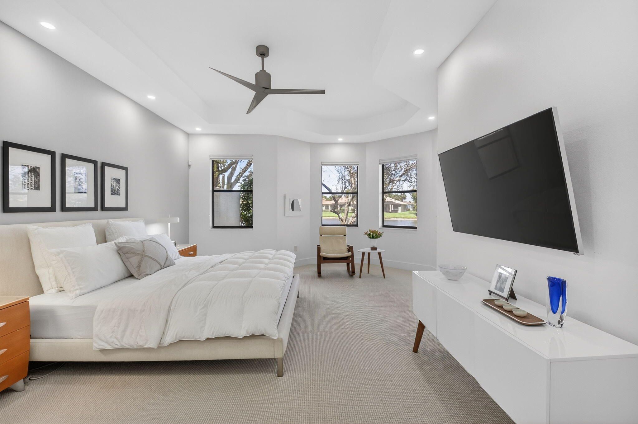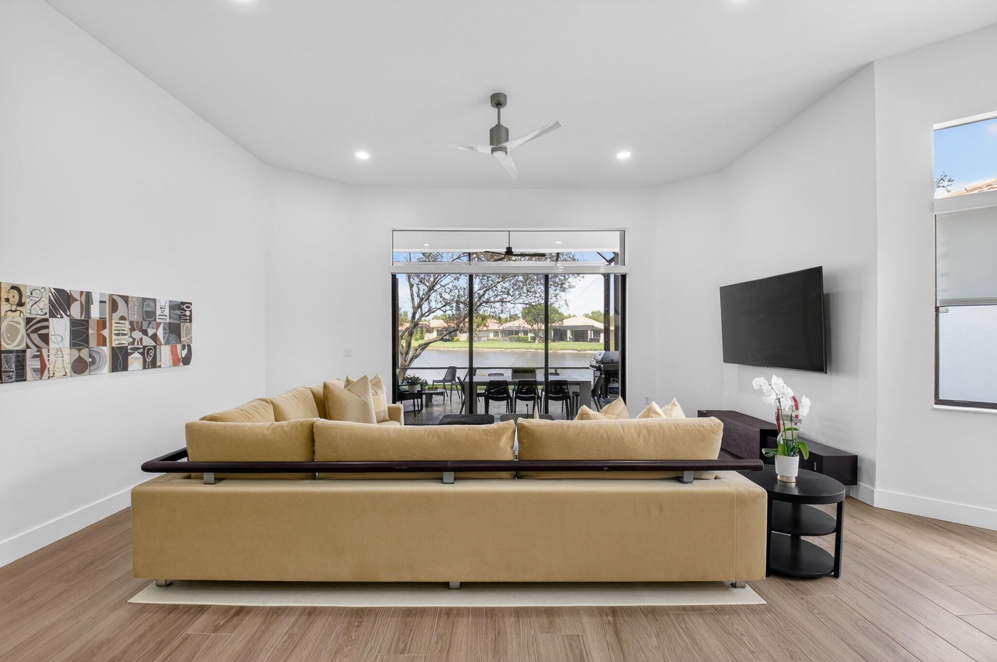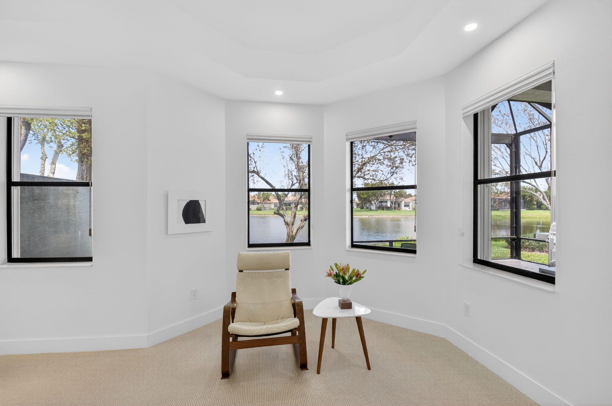 This amazing lake view, 3 bedroom, 2 bath Great Room home has been renovated with high end materials and lots of love and attention. The kitchen is a chef's dream with quartz counters and backsplash, a stainless steel appliance package, including french door refrigerator, wall oven/microwave and lots of storage with not one but two pantries. The floors in the living areas, front bedroom and den are wood plank look porcelain tile giving the taste of elegance throughout the home. The primary suite has generous space for any size bedroom set and two walk in closets that have been smartly designed for maximum space. The beautifully renovated primary bathroom features dual vanities, a luxurious soaking tub, and a separate glass-enclosed shower. Thoughtfully updated with modern finishes, it offers both style and functionality for a spa-like retreat. The expansive screened lanai showcases beautiful lake views and creates the perfect backdrop for quiet relaxation or memorable gatherings with family and friends. The 3rd bedroom is used as a den and doesn't have a closet. Four Seasons at Delray Beach provides many amenities and clubs. Among the amenities include a recently renovated clubhouse featuring a grand gathering room, multiple card rooms, a catering kitchen and a beautiful ballroom featuring a performance stage and dance floor. The sports center will provide you with a state of the art fitness center, har-tru tennis courts, pickleball courts, table tennis and bocce. Close to the Delray Marketplace and the popular downtown area of Atlantic Avenue, Four Seasons at Delray Beach is the perfect place and location to call home.