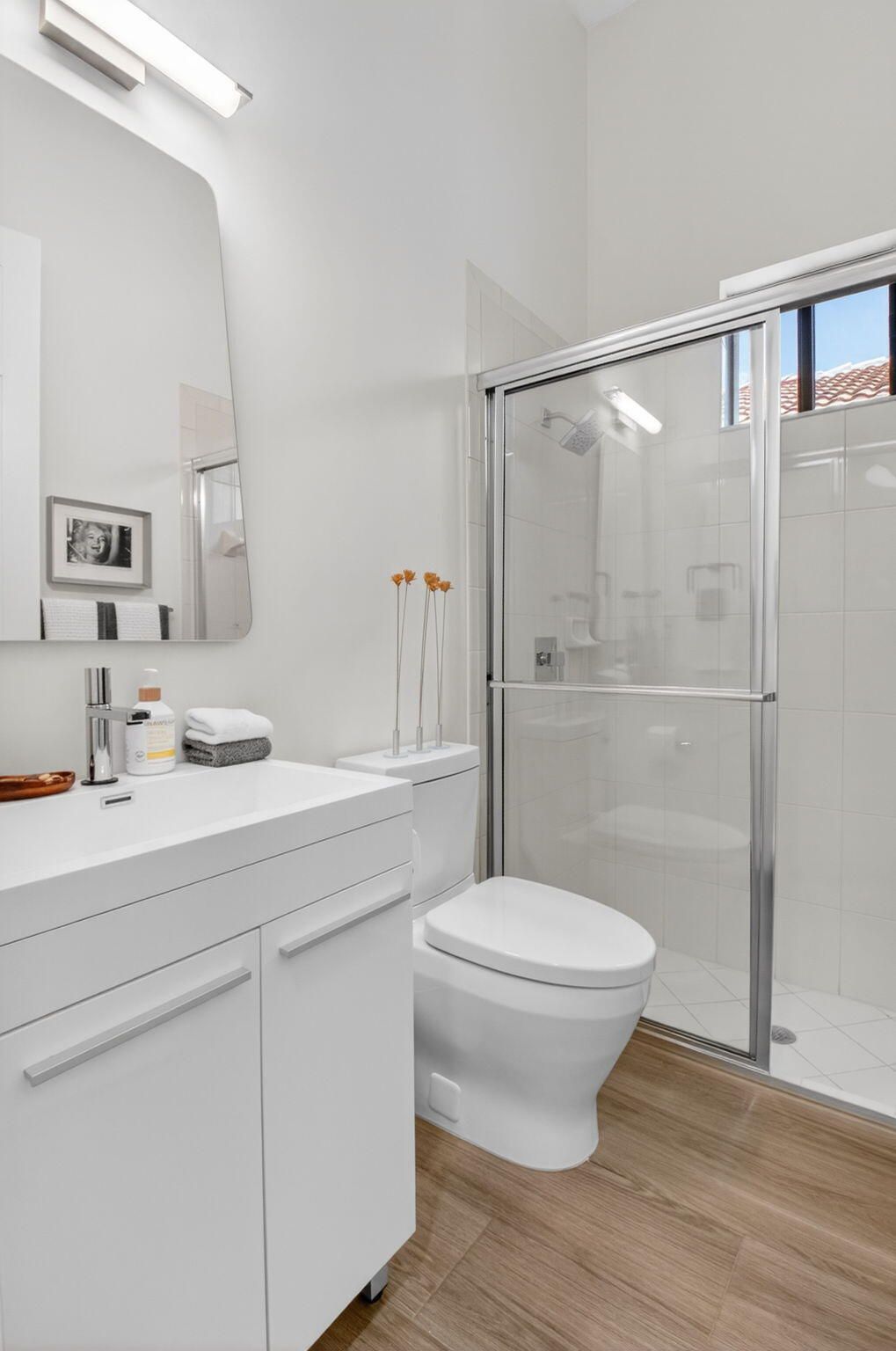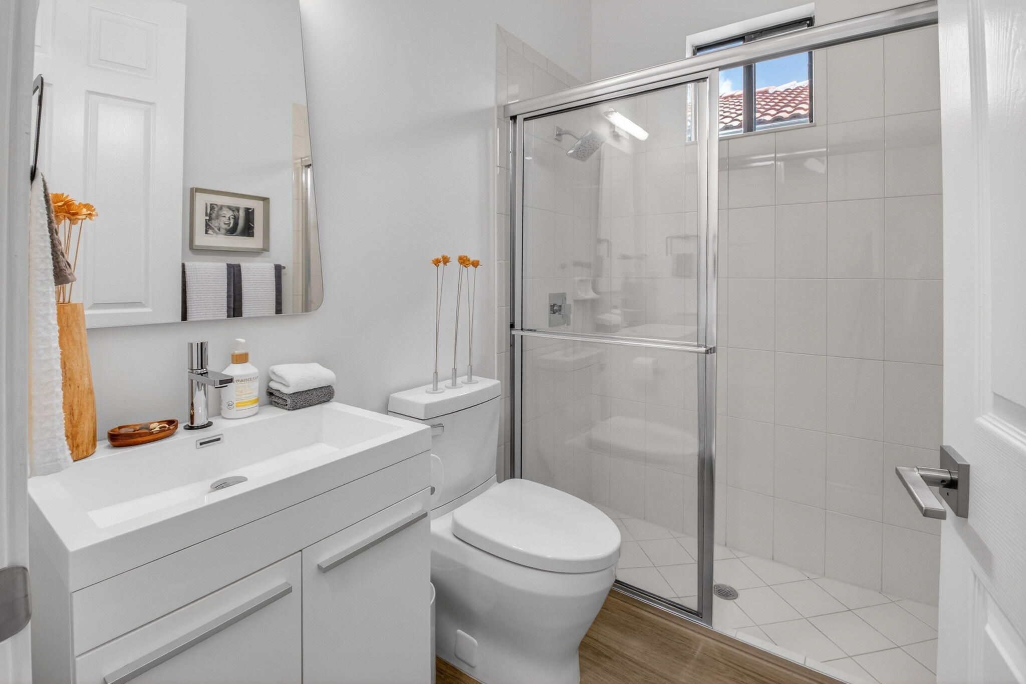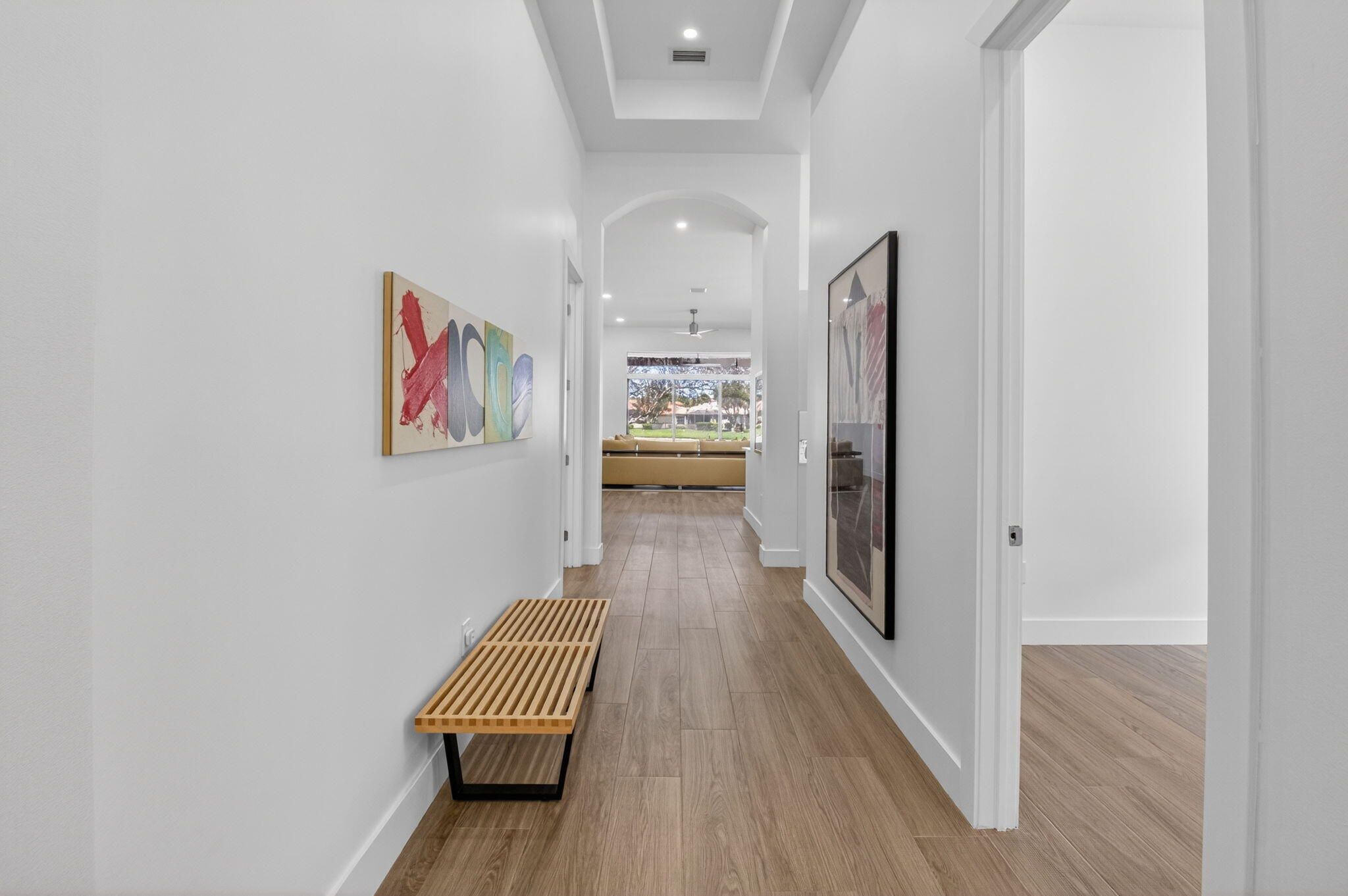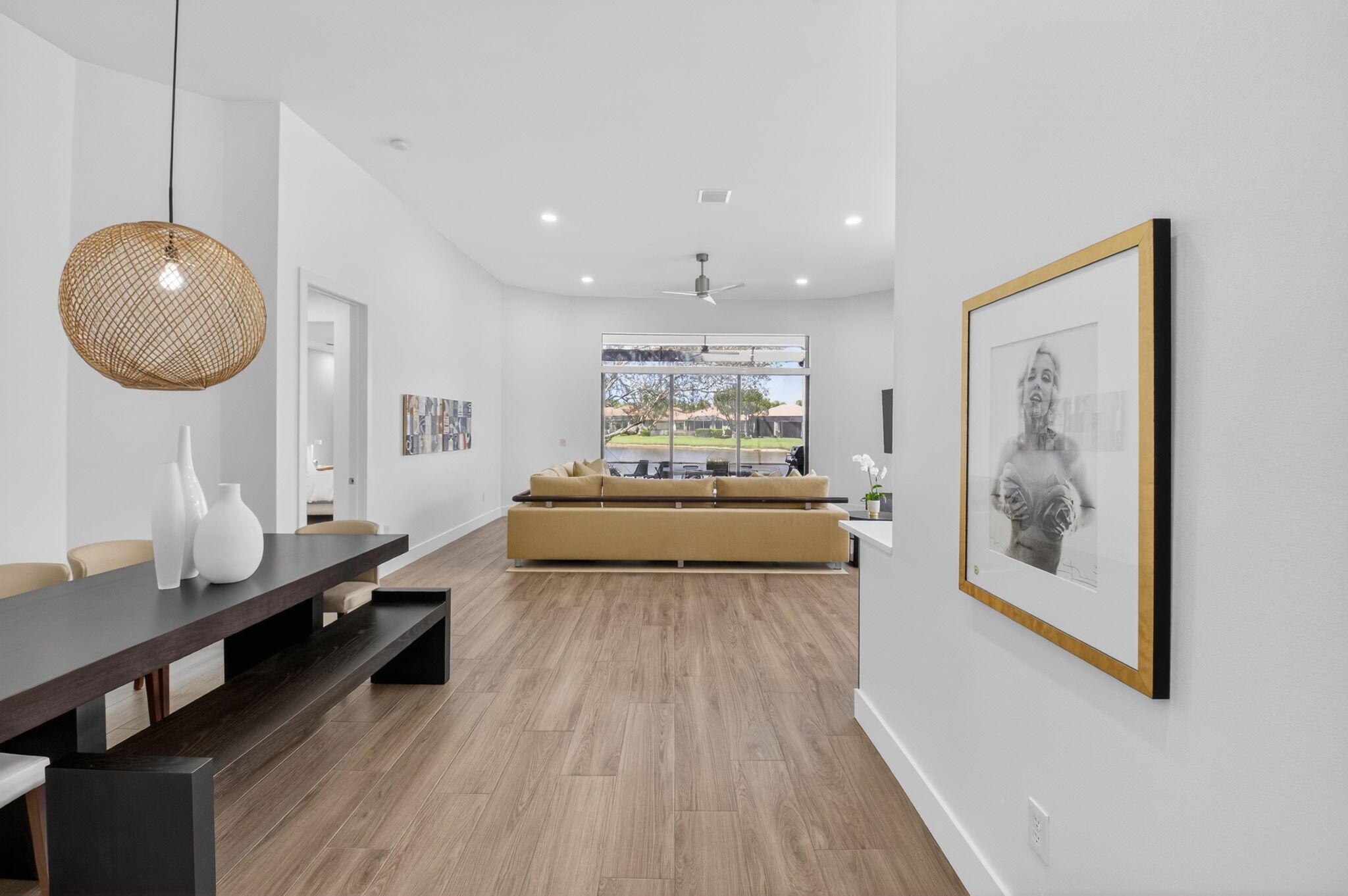This amazing lake view, 3 bedroom, 2 bath Great Room home has been renovated with high end materials and lots of love and attention. The kitchen is a chef's dream with quartz counters and backsplash, a stainless steel appliance package, including french door refrigerator, wall oven/microwave and lots of storage with not one but two pantries. The floors in the living areas, front bedroom and den are wood plank look porcelain tile giving the taste of elegance throughout the home. The primary suite has generous space for any size bedroom set and two walk in closets that have been smartly designed for maximum space. The beautifully renovated primary bathroom features dual vanities, a luxurious soaking tub, and a separate glass-enclosed shower. Thoughtfully updated with modern finishes, it offers both style and functionality for a spa-like retreat. The expansive screened lanai showcases beautiful lake views and creates the perfect backdrop for quiet relaxation or memorable gatherings with family and friends. The 3rd bedroom is used as a den and doesn't have a closet. Four Seasons at Delray Beach provides many amenities and clubs. Among the amenities include a recently renovated clubhouse featuring a grand gathering room, multiple card rooms, a catering kitchen and a beautiful ballroom featuring a performance stage and dance floor. The sports center will provide you with a state of the art fitness center, har-tru tennis courts, pickleball courts, table tennis and bocce. Close to the Delray Marketplace and the popular downtown area of Atlantic Avenue, Four Seasons at Delray Beach is the perfect place and location to call home.