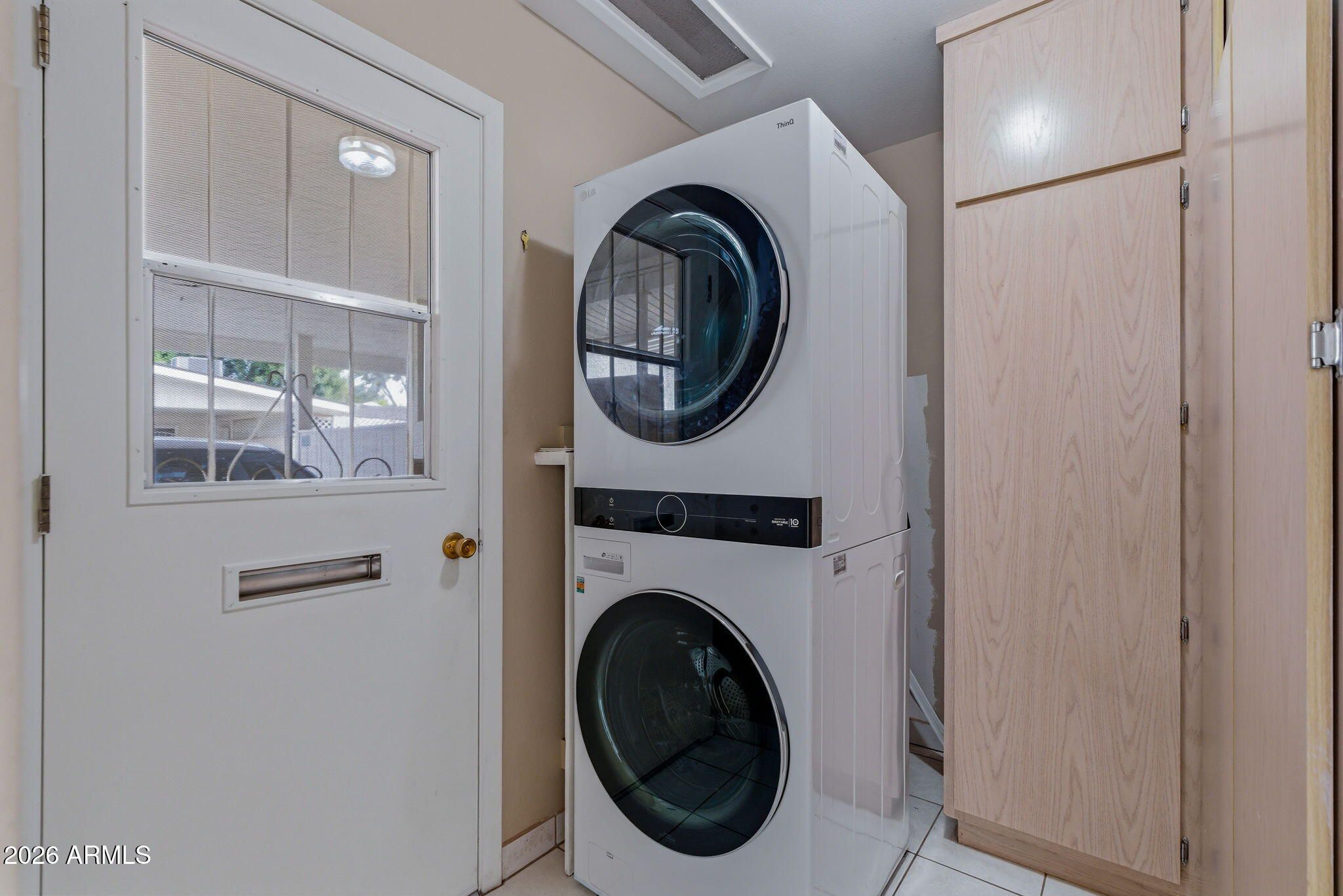 - Stacked Washer/Dryer, Dryer, Washer, Refrigerator, Built-in Microwave, Dishwasher, Disposal, Electric Range