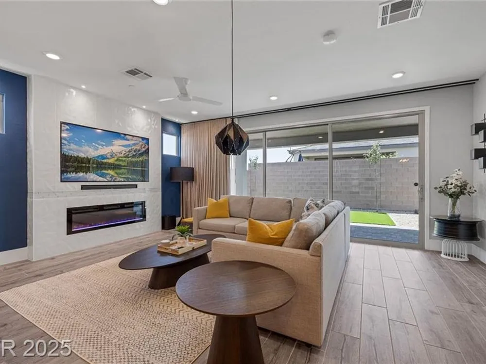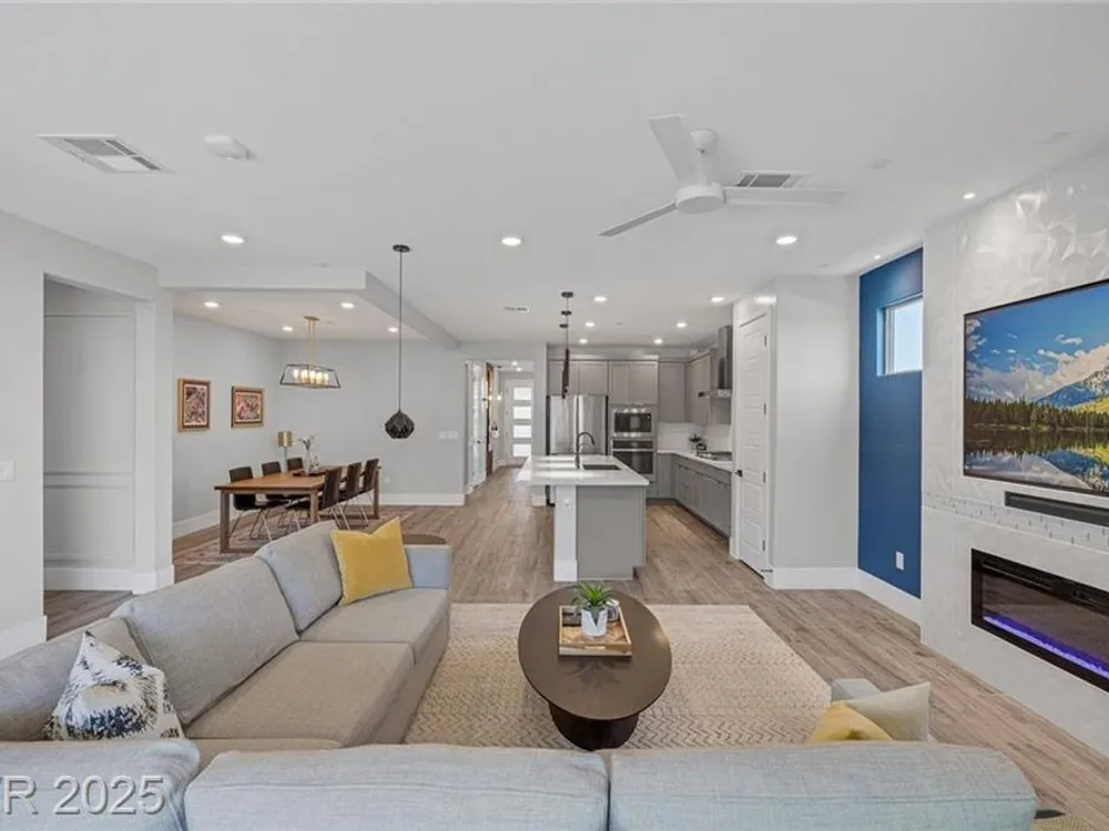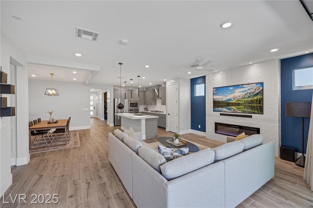 Resort-Style Living Meets Modern Elegance! This immaculate, highly upgraded single-story home in guard-gated community of Trilogy offers 1,811 sqft of effortless luxury on a premium corner lot. Designer features include tray ceilings, wainscoting, custom curtains & lighting throughout. The open-concept great room boasts a 15’ multi- glass slider leading to your extended covered patio & private backyard perfect for entertaining. The chef’s kitchen showcases a large island, modern cabinets, white quartz counters, backsplash, & stainless appliances. The primary suite offers a spa-like bath w/ walk-in shower & dual sinks. Two guest rooms + den featuring custom dry bar & mini fridge. Smart home upgrades include a tankless water heater, pre-wired surround sound, & built-in fireplace w/ soundbar. The garage is a showstopper w/ Hex LED lighting, 240V outlet, & service door. Enjoy world-class amenities at Cabochon Club: wine bar, fitness center, pickleball, heated pool, & social events galore!