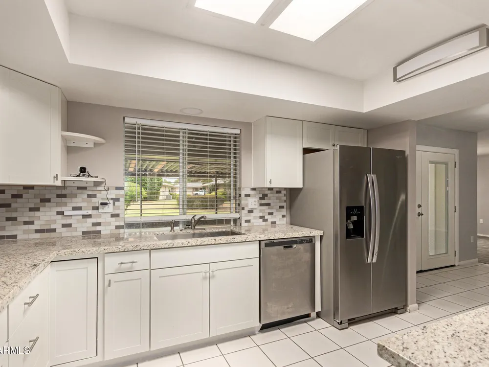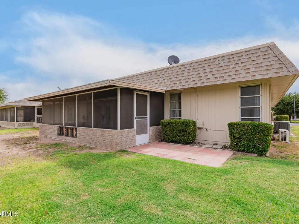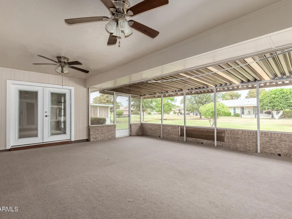 Welcome to this beautifully updated Gemini/Twin home in the heart of Sun City! Offering over 1,600 sq.ft. of comfortable living, this 2-bedroom, 2-bathroom residence features a spacious layout with high ceilings, warm-toned interior paint, stylish plank flooring and multiple sets of French doors for a light and airy feel. The updated kitchen boasts granite countertops, stainless steel appliances, skylights, and crisp white cabinetry. The primary suite offers a private retreat with an en-suite bathroom and a beautifully tiled shower. Relax in the large screened-in Arizona room, perfect for enjoying the outdoors year-round. Complete with an indoor laundry room and two-car garage, this home is move-in ready. Just around the corner from Palmbrook Golf Club, you'll also enjoy all the world-class amenities that Sun City living has to offer!